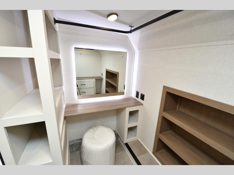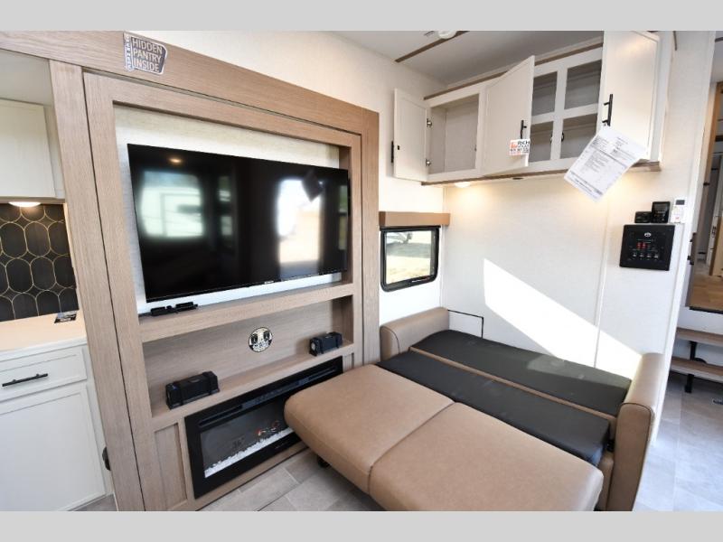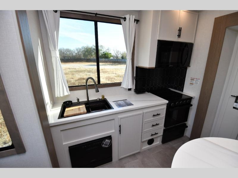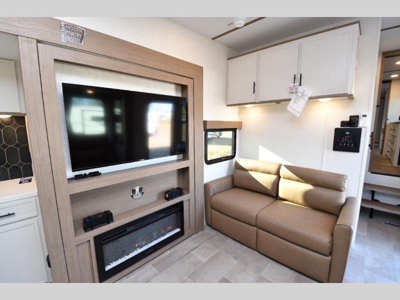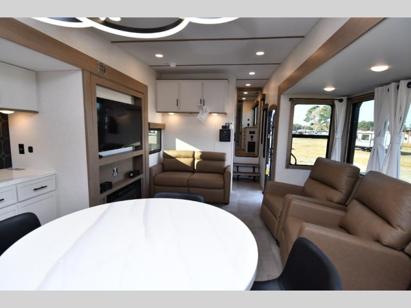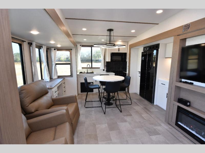 Step inside the 360MYR and feel at home on the road. Dual recliners and a desk make work or relaxation easy. The rear kitchen boasts a 16 cu. ft. 12V refrigerator, oven, pantry, and plenty of counter space for meals and entertaining. Dual opposing slides open the main living area, and the entertainment center offers hidden storage to keep things tidy.