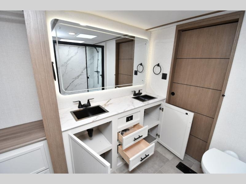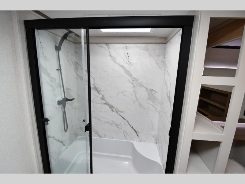 The master suite features a king bed with Versa Tilt technology, dresser, TV prep, and a front bath with dual sinks, walk-in shower with skylight, and closet with shelves. A middle half bath includes washer/dryer, extra counter space, and shelving for essentials. Outside, enjoy two power awnings, an enclosed docking station, outside shower, and a 100W roof panel for off-grid adventures.