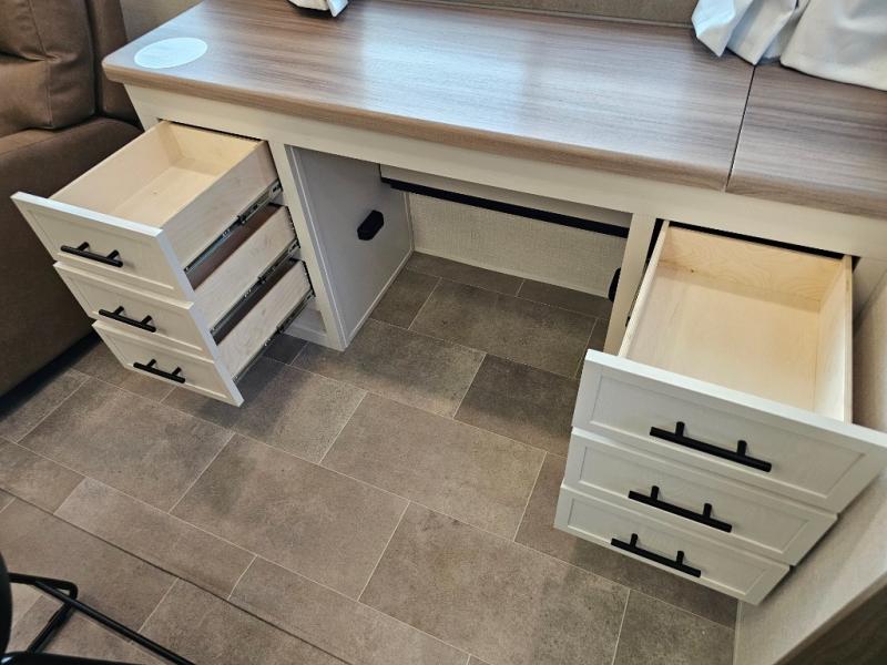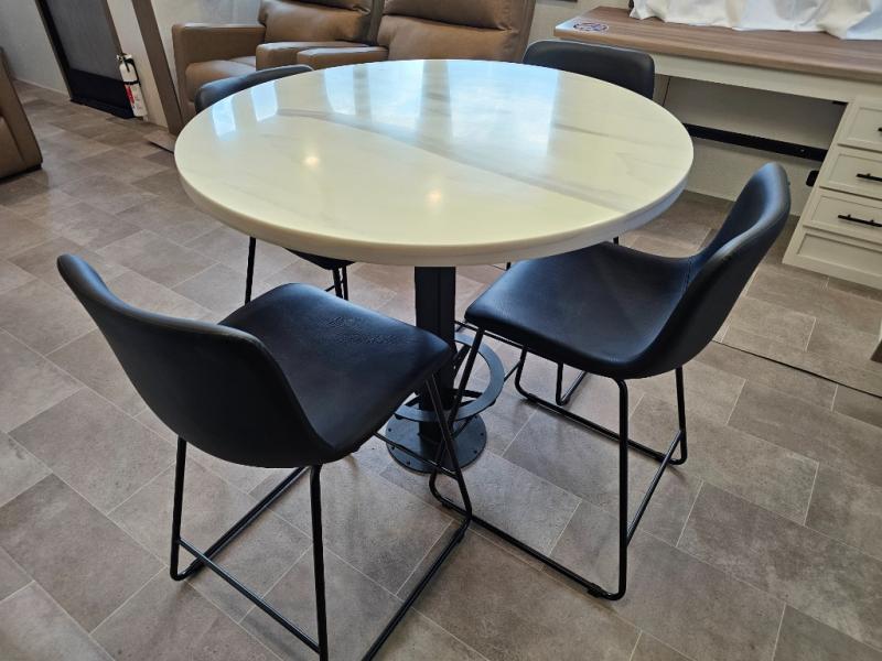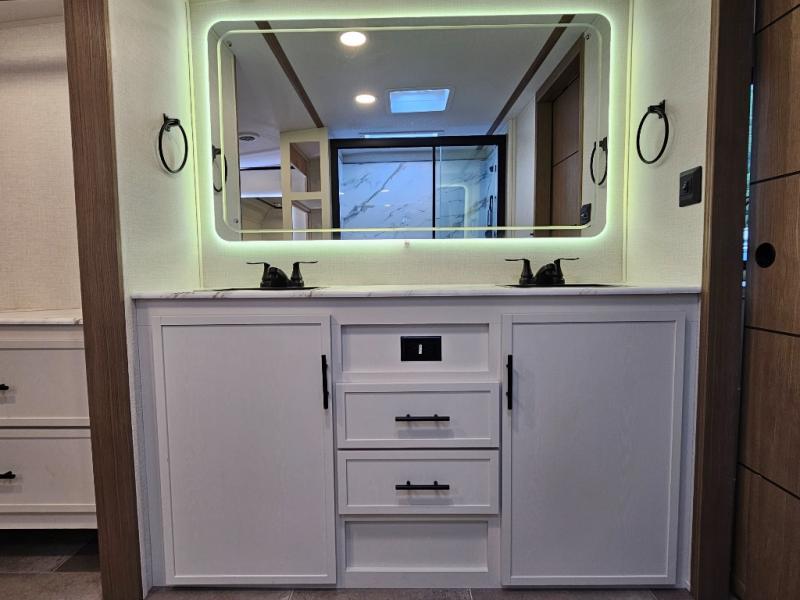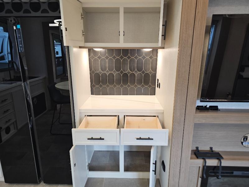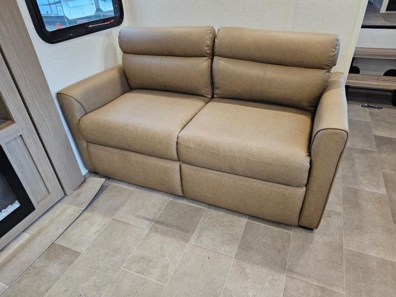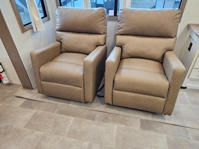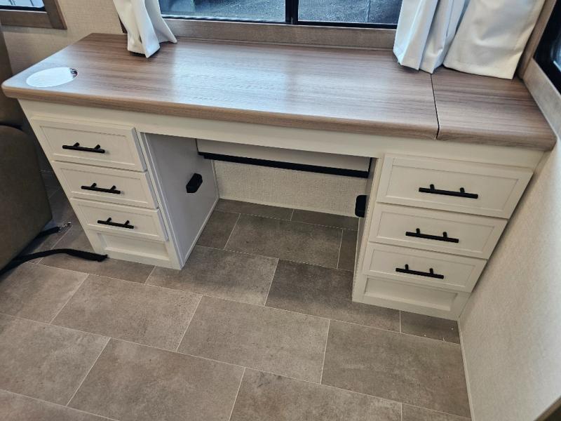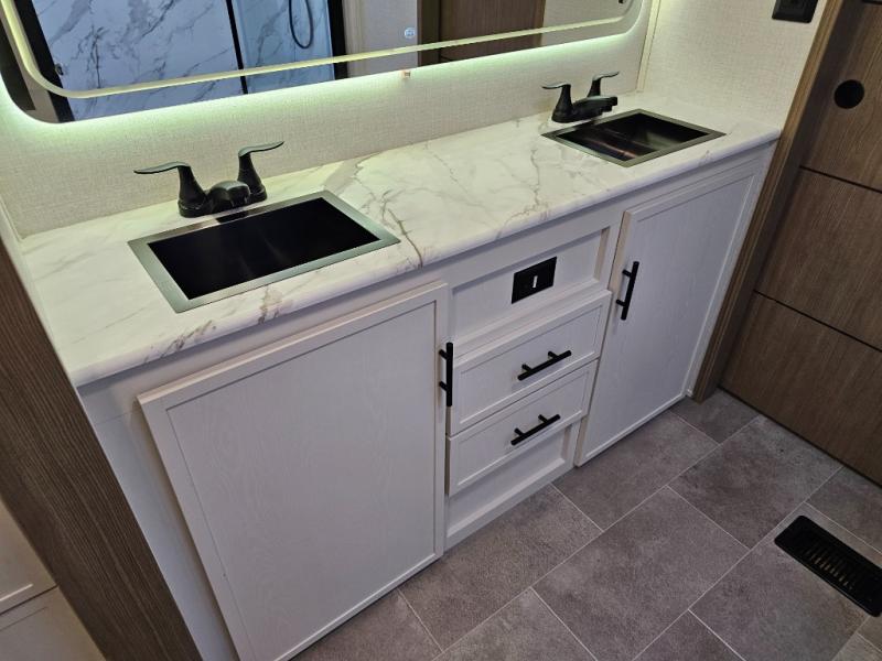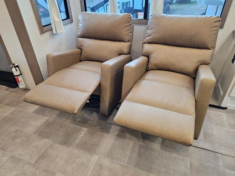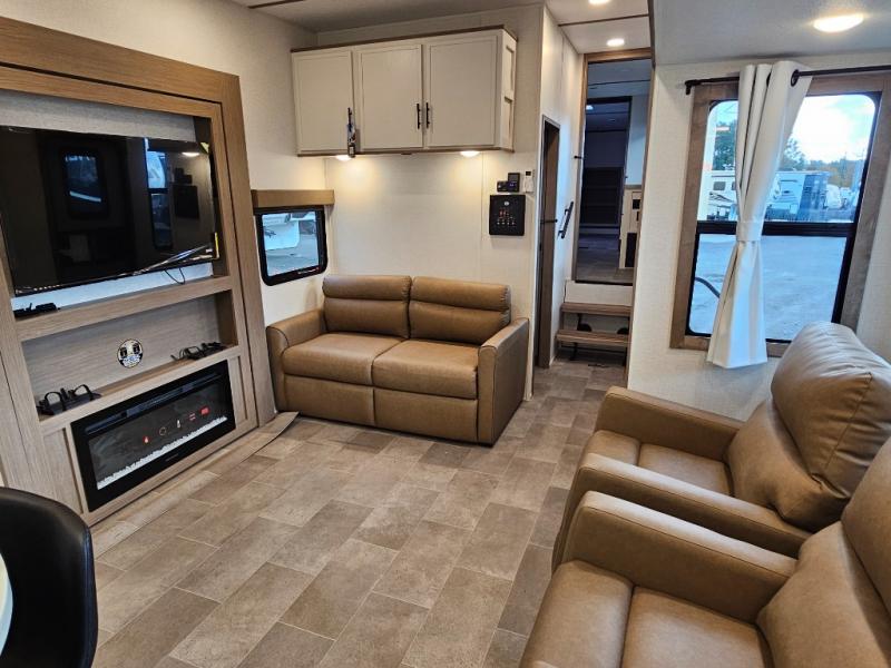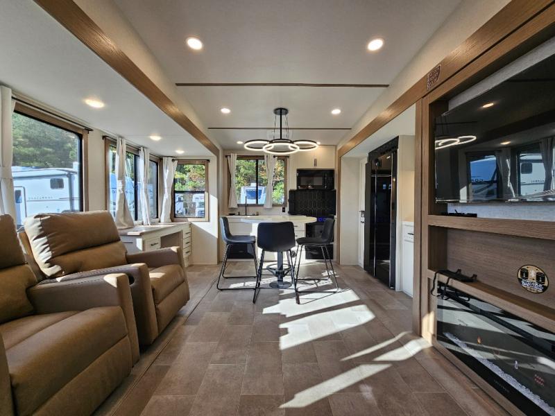 The 360MYR is designed for those who want the comforts of home wherever they travel. With a private bedroom suite, a bath and a half, a spacious rear kitchen, and a dedicated workspace, this floorplan checks every box for luxury, practicality, and long-term comfort on the road.