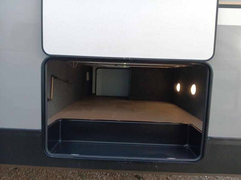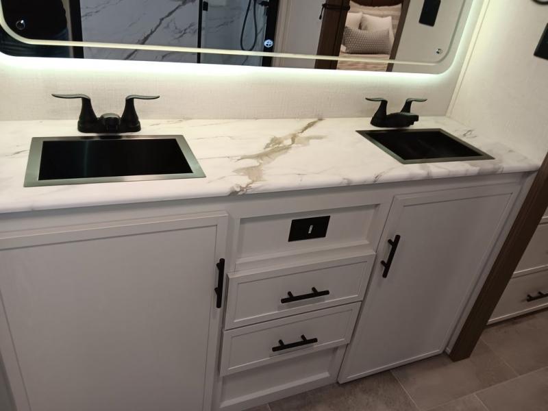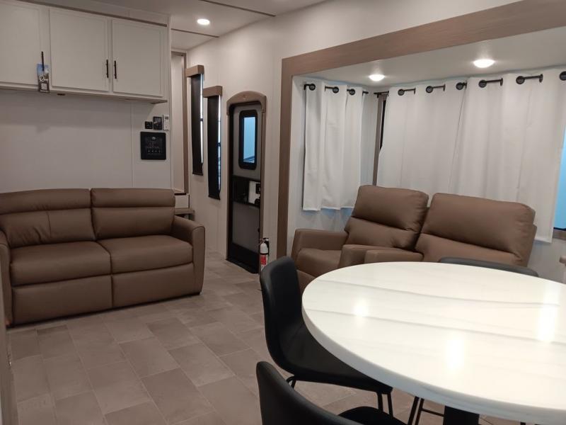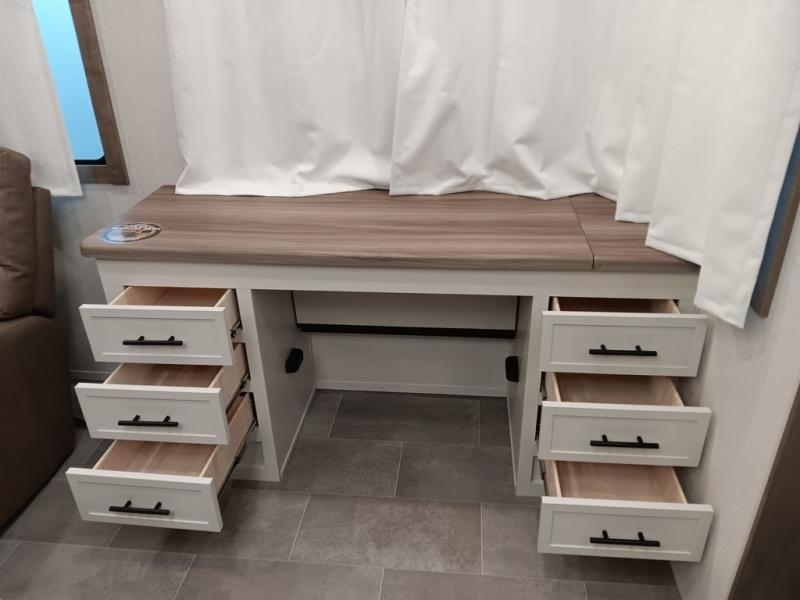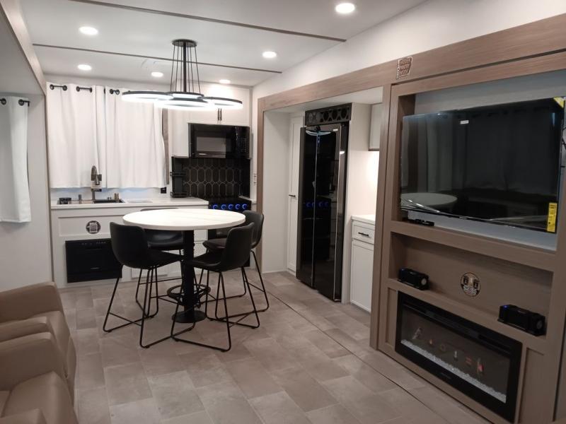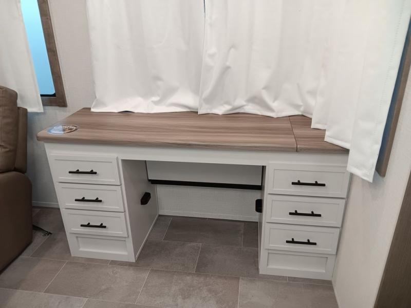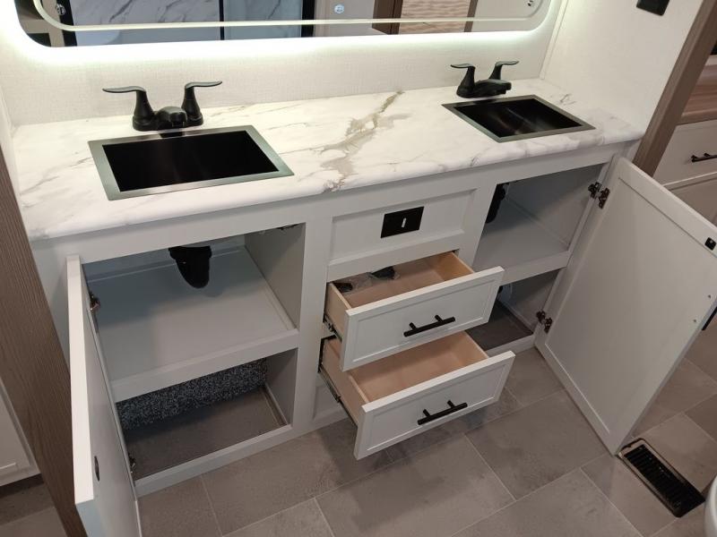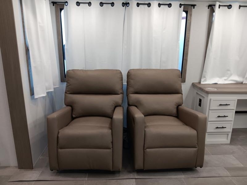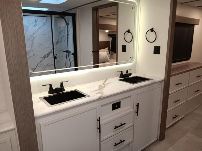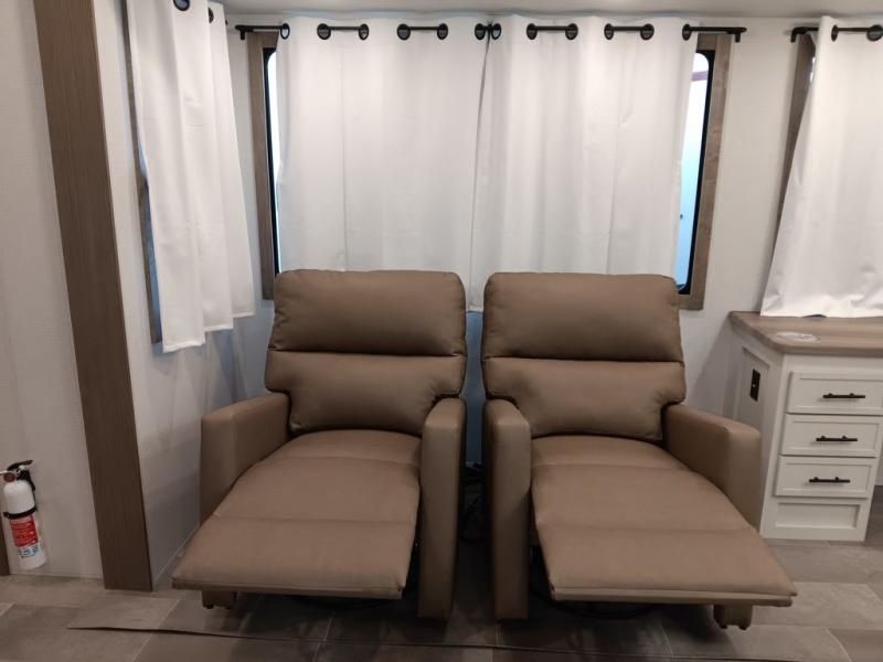 There are many residential features in this 360MYR model, such as a middle table with four seats, dual recliners, a desk to get some work done, and a master bedroom you are sure to love. You'll find a king bed with Versa Tilt technology, a dresser, and TV prep. A front master bath includes a walk-in shower with a skylight, dual bath sinks with a back-lit mirror, and a closet with shelves. The middle half bath includes washer/dryer prep, counter space and a shelf for all your essentials, clothes, and gear. Everyone will enjoy spending time in the main living room that includes dual opposing slides, a tri-fold sofa, and an entertainment center with hidden storage behind. And the chef of your group will love the rear kitchen with its 16 cu. ft. 12V refrigerator and pantry, an oven, and plenty of counter space. Head outdoors to enjoy the two power awnings in the evening!