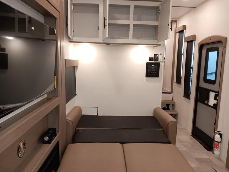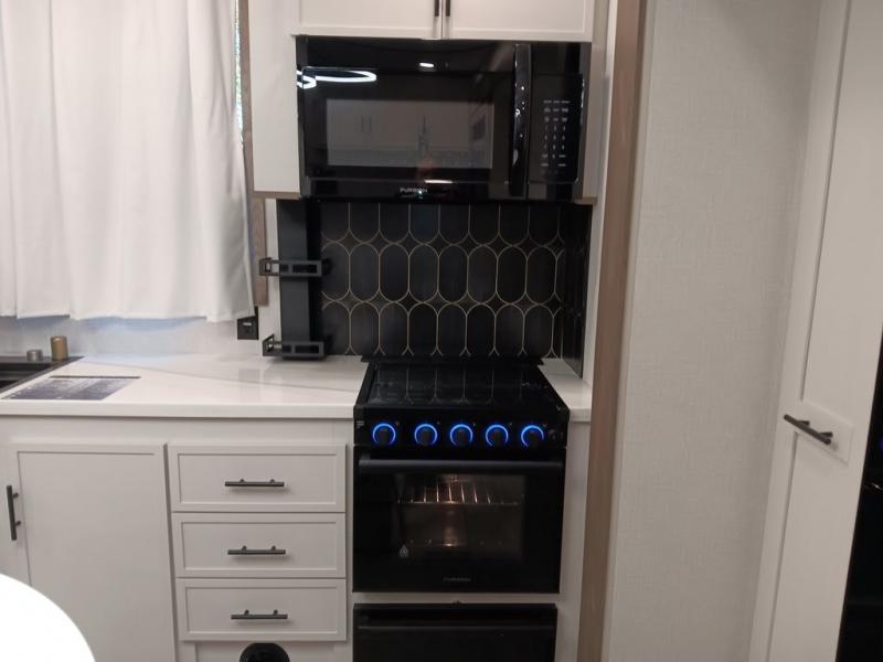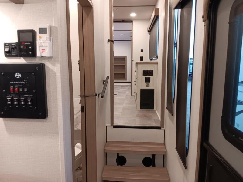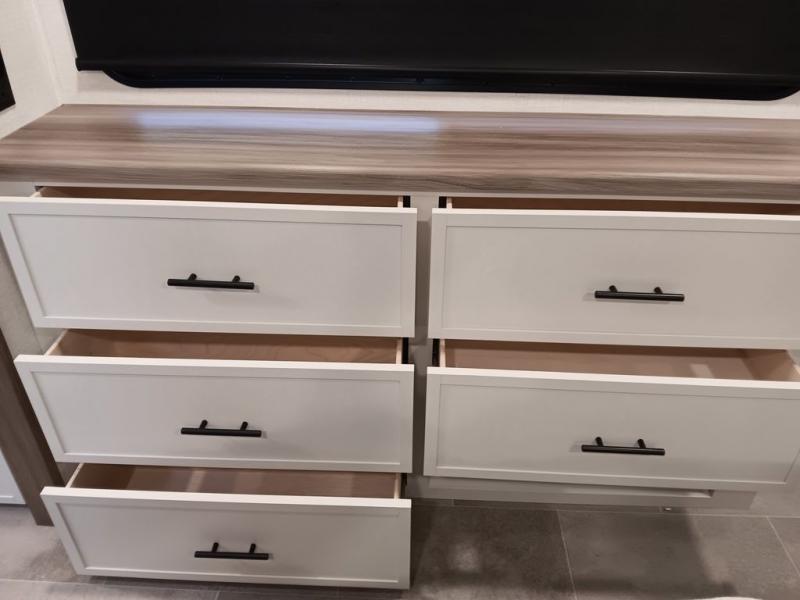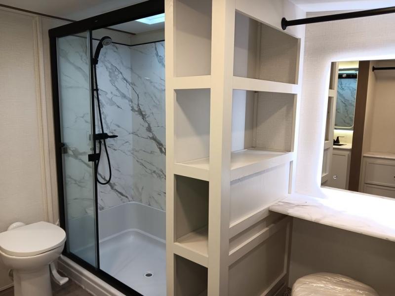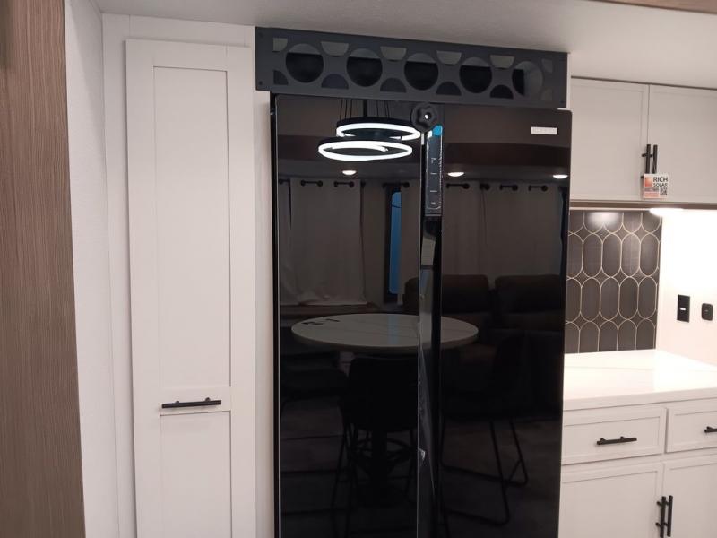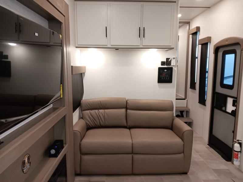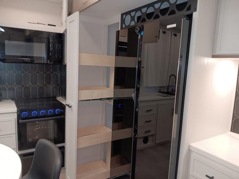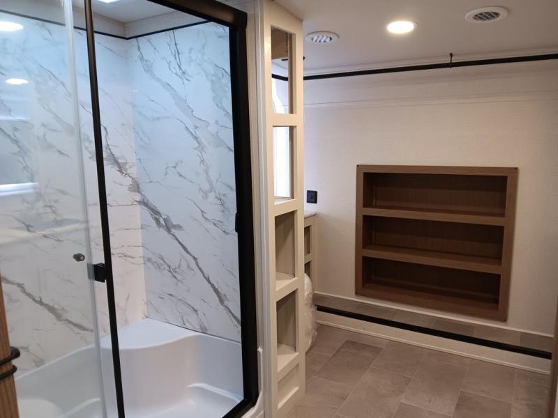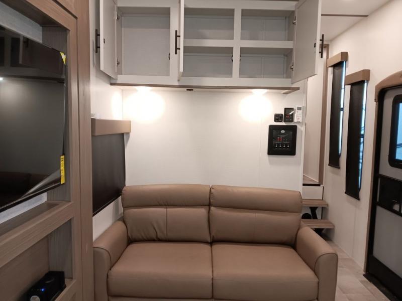 There are many residential features in this 360MYR model, such as a middle table with four seats, dual recliners, a desk to get some work done, and a master bedroom you are sure to love. You'll find a king bed with Versa Tilt technology, a dresser, and TV prep. A front master bath includes a walk-in shower with a skylight, dual bath sinks with a back-lit mirror, and a closet with shelves. The middle half bath includes washer/dryer prep, counter space and a shelf for all your essentials, clothes, and gear. Everyone will enjoy spending time in the main living room that includes dual opposing slides, a tri-fold sofa, and an entertainment center with hidden storage behind. And the chef of your group will love the rear kitchen with its 16 cu. ft. 12V refrigerator and pantry, an oven, and plenty of counter space. Head outdoors to enjoy the two power awnings in the evening!
