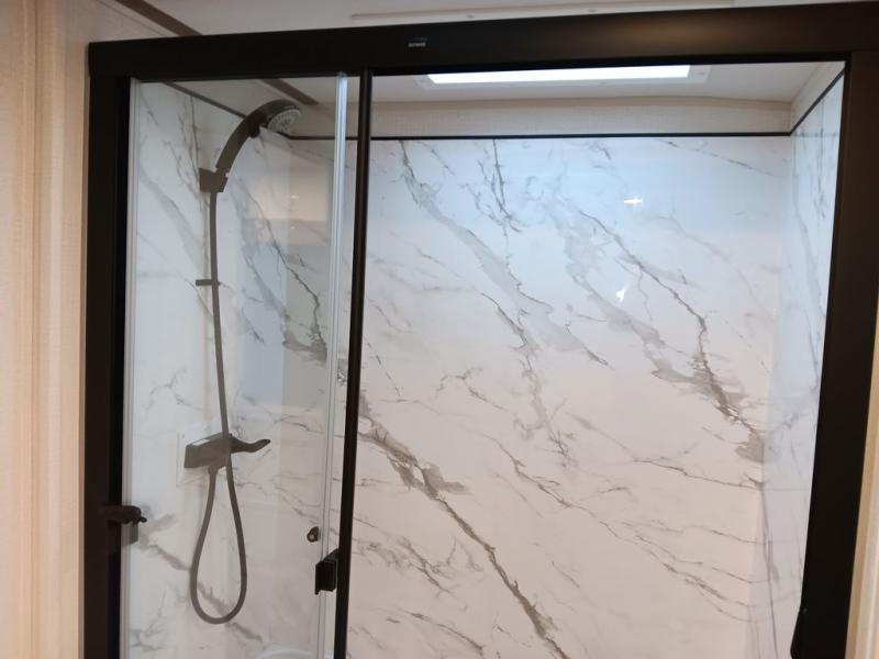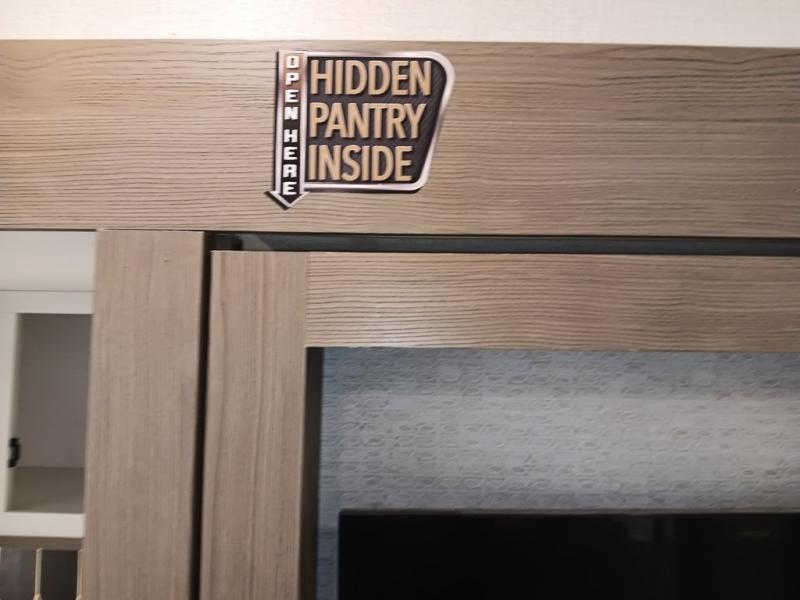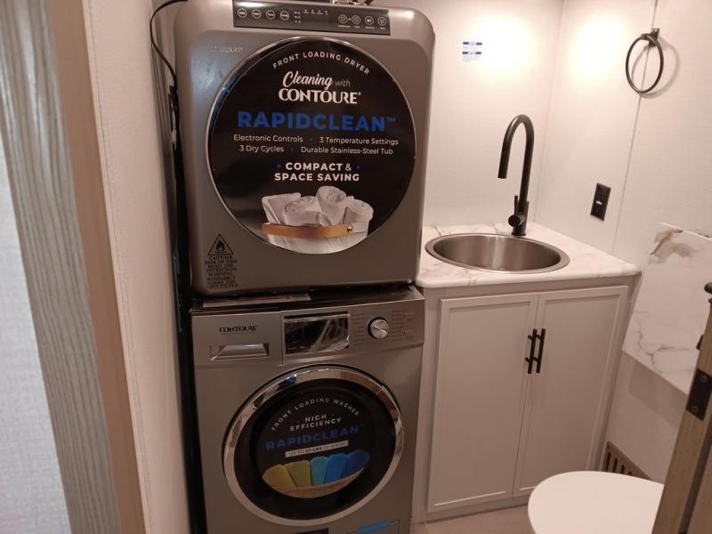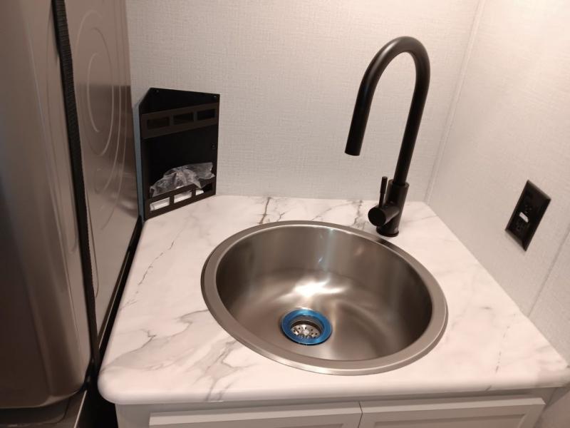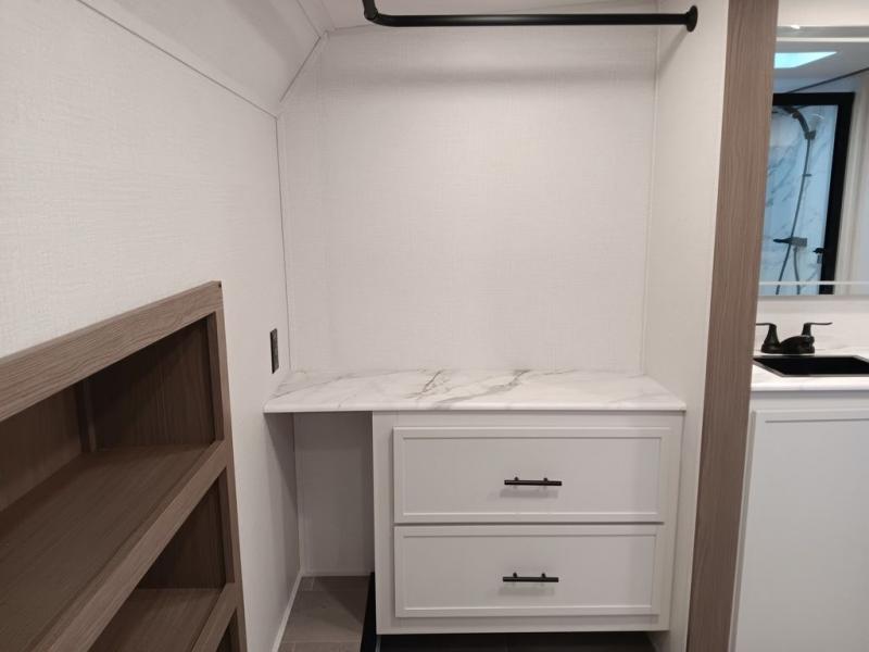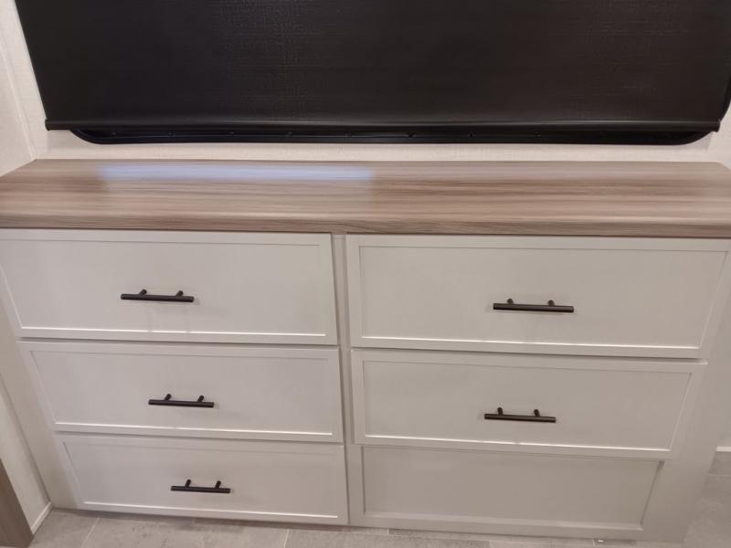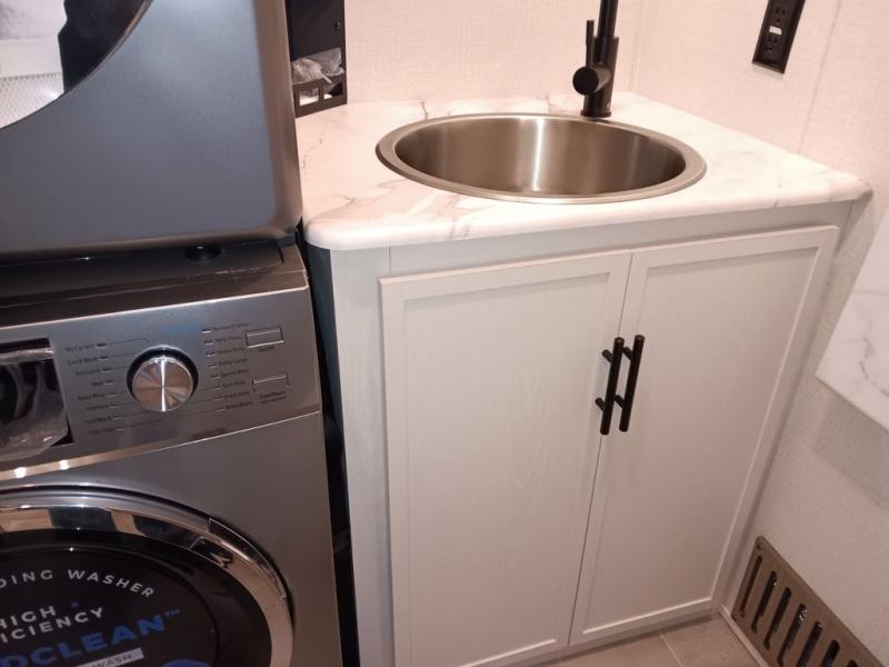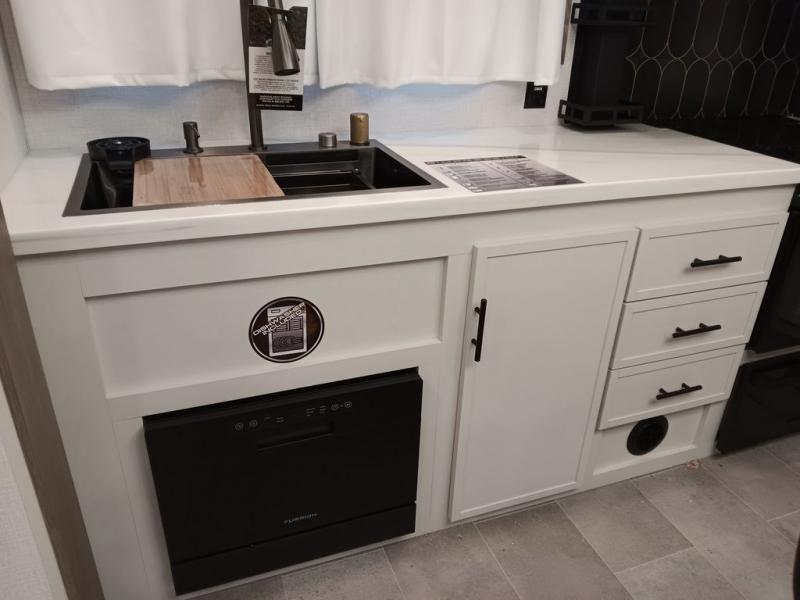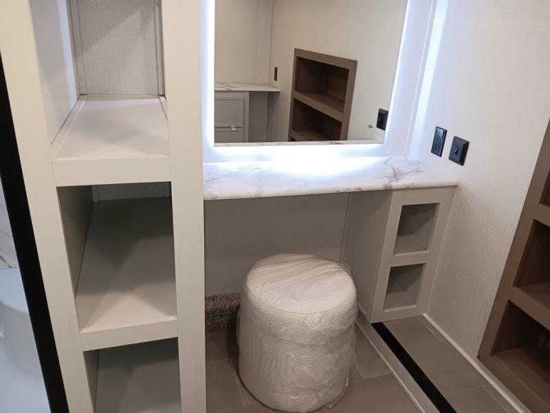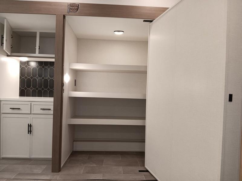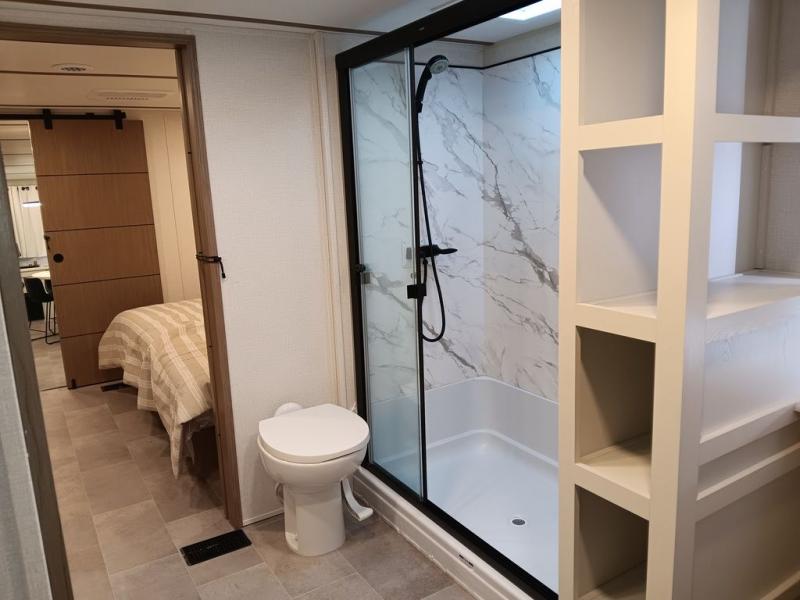 There are many residential features in this 360MYR model, such as a middle table with four seats, dual recliners, a desk to get some work done, and a master bedroom you are sure to love. You'll find a king bed with Versa Tilt technology, a dresser, and TV prep. A front master bath includes a walk-in shower with a skylight, dual bath sinks with a back-lit mirror, and a closet with shelves. The middle half bath includes washer/dryer prep, counter space and a shelf for all your essentials, clothes, and gear. Everyone will enjoy spending time in the main living room that includes dual opposing slides, a tri-fold sofa, and an entertainment center with hidden storage behind. And the chef of your group will love the rear kitchen with its 16 cu. ft. 12V refrigerator and pantry, an oven, and plenty of counter space. Head outdoors to enjoy the two power awnings in the evening!