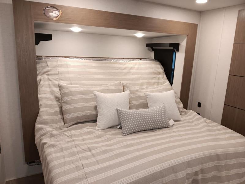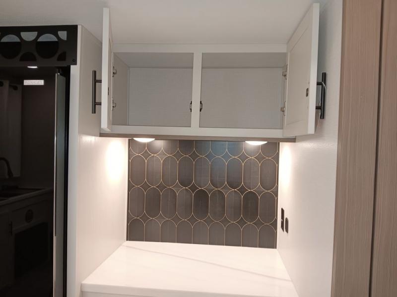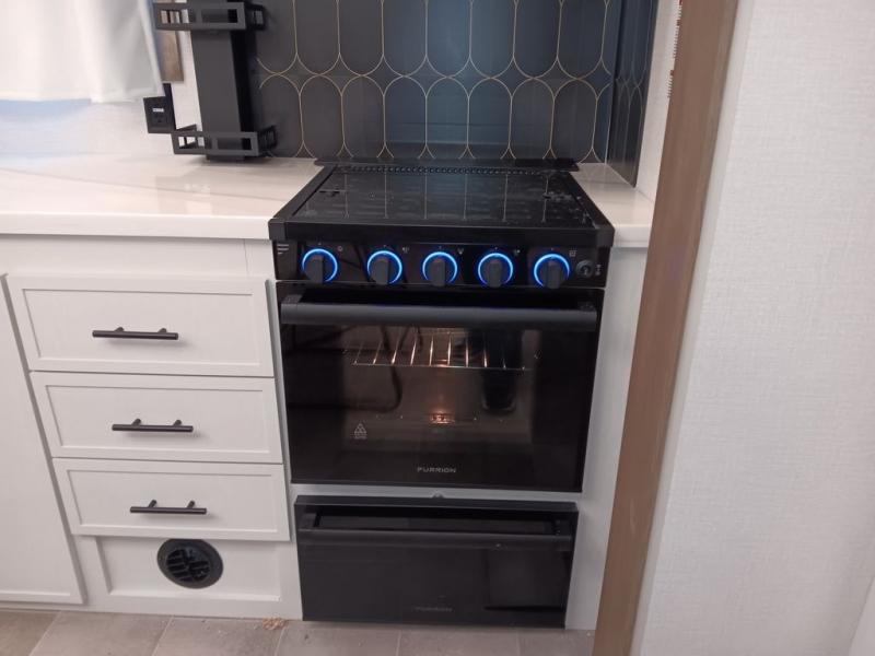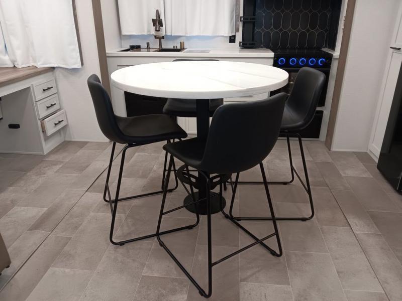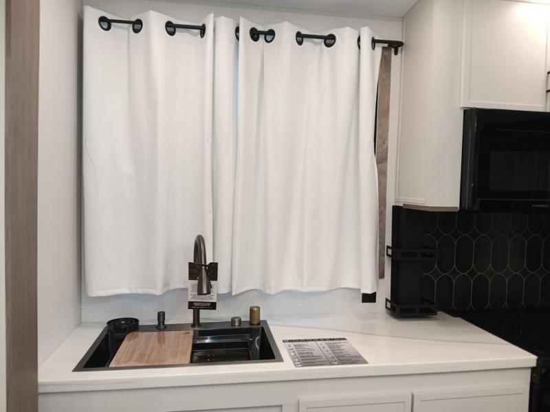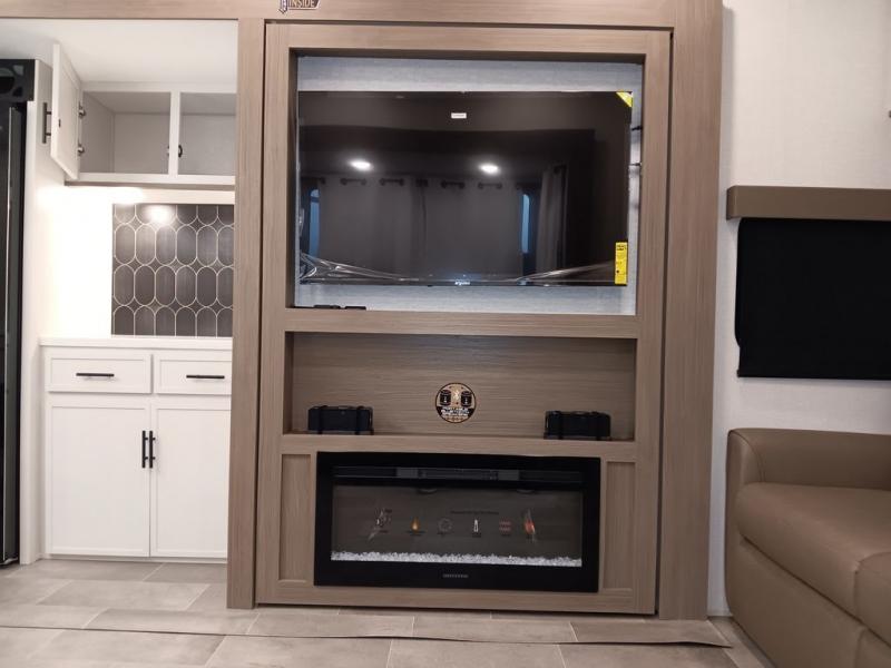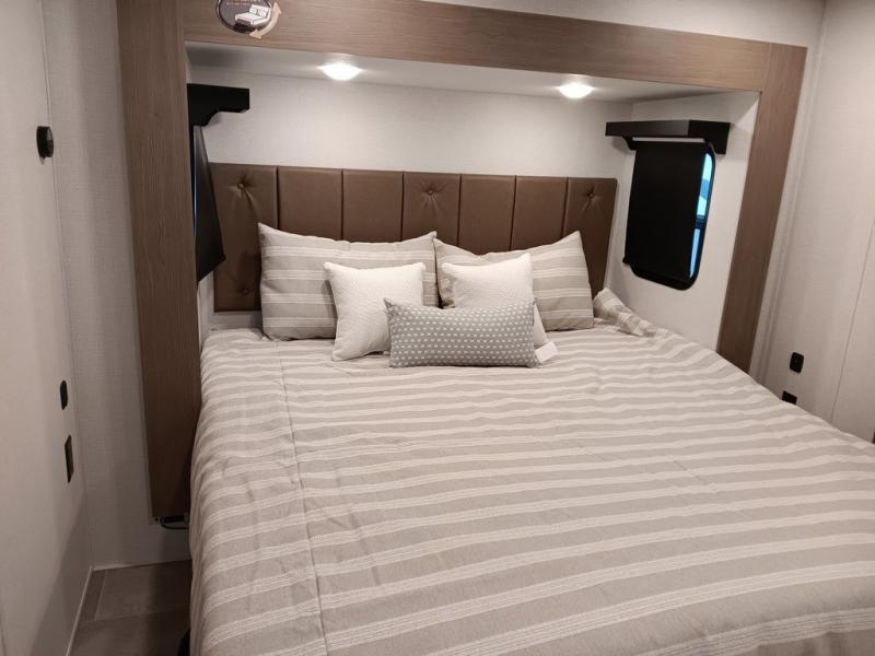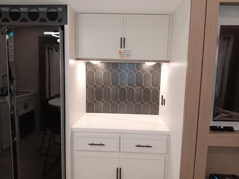 With any Impression fifth wheel by Forest River, the focus of the design is comfort and value, built with quality craftsmanship and attention to customer's desires in each Impression! The exterior includes upgraded E-rated tires, custom exterior graphics package, and insulated slam latch baggage doors. There is also an enclosed docking station, an outside shower, and a 100W roof panel for off-grid capabilities. The fully heated and enclosed AccessiBelly has removable underbelly panels along with enclosed tank valves. There is an industry leading 15K A/C plus 35K BTU furnace to keep you comfortable. The interior has lumbercore cabinetry, residential linoleum, residential backsplash in the kitchen, and oversized opening windows in the living area for more natural lighting and good air flow.
