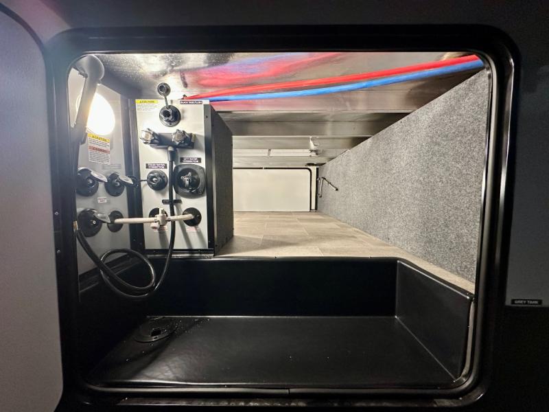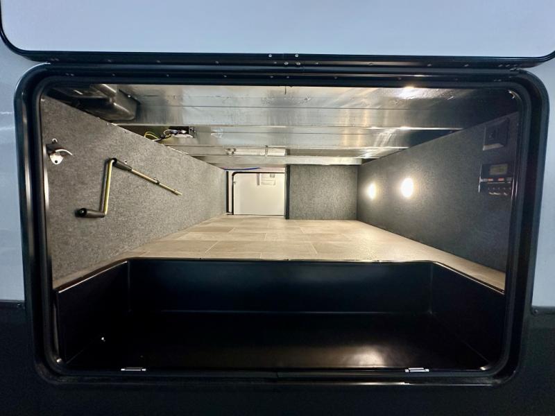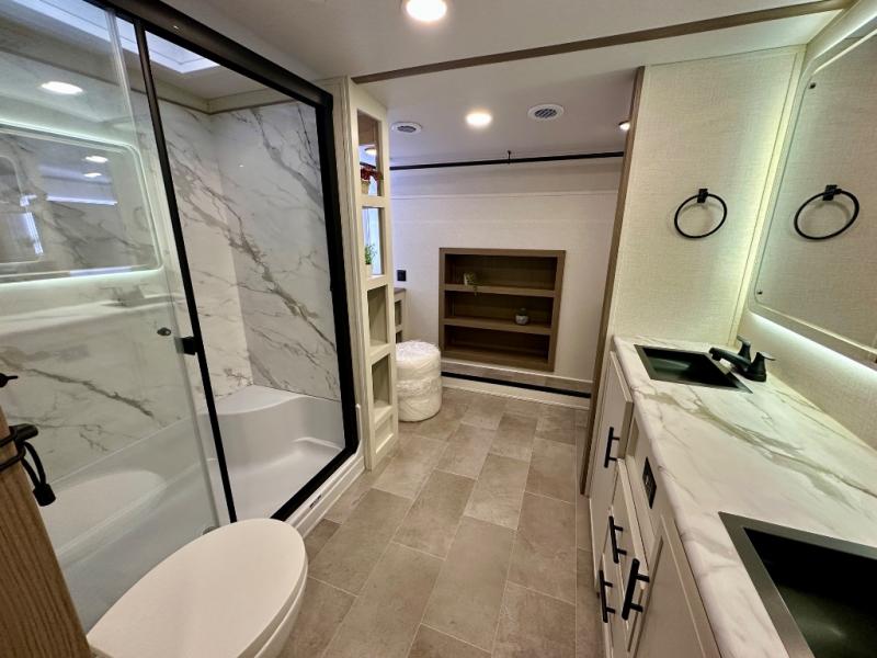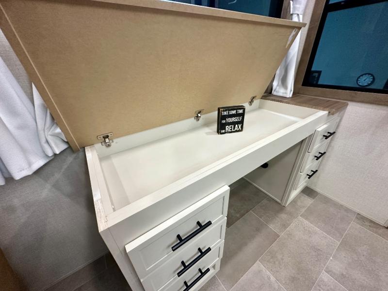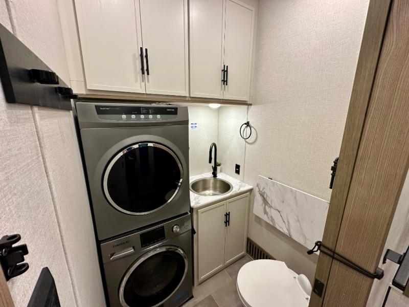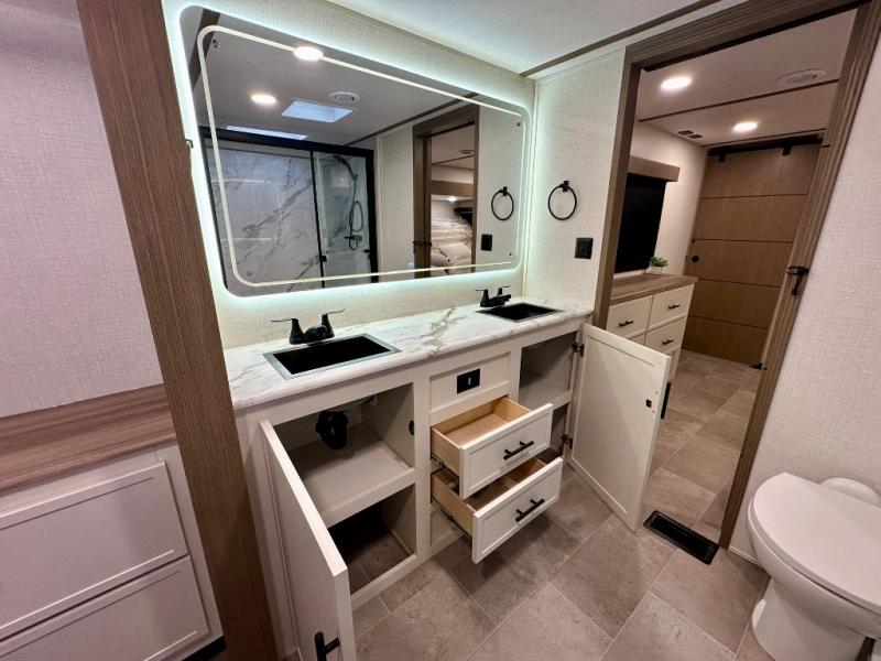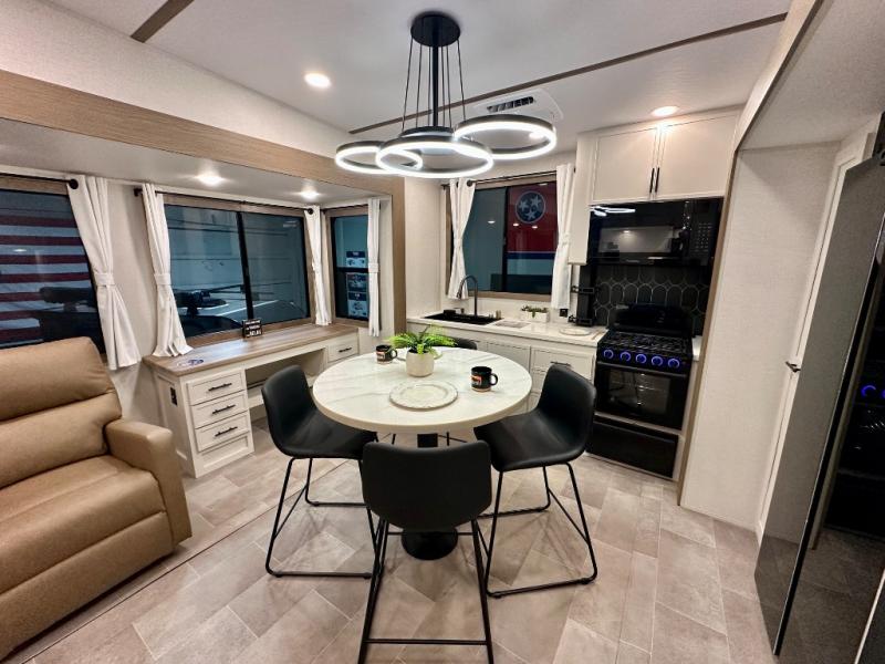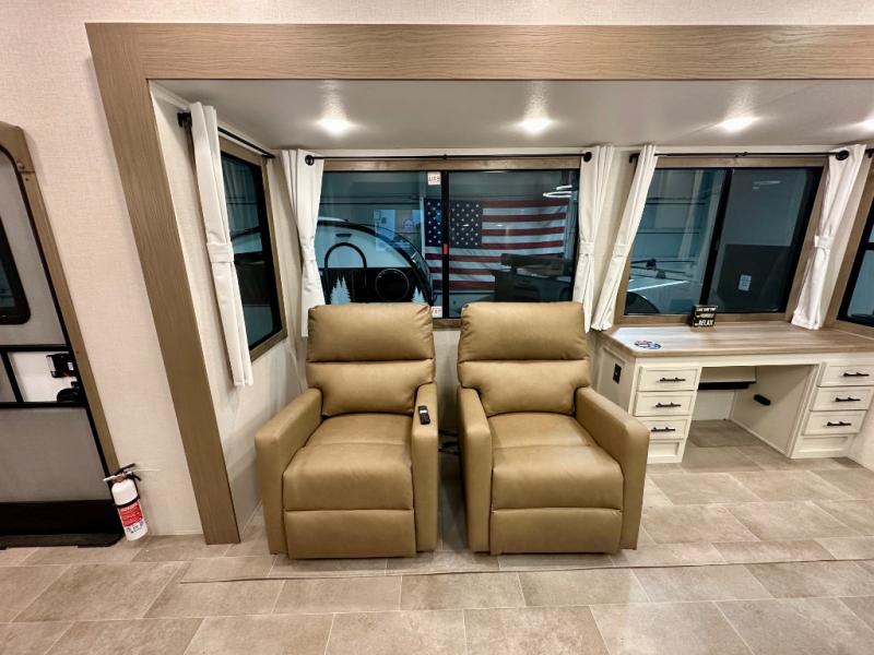 There are many residential features in this 360MYR model, such as a middle table with four seats, dual recliners, a desk to get some work done, and a master bedroom you are sure to love. You'll find a king bed with Versa Tilt technology, a dresser, and TV prep. A front master bath includes a walk-in shower with a skylight, dual bath sinks with a back-lit mirror, and a closet with shelves. The middle half bath includes washer/dryer prep, counter space and a shelf for all your essentials, clothes, and gear. Everyone will enjoy spending time in the main living room that includes dual opposing slides, a tri-fold sofa, and an entertainment center with hidden storage behind. And the chef of your group will love the rear kitchen with its 16 cu. ft. 12V refrigerator and pantry, an oven, and plenty of counter space. Head outdoors to enjoy the two power awnings in the evening!
