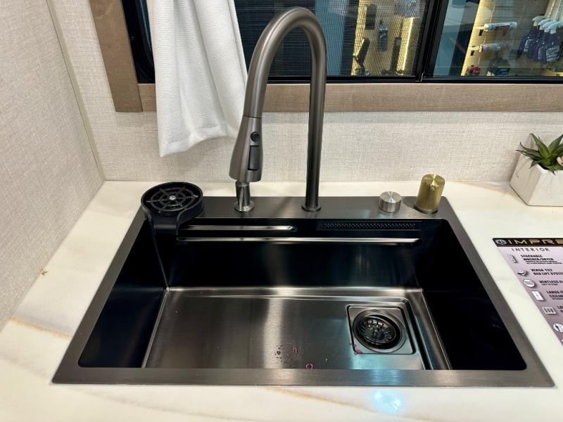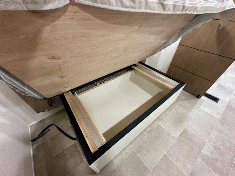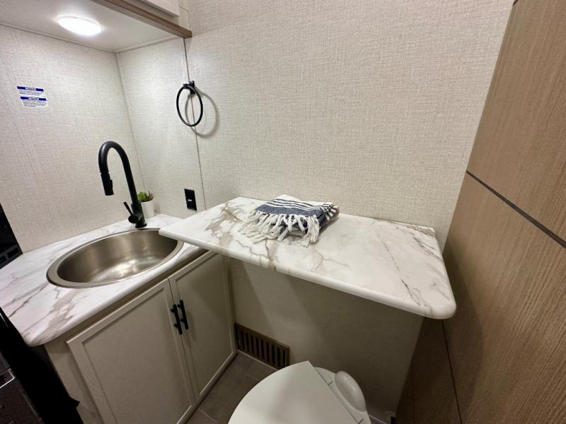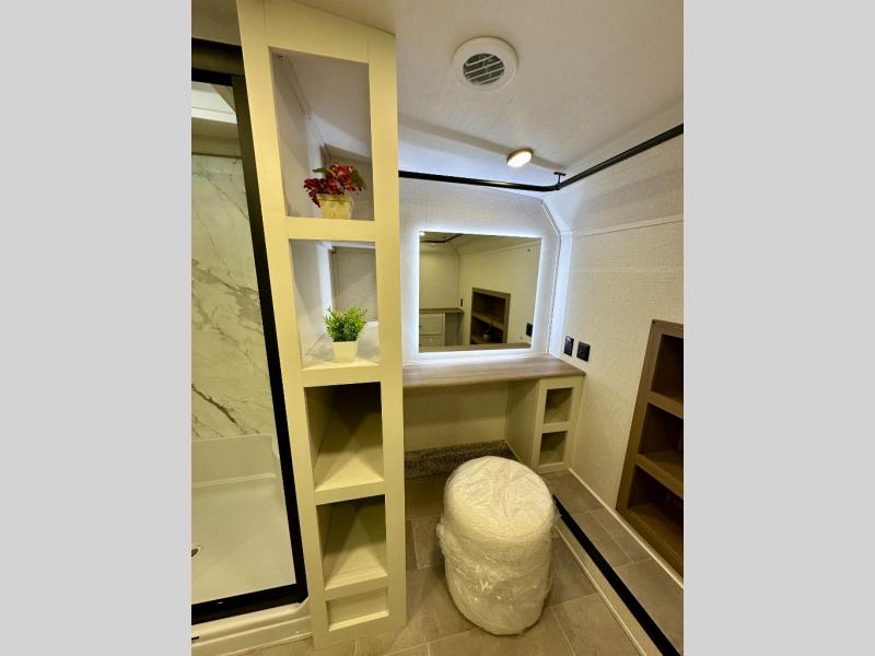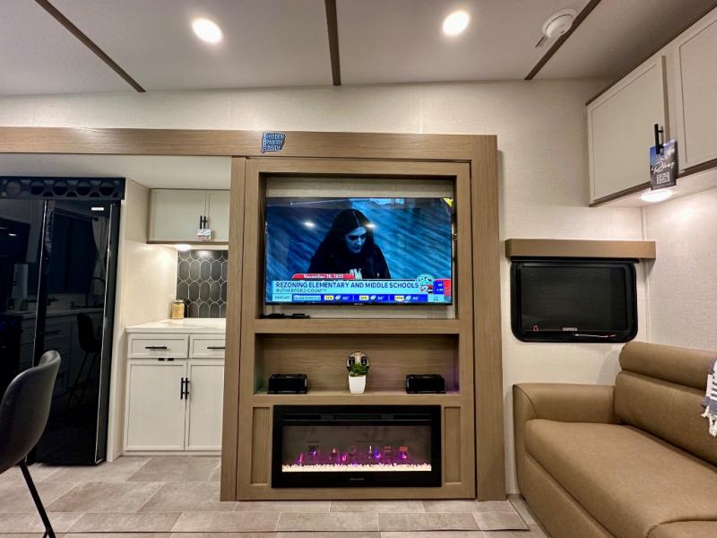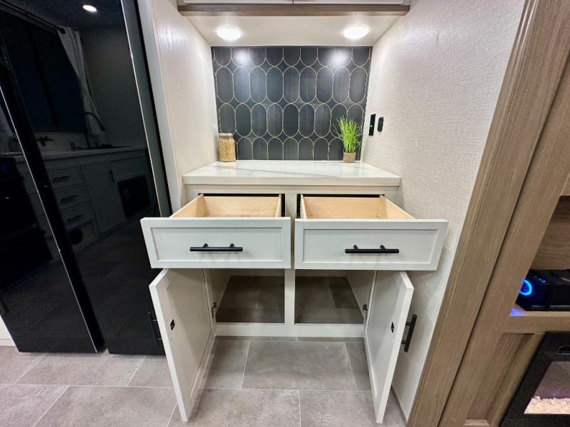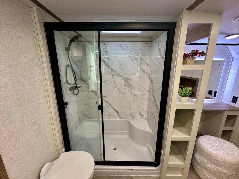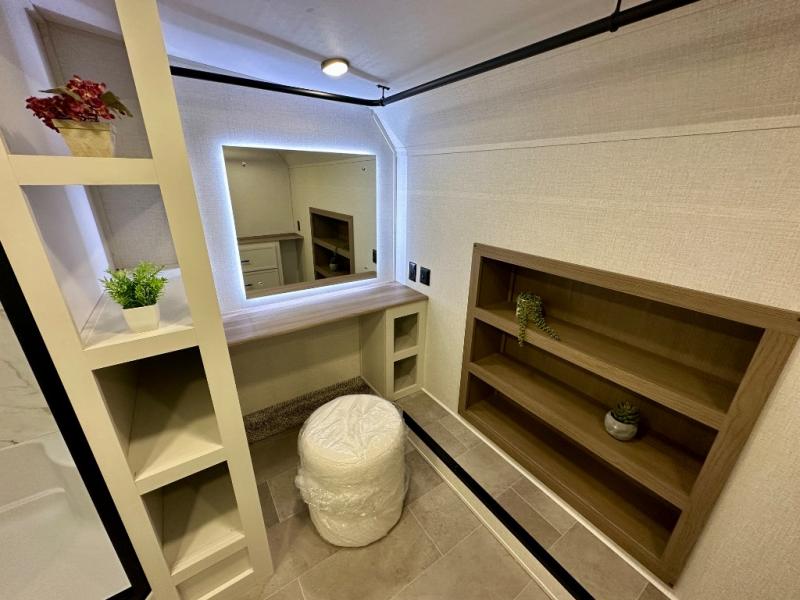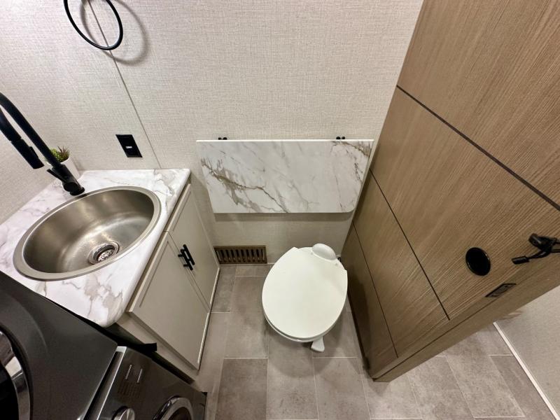 There are many residential features in this 360MYR model, such as a middle table with four seats, dual recliners, a desk to get some work done, and a master bedroom you are sure to love. You'll find a king bed with Versa Tilt technology, a dresser, and TV prep. A front master bath includes a walk-in shower with a skylight, dual bath sinks with a back-lit mirror, and a closet with shelves. The middle half bath includes washer/dryer prep, counter space and a shelf for all your essentials, clothes, and gear. Everyone will enjoy spending time in the main living room that includes dual opposing slides, a tri-fold sofa, and an entertainment center with hidden storage behind. And the chef of your group will love the rear kitchen with its 16 cu. ft. 12V refrigerator and pantry, an oven, and plenty of counter space. Head outdoors to enjoy the two power awnings in the evening!
