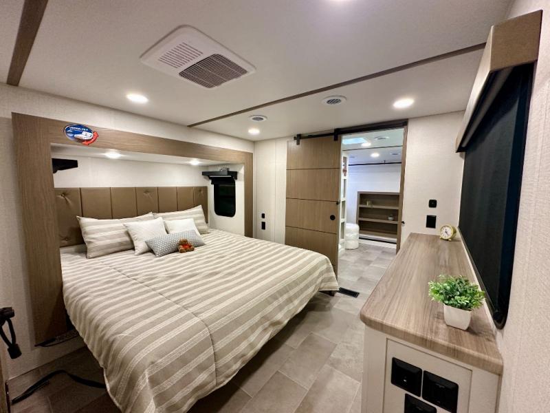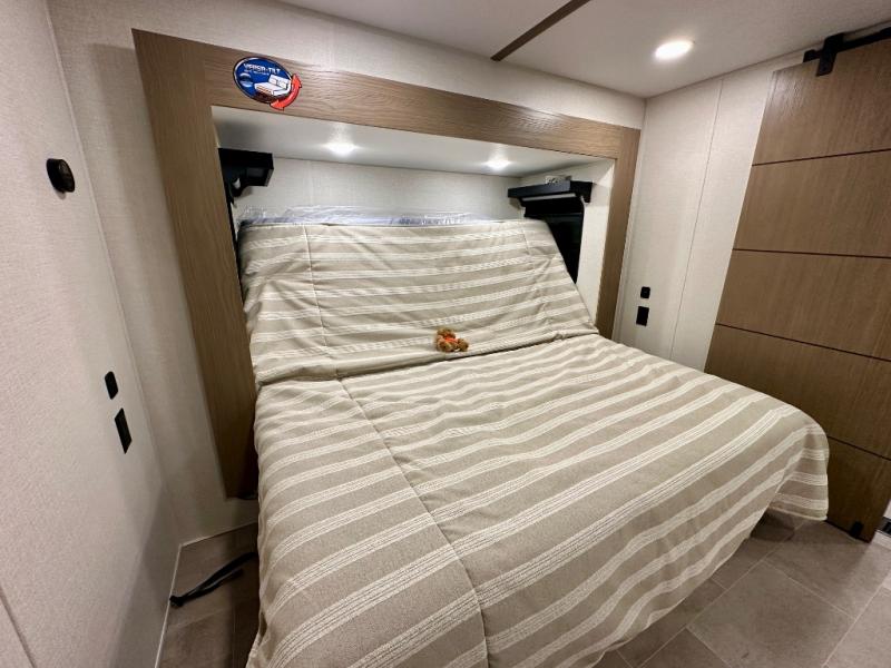 With any Impression fifth wheel by Forest River, the focus of the design is comfort and value, built with quality craftsmanship and attention to customer's desires in each Impression! The exterior includes upgraded E-rated tires, custom exterior graphics package, and insulated slam latch baggage doors. There is also an enclosed docking station, an outside shower, and a 100W roof panel for off-grid capabilities. The fully heated and enclosed AccessiBelly has removable underbelly panels along with enclosed tank valves. There is an industry leading 15K A/C plus 35K BTU furnace to keep you comfortable. The interior has lumbercore cabinetry, residential linoleum, residential backsplash in the kitchen, and oversized opening windows in the living area for more natural lighting and good air flow.