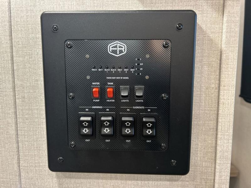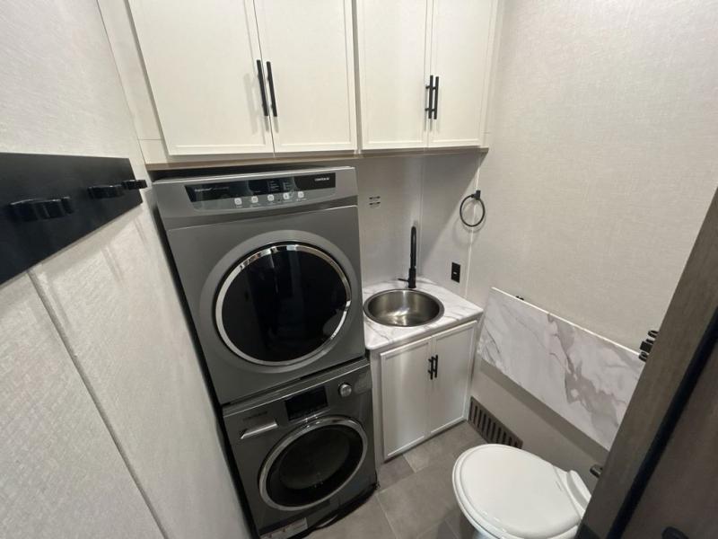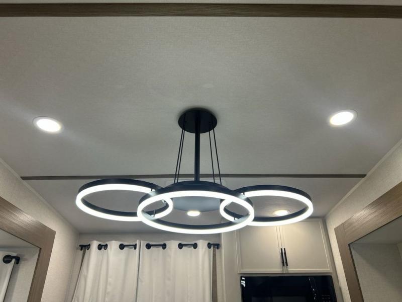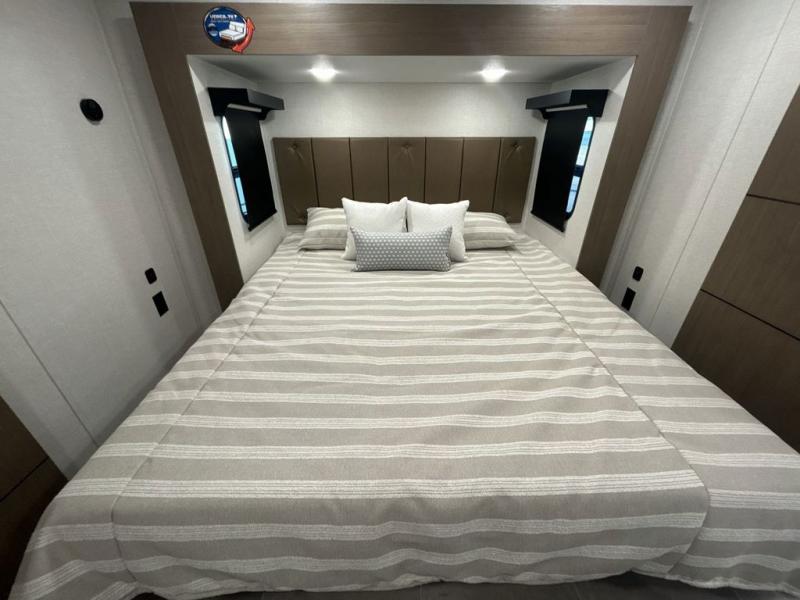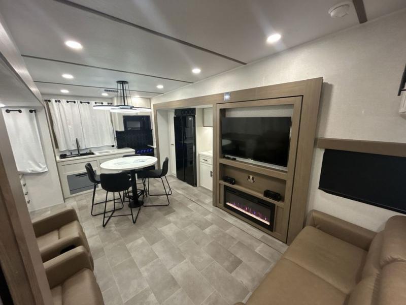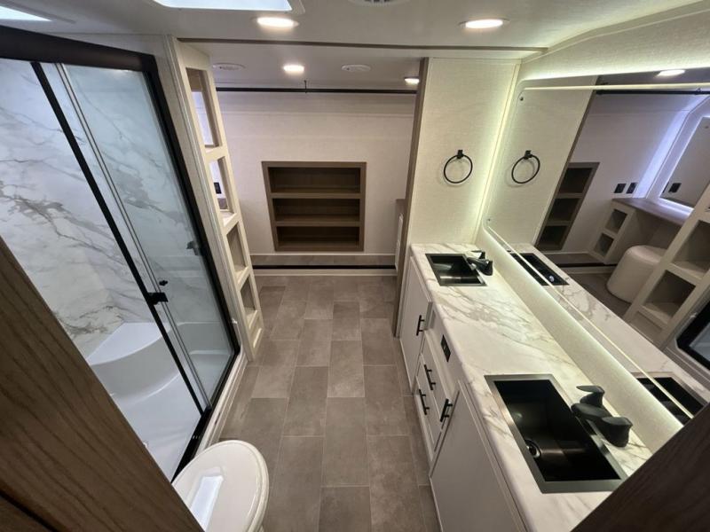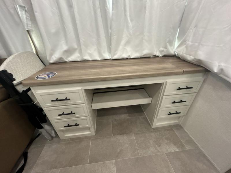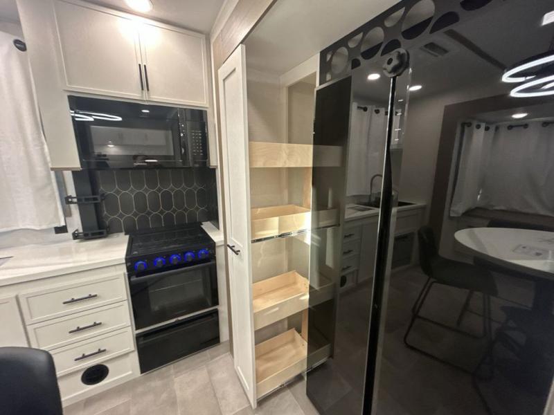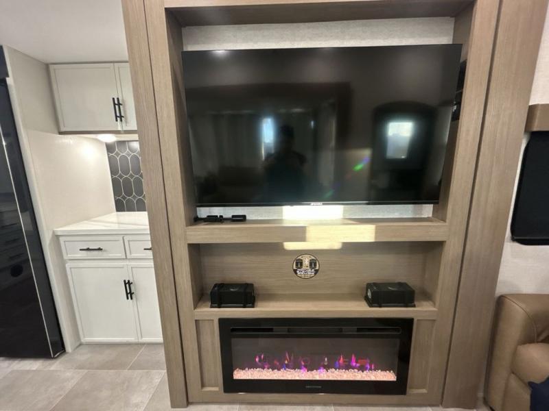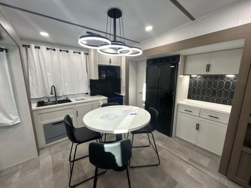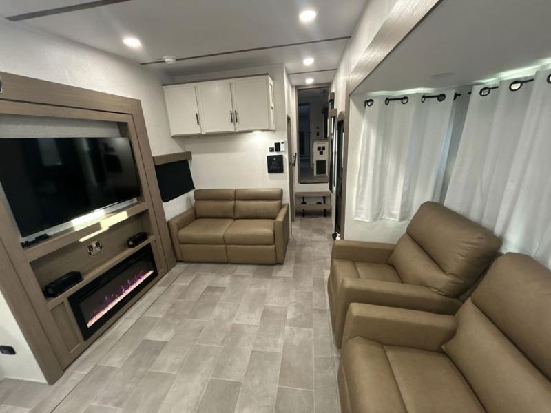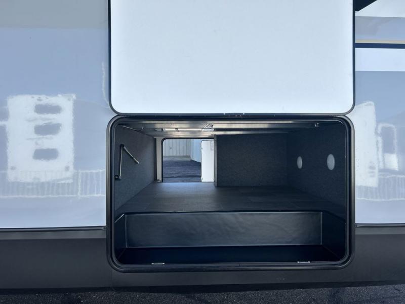 It's easy to see why this fifth wheel was voted Best New Model for 2025 by RV Pro! There are many residential features, such as a middle table with four seats, dual recliners, a desk to get some work done, and a master bedroom you are sure to love. You'll find a king bed with Versa Tilt technology, a dresser, and TV prep. A front master bath includes a walk-in shower with a skylight, dual bath sinks with a back-lit mirror, and a closet with shelves. The middle mud room includes washer/dryer prep, counter space and a pull-out drying rack to hang up swim clothes, towels, and more. Everyone will enjoy spending time in the main living room that includes dual opposing slides, a tri-fold sofa, and an entertainment center with hidden storage behind. And the chef of your group will love the rear kitchen with its 16 cu. ft. 12V refrigerator and pantry, an oven, and plenty of counter space. Head outdoors to enjoy the two power awnings in the evening!