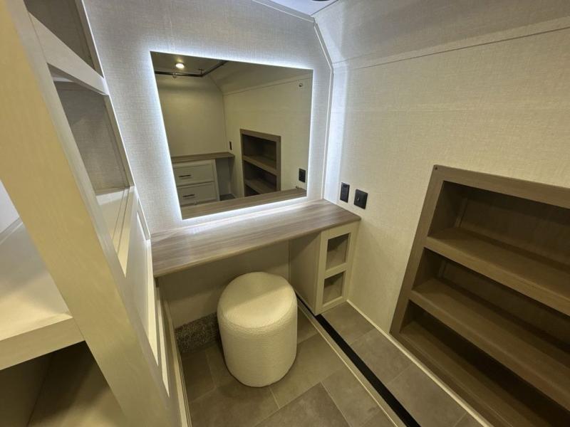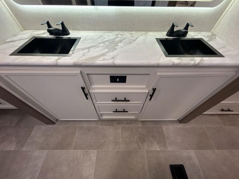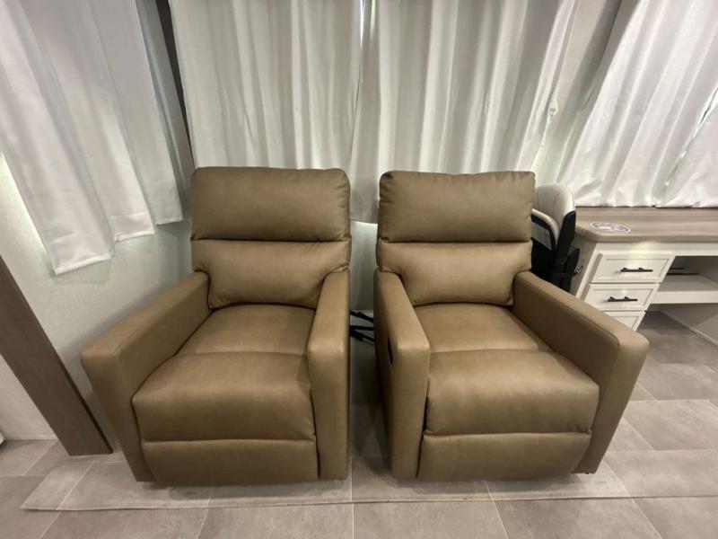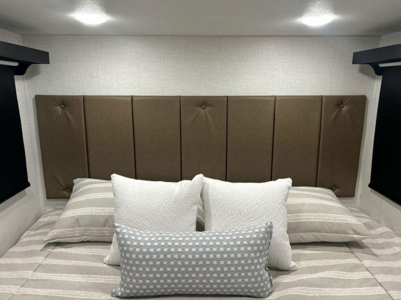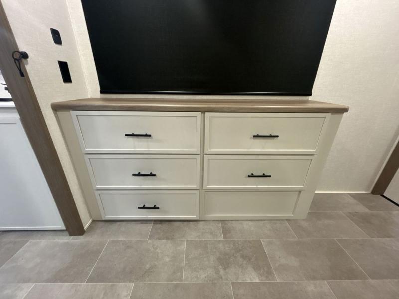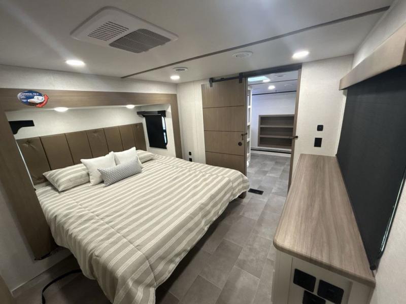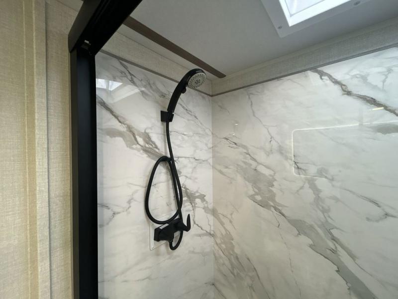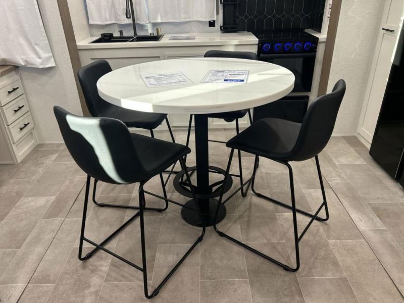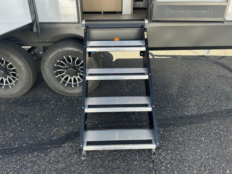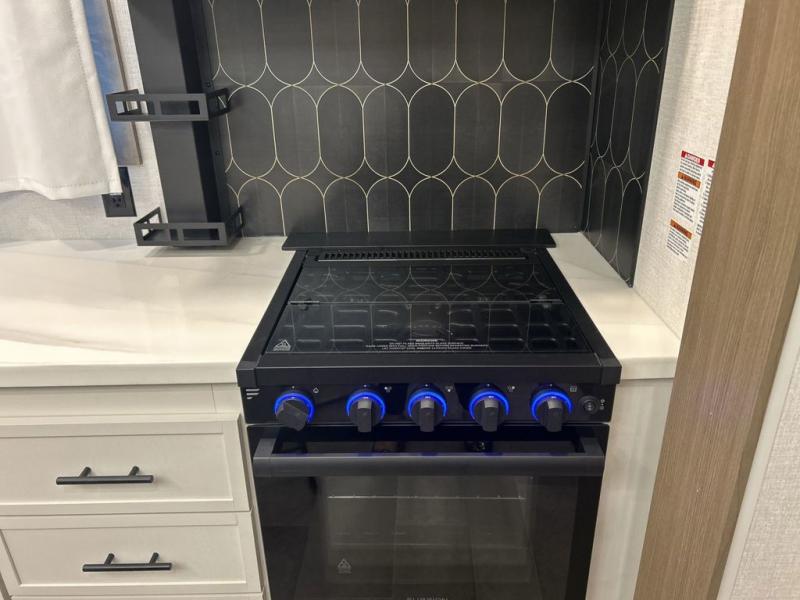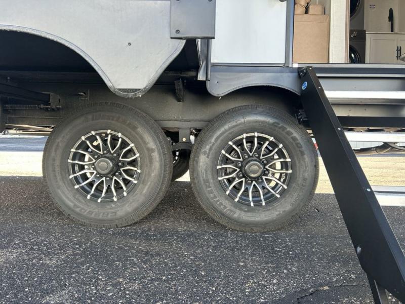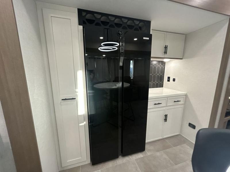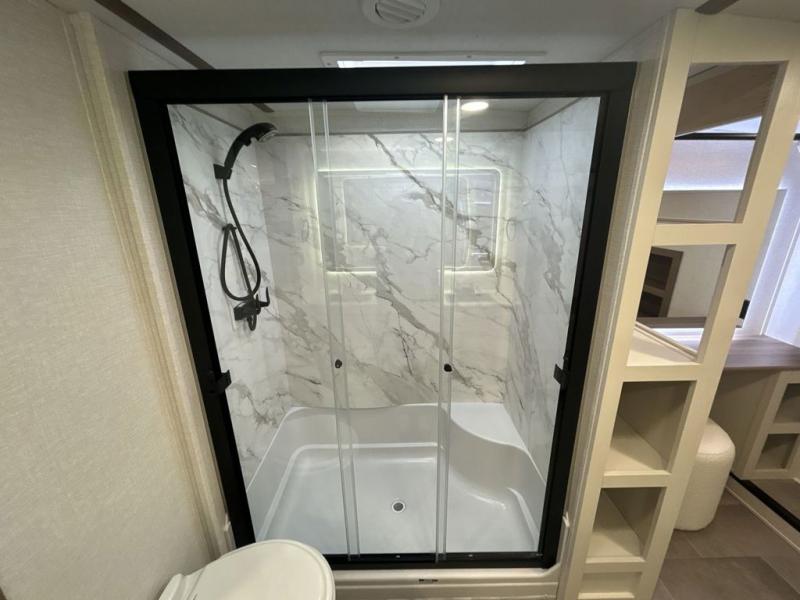 It's easy to see why this fifth wheel was voted Best New Model for 2025 by RV Pro! There are many residential features, such as a middle table with four seats, dual recliners, a desk to get some work done, and a master bedroom you are sure to love. You'll find a king bed with Versa Tilt technology, a dresser, and TV prep. A front master bath includes a walk-in shower with a skylight, dual bath sinks with a back-lit mirror, and a closet with shelves. The middle mud room includes washer/dryer prep, counter space and a pull-out drying rack to hang up swim clothes, towels, and more. Everyone will enjoy spending time in the main living room that includes dual opposing slides, a tri-fold sofa, and an entertainment center with hidden storage behind. And the chef of your group will love the rear kitchen with its 16 cu. ft. 12V refrigerator and pantry, an oven, and plenty of counter space. Head outdoors to enjoy the two power awnings in the evening!