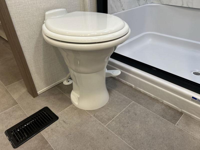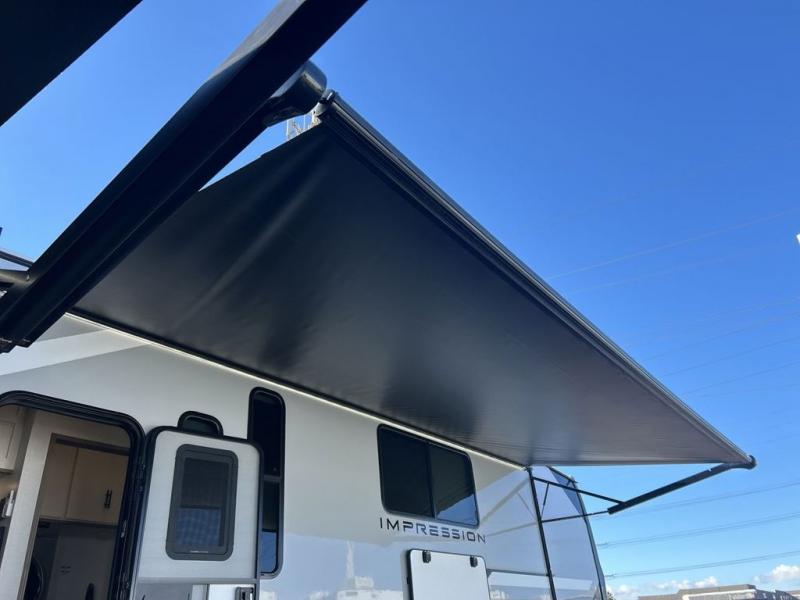 With any Impression mid-profile fifth wheel by Forest River, the focus of the design is comfort and value, built with quality craftsmanship and attention to customer's desires in each Impression! The exterior includes upgraded E-rated tires, custom exterior graphics package, and insulated slam latch baggage doors. There is also an enclosed docking station, an outside shower, and a 100W roof solar panel for off-grid capabilities. The fully heated and enclosed AccessiBelly has removable underbelly panels and offers four seasons of travel, and there is an industry leading 15K A/C plus 35K BTU furnace to keep you comfortable. The interior has lumbercore cabinetry, residential linoleum, residential backsplash in the kitchen, and oversized opening windows in the living area for more natural lighting and good air flow.