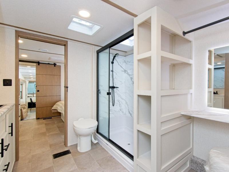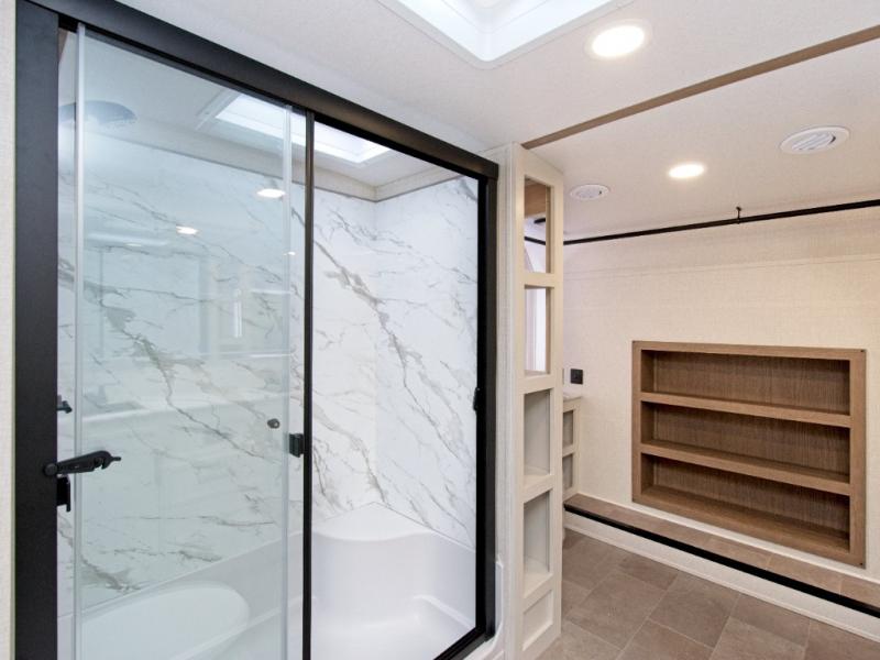 - Front Master Bath: Walk-in shower with skylight, dual sinks with back-lit mirror, and a spacious closet with shelves.