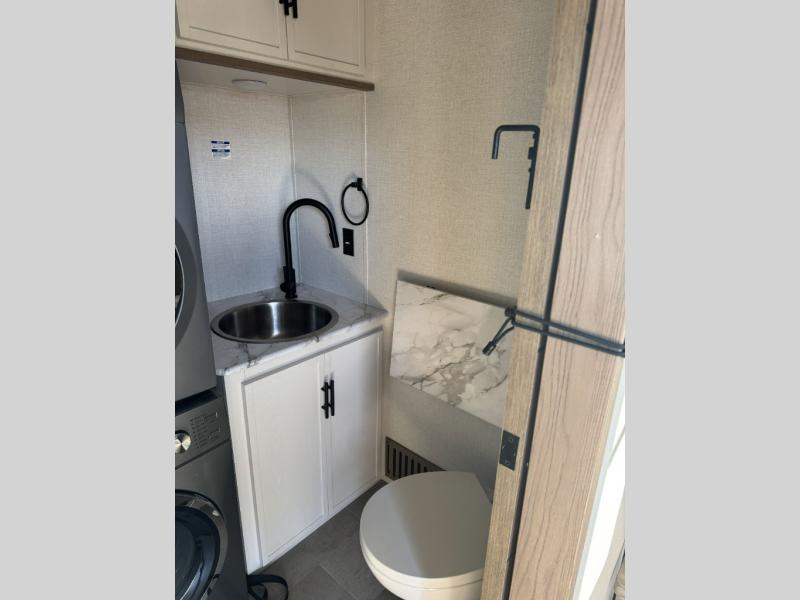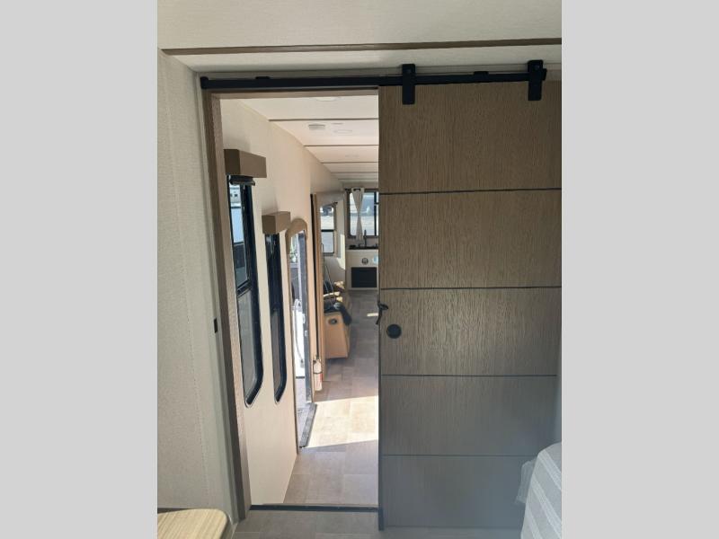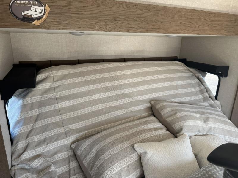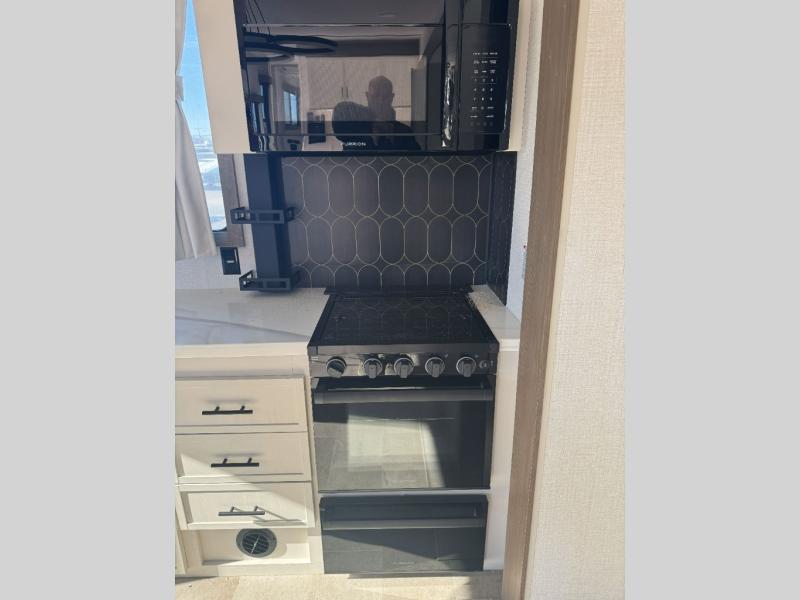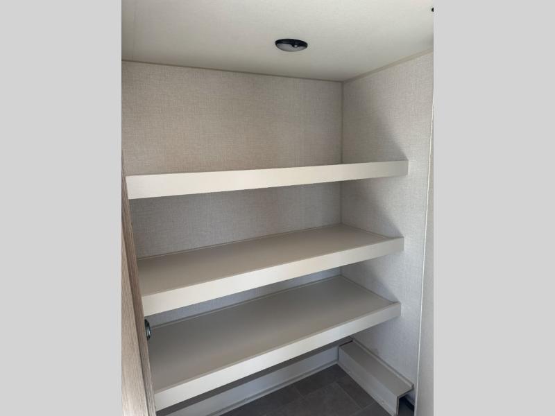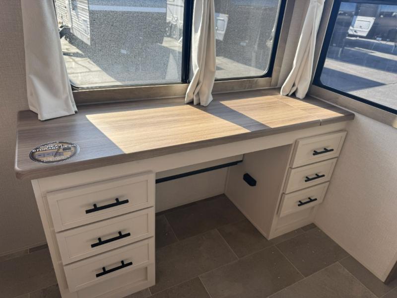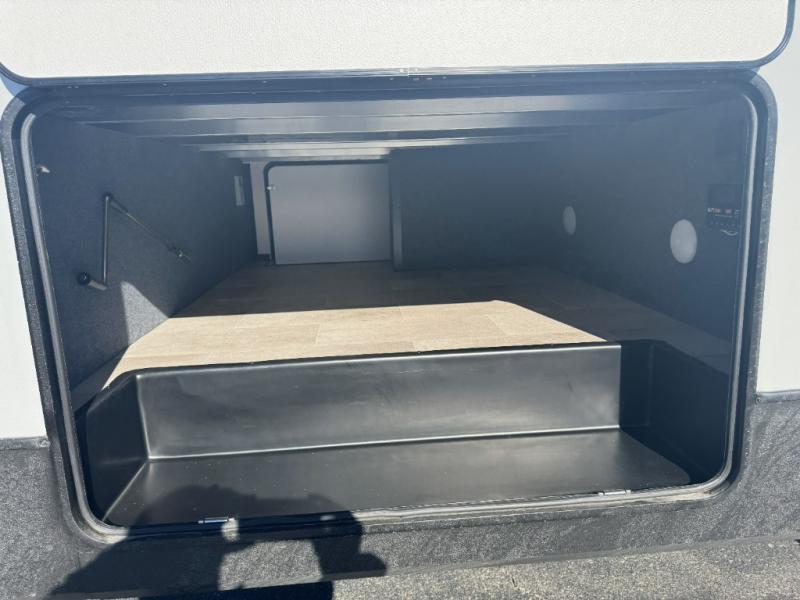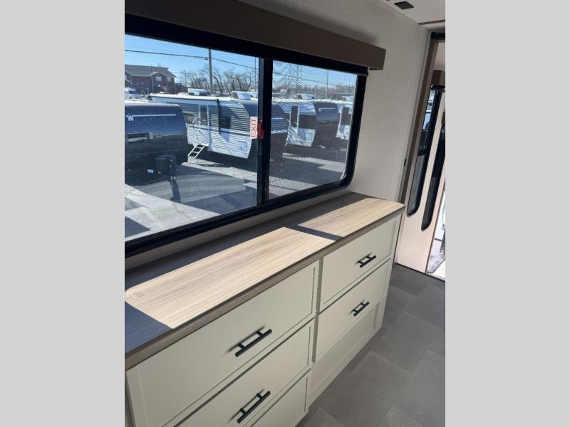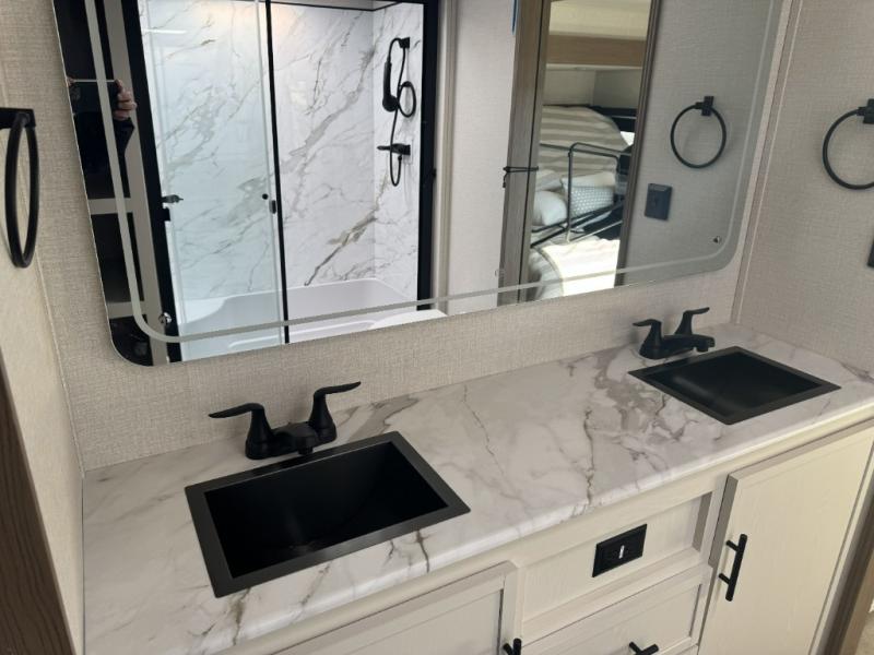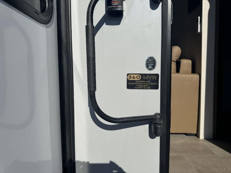 There are many residential features in this 360MYR model, such as a middle table with four seats, dual recliners, a desk to get some work done, and a master bedroom you are sure to love. You'll find a king bed with Versa Tilt technology, a dresser, and TV prep. A front master bath includes a walk-in shower with a skylight, dual bath sinks with a back-lit mirror, and a closet with shelves. The middle half bath includes washer/dryer prep, counter space and a shelf for all your essentials, clothes, and gear. Everyone will enjoy spending time in the main living room that includes dual opposing slides, a tri-fold sofa, and an entertainment center with hidden storage behind. And the chef of your group will love the rear kitchen with its 16 cu. ft. 12V refrigerator and pantry, an oven, and plenty of counter space. Head outdoors to enjoy the two power awnings in the evening!