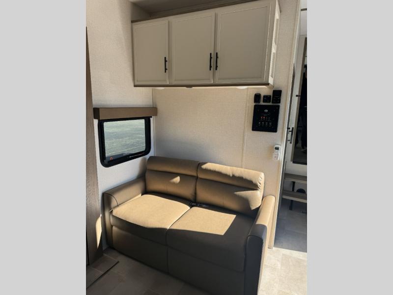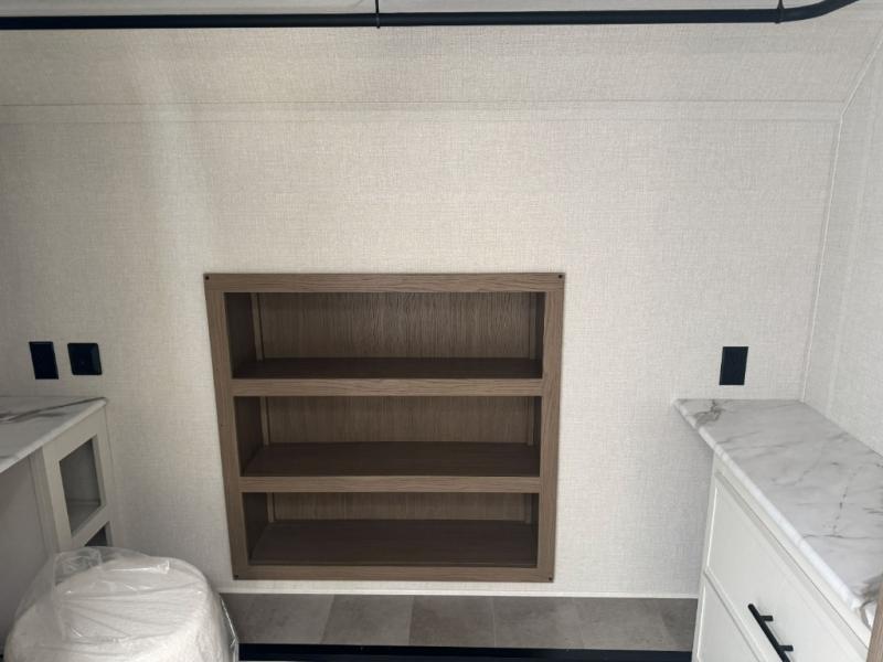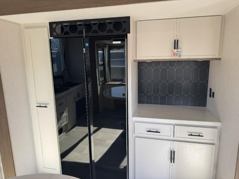With any Impression fifth wheel by Forest River, the focus of the design is comfort and value, built with quality craftsmanship and attention to customer's desires in each Impression! The exterior includes upgraded E-rated tires, custom exterior graphics package, and insulated slam latch baggage doors. There is also an enclosed docking station, an outside shower, and a 100W roof panel for off-grid capabilities. The fully heated and enclosed AccessiBelly has removable underbelly panels along with enclosed tank valves. There is an industry leading 15K A/C plus 35K BTU furnace to keep you comfortable. The interior has lumbercore cabinetry, residential linoleum, residential backsplash in the kitchen, and oversized opening windows in the living area for more natural lighting and good air flow.