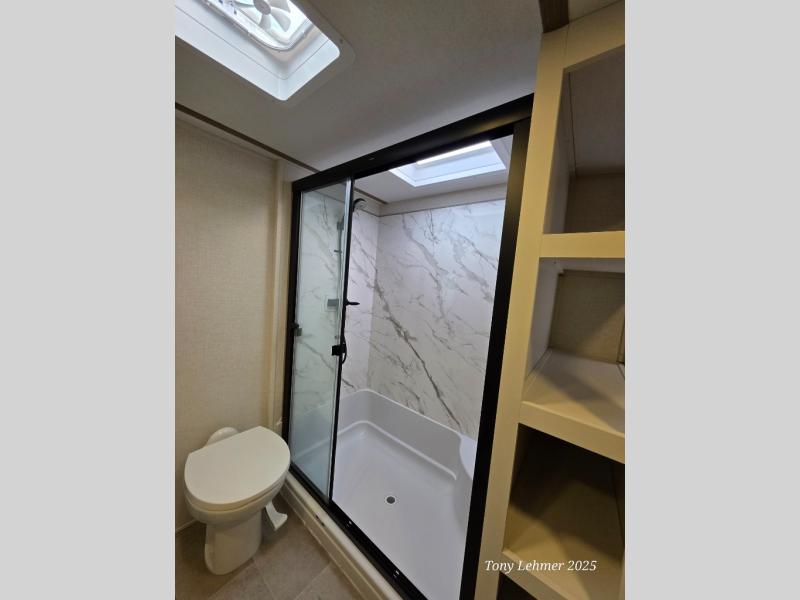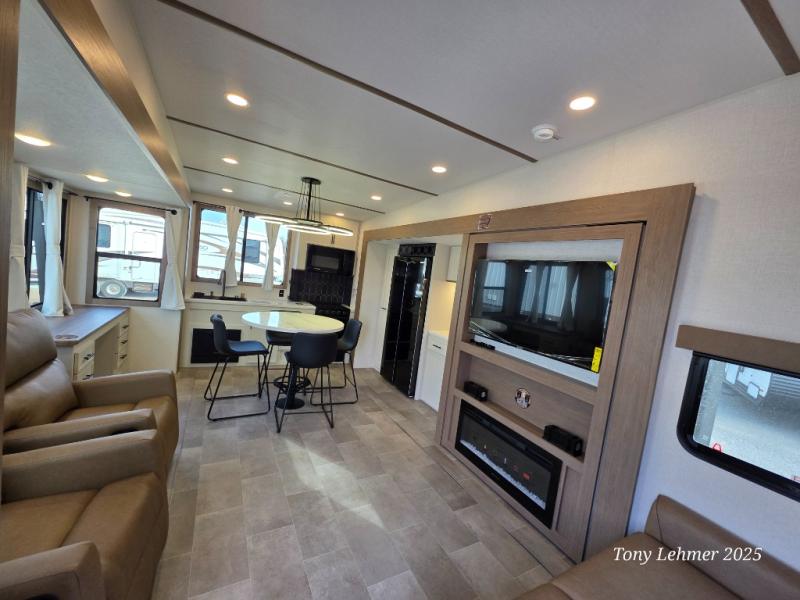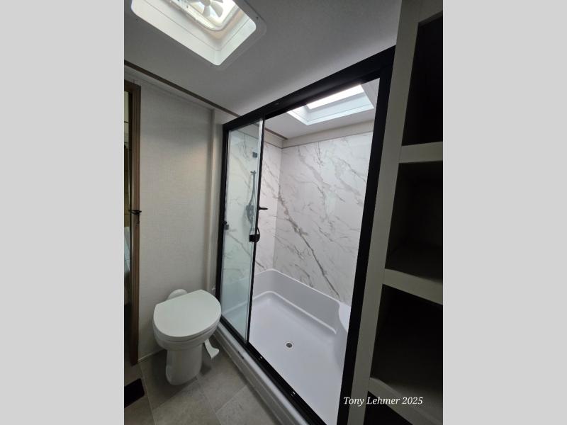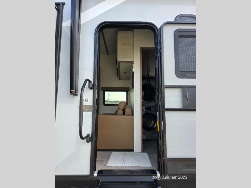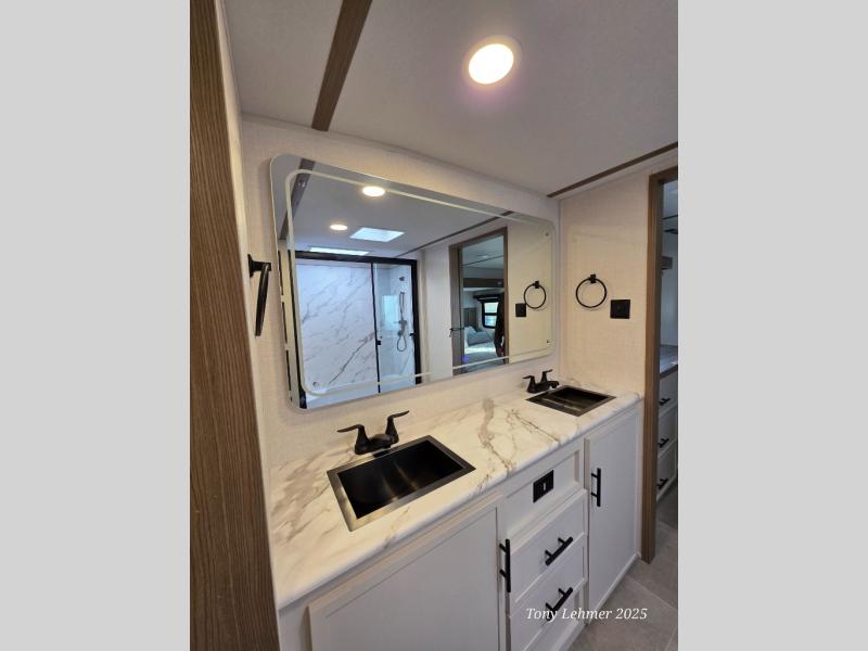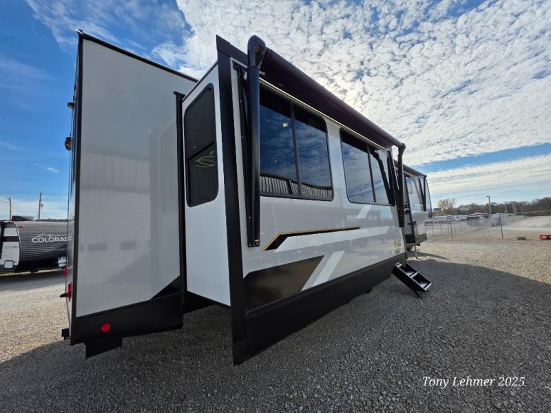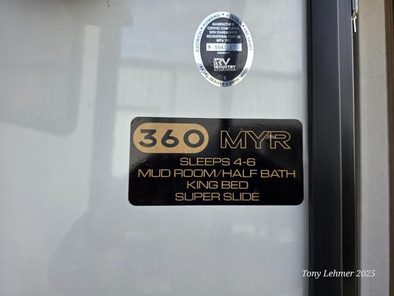 There are many residential features in this 360MYR model, such as a middle table with four seats, dual recliners, a desk to get some work done, and a master bedroom you are sure to love. You'll find a king bed with Versa Tilt technology, a dresser, and TV prep. A front master bath includes a walk-in shower with a skylight, dual bath sinks with a back-lit mirror, and a closet with shelves. The middle half bath includes washer/dryer prep, counter space and a shelf for all your essentials, clothes, and gear. Everyone will enjoy spending time in the main living room that includes dual opposing slides, a tri-fold sofa, and an entertainment center with hidden storage behind. And the chef of your group will love the rear kitchen with its 16 cu. ft. 12V refrigerator and pantry, an oven, and plenty of counter space. Head outdoors to enjoy the two power awnings in the evening!