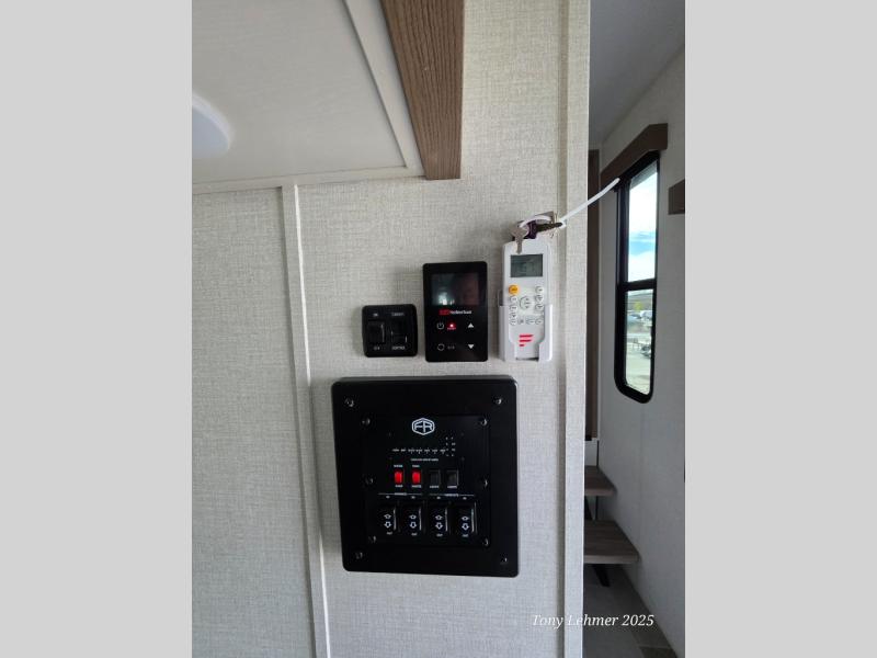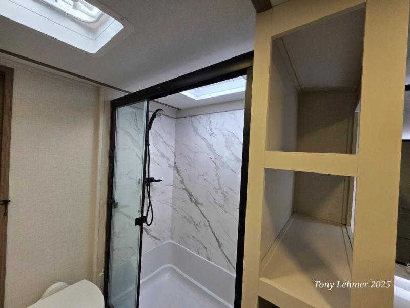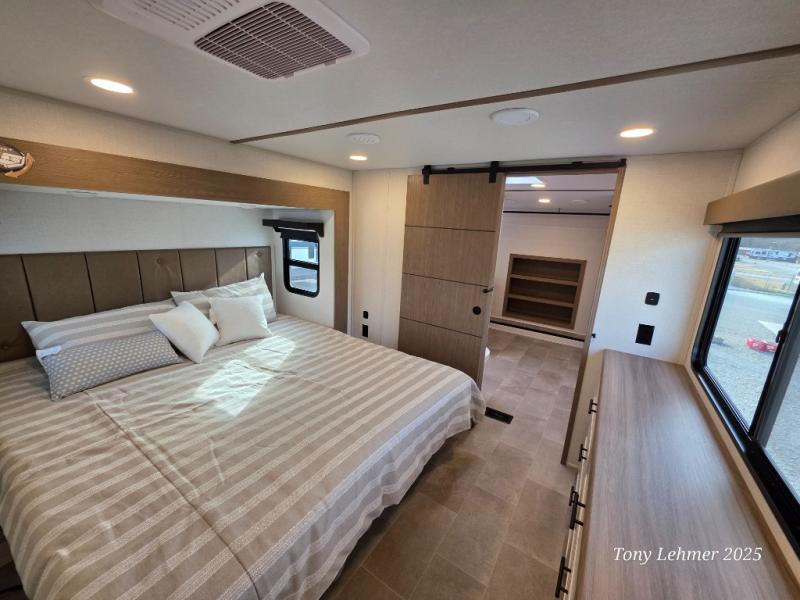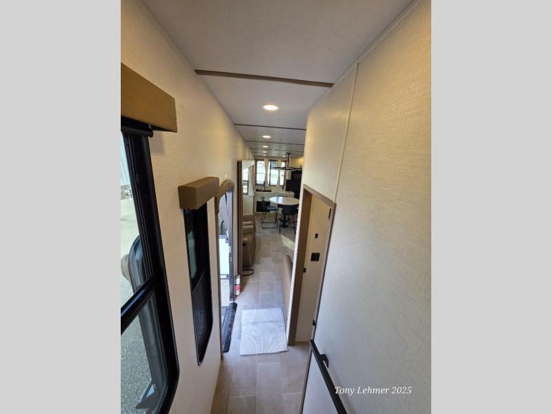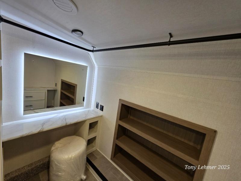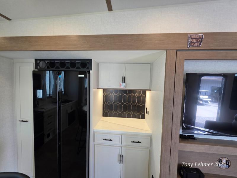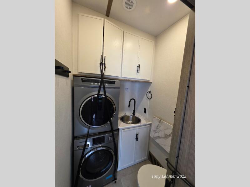 There are many residential features in this 360MYR model, such as a middle table with four seats, dual recliners, a desk to get some work done, and a master bedroom you are sure to love. You'll find a king bed with Versa Tilt technology, a dresser, and TV prep. A front master bath includes a walk-in shower with a skylight, dual bath sinks with a back-lit mirror, and a closet with shelves. The middle half bath includes washer/dryer prep, counter space and a shelf for all your essentials, clothes, and gear. Everyone will enjoy spending time in the main living room that includes dual opposing slides, a tri-fold sofa, and an entertainment center with hidden storage behind. And the chef of your group will love the rear kitchen with its 16 cu. ft. 12V refrigerator and pantry, an oven, and plenty of counter space. Head outdoors to enjoy the two power awnings in the evening!