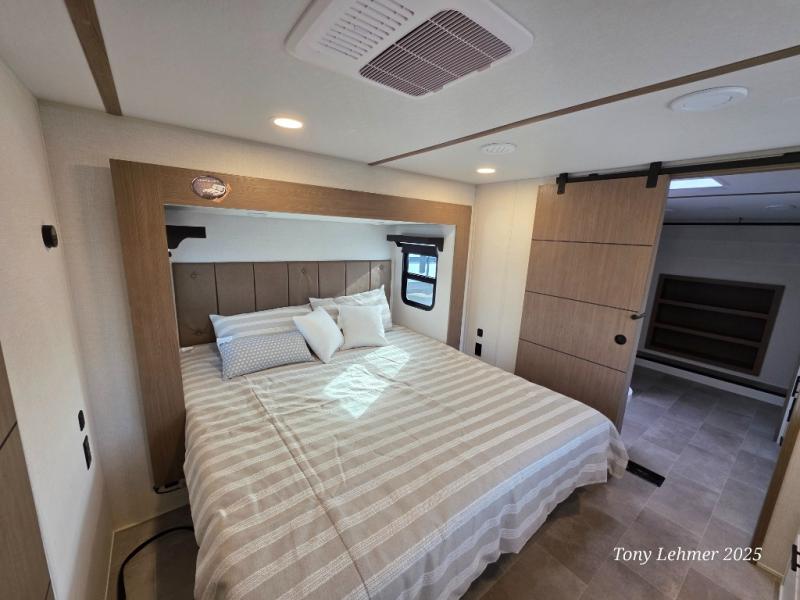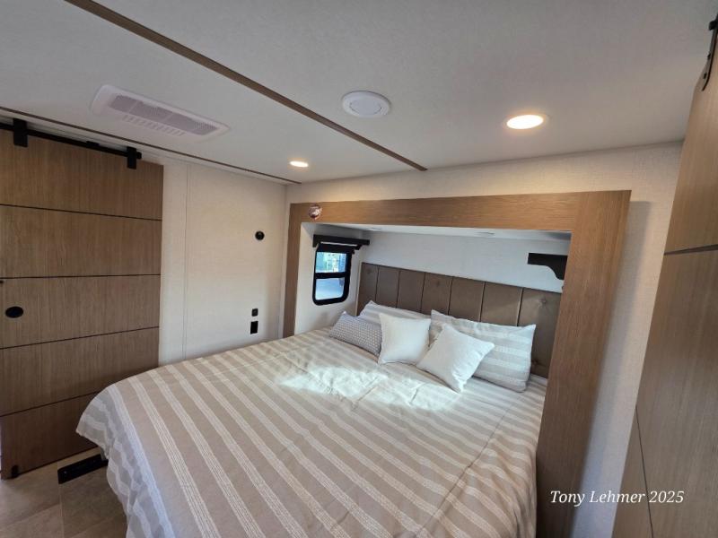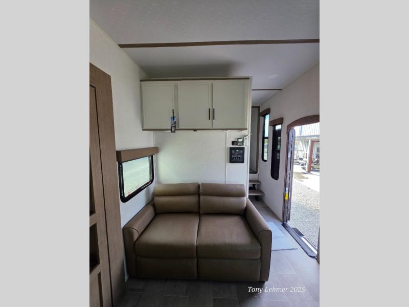 With any Impression fifth wheel by Forest River, the focus of the design is comfort and value, built with quality craftsmanship and attention to customer's desires in each Impression! The exterior includes upgraded E-rated tires, custom exterior graphics package, and insulated slam latch baggage doors. There is also an enclosed docking station, an outside shower, and a 100W roof panel for off-grid capabilities. The fully heated and enclosed AccessiBelly has removable underbelly panels along with enclosed tank valves. There is an industry leading 15K A/C plus 35K BTU furnace to keep you comfortable. The interior has lumbercore cabinetry, residential linoleum, residential backsplash in the kitchen, and oversized opening windows in the living area for more natural lighting and good air flow.
