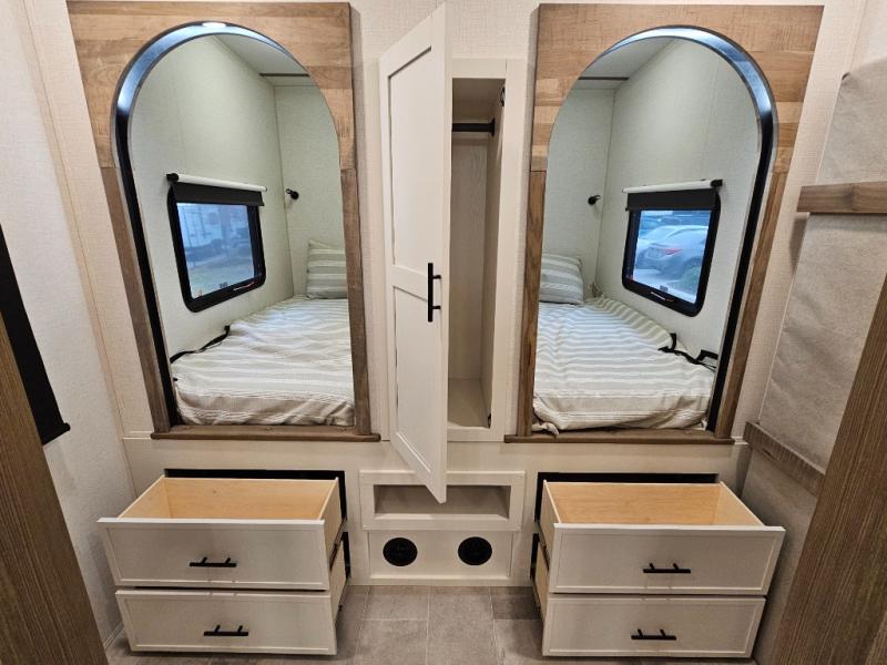 Rear private bedroom with twin beds (36" x 74"), individual privacy curtains, and storage drawers