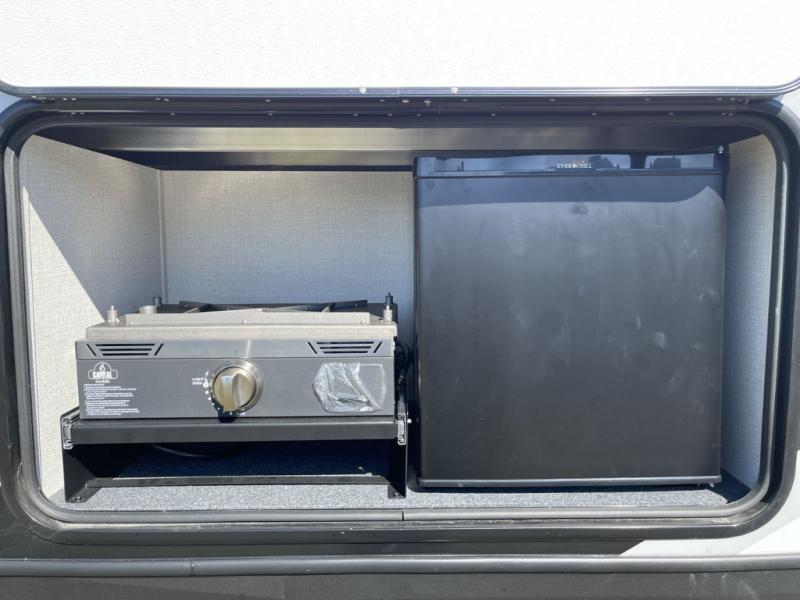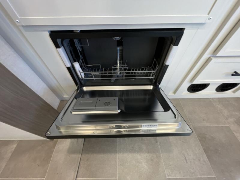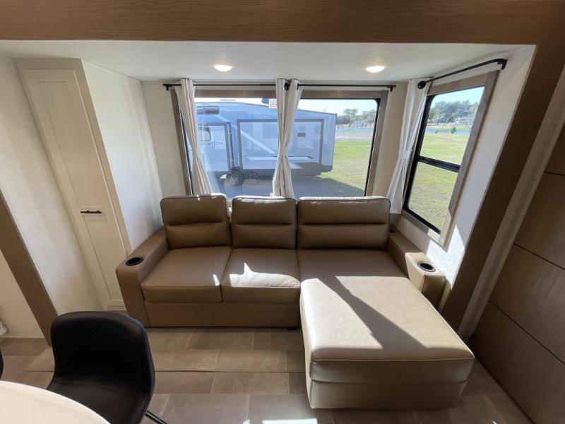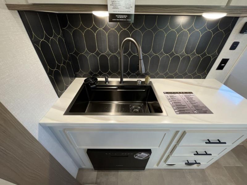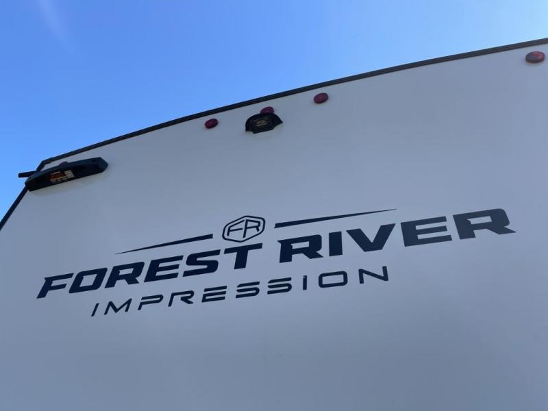 With any Impression fifth wheel by Forest River, the focus of the design is comfort and value, built with quality craftsmanship and attention to customer's desires in each Impression! The exterior includes upgraded E-rated tires, custom exterior graphics package, and insulated slam latch baggage doors. There is also an enclosed docking station, an outside shower, and a 100W roof panel for off-grid capabilities. The fully heated and enclosed AccessiBelly has removable underbelly panels along with enclosed tank valves. There is an industry leading 15K A/C plus 35K BTU furnace to keep you comfortable. The interior has lumbercore cabinetry, residential linoleum, residential backsplash in the kitchen, and oversized opening windows in the living area for more natural lighting and good air flow.