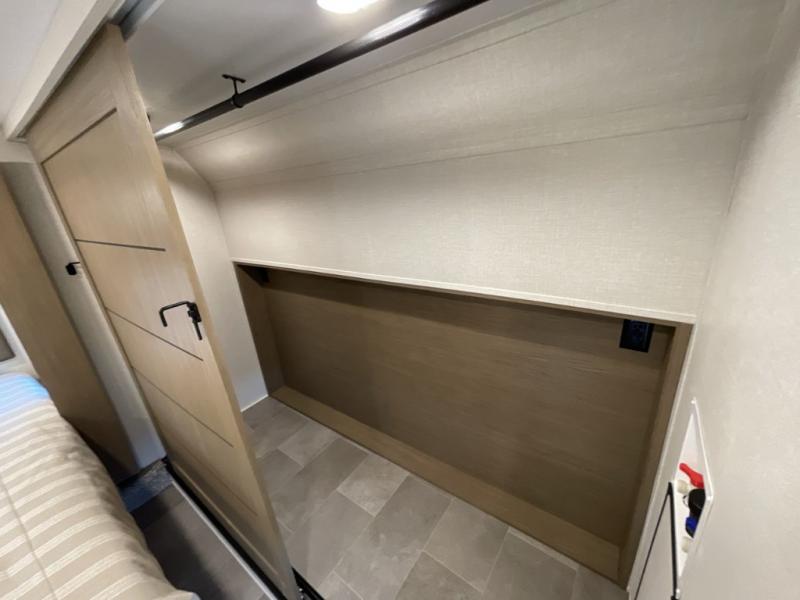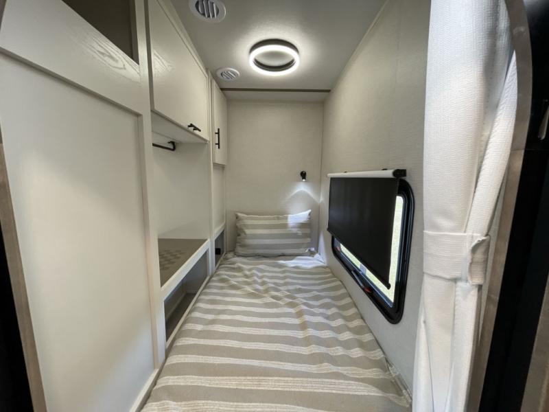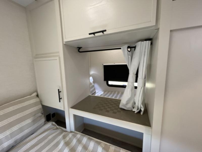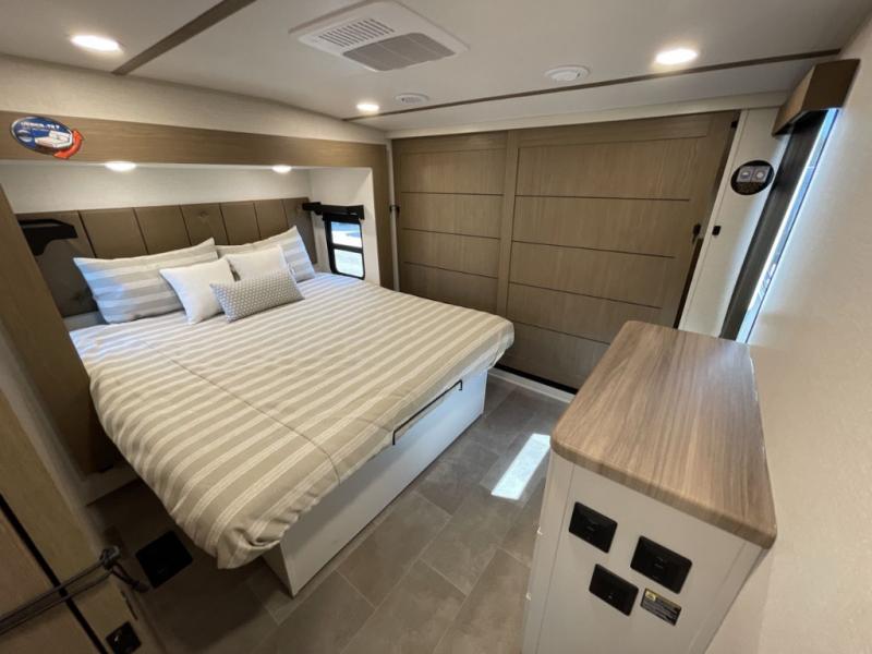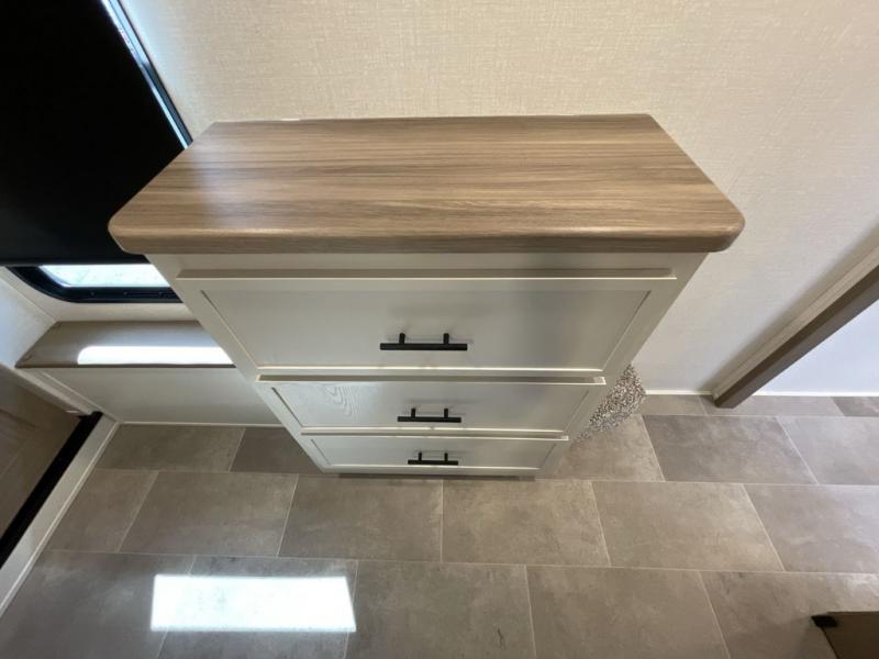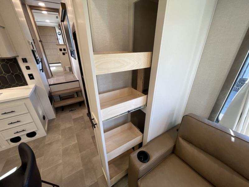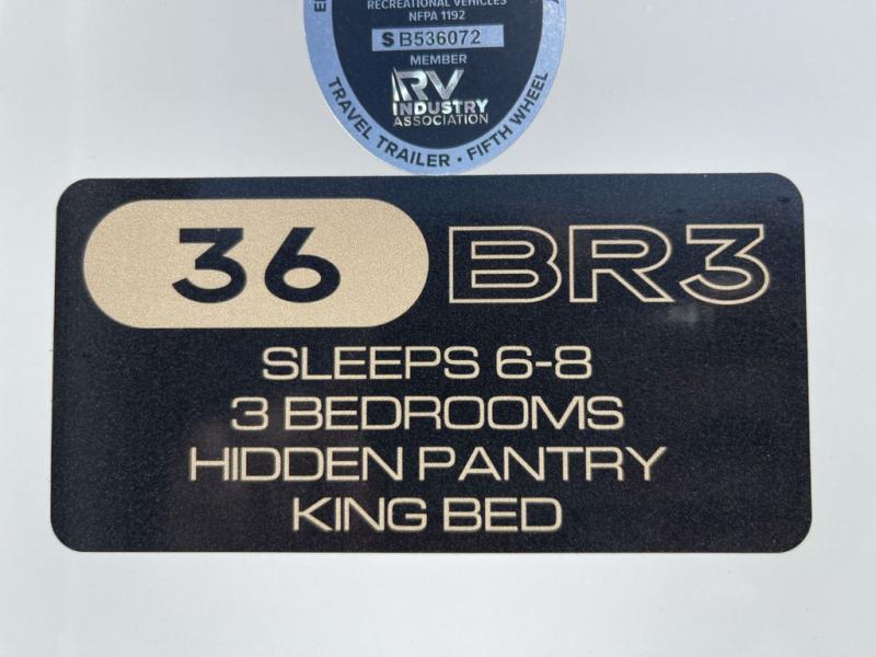 This 36BR3 model is designed for both comfort and practicality, starting at the rear with a private bedroom featuring two 36" x 74" twin beds, each with its own curtain and plenty of storage drawers underneath, plus doors for added privacy. In the middle, the main living area offers a cozy chaise lounge perfect for relaxing in front of the TV and fireplace, with a hidden pantry tucked behind for smart storage. A central bar top with chairs creates the perfect gathering spot for meals, games, or evening drinks. The well-equipped kitchen makes cooking a breeze with a 16-cu. ft. refrigerator, microwave, 21" range, and abundant overhead cabinets for all your essentials. The full bathroom includes a walk-in shower with skylight and a linen closet for extra convenience. At the front, the private bedroom provides a luxurious retreat with a king bed featuring Versa Tilt technology, a dresser, bench, and a spacious wardrobe to keep everything organized.