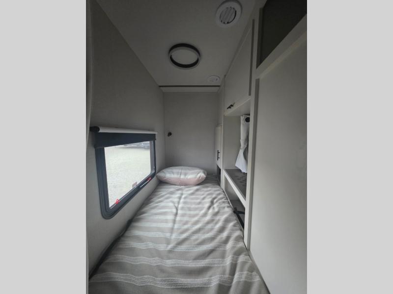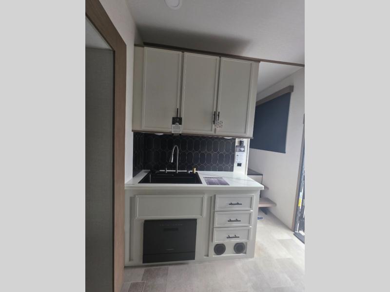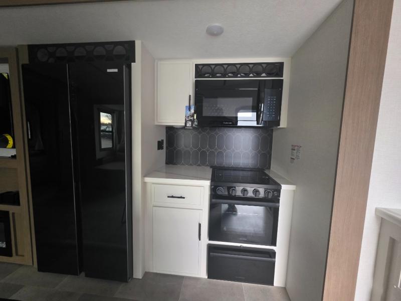 With any Impression fifth wheel by Forest River, the focus of the design is comfort and value, built with quality craftsmanship and attention to customer's desires in each Impression! The exterior includes upgraded E-rated tires, custom exterior graphics package, and insulated slam latch baggage doors. There is also an enclosed docking station, an outside shower, and a 100W roof panel for off-grid capabilities. The fully heated and enclosed AccessiBelly has removable underbelly panels along with enclosed tank valves. There is an industry leading 15K A/C plus 35K BTU furnace to keep you comfortable. The interior has lumbercore cabinetry, residential linoleum, residential backsplash in the kitchen, and oversized opening windows in the living area for more natural lighting and good air flow.