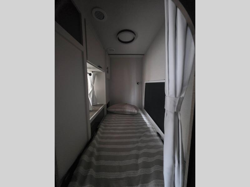 This 36BR3 model is designed for both comfort and practicality, starting at the rear with a private bedroom featuring two 36" x 74" twin beds, each with its own curtain and plenty of storage drawers underneath, plus doors for added privacy. In the middle, the main living area offers a cozy chaise lounge perfect for relaxing in front of the TV and fireplace, with a hidden pantry tucked behind for smart storage. A central bar top with chairs creates the perfect gathering spot for meals, games, or evening drinks. The well-equipped kitchen makes cooking a breeze with a 16-cu. ft. refrigerator, microwave, 21" range, and abundant overhead cabinets for all your essentials. The full bathroom includes a walk-in shower with skylight and a linen closet for extra convenience. At the front, the private bedroom provides a luxurious retreat with a king bed featuring Versa Tilt technology, a dresser, bench, and a spacious wardrobe to keep everything organized.