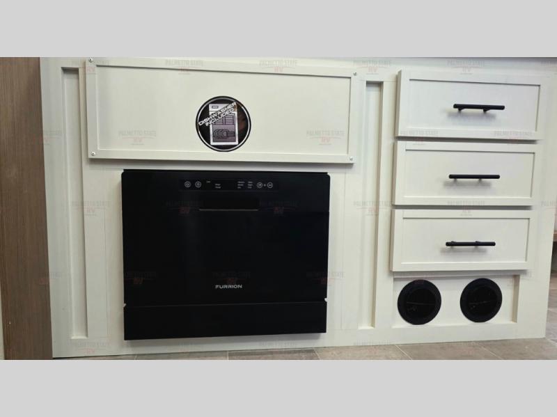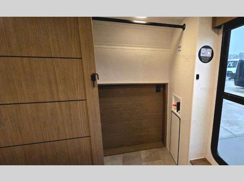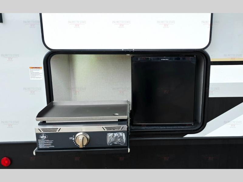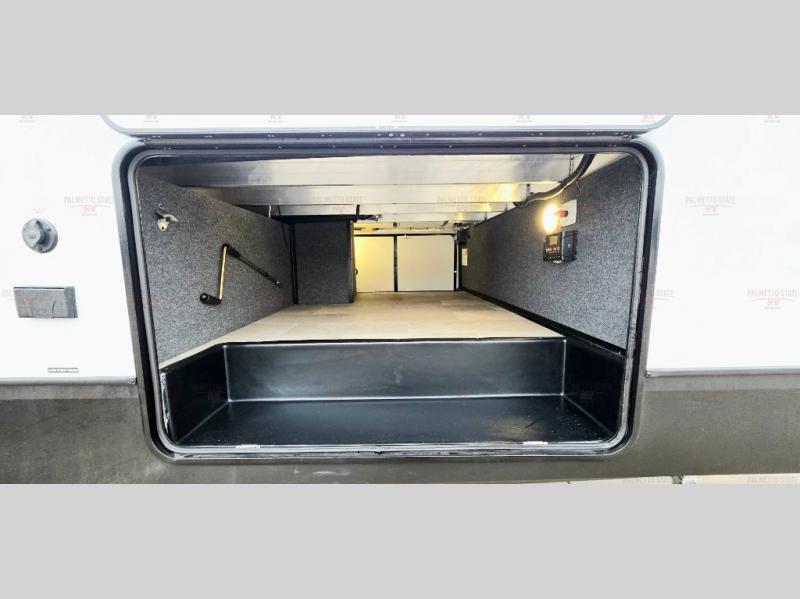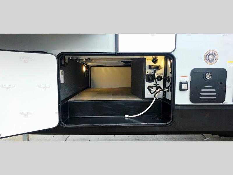 With any Impression fifth wheel by Forest River, the focus of the design is comfort and value, built with quality craftsmanship and attention to customer's desires in each Impression! The exterior includes upgraded E-rated tires, custom exterior graphics package, and insulated slam latch baggage doors. There is also an enclosed docking station, an outside shower, and a 100W roof panel for off-grid capabilities. The fully heated and enclosed AccessiBelly has removable underbelly panels along with enclosed tank valves. There is an industry leading 15K A/C plus 35K BTU furnace to keep you comfortable. The interior has lumbercore cabinetry, residential linoleum, residential backsplash in the kitchen, and oversized opening windows in the living area for more natural lighting and good air flow.