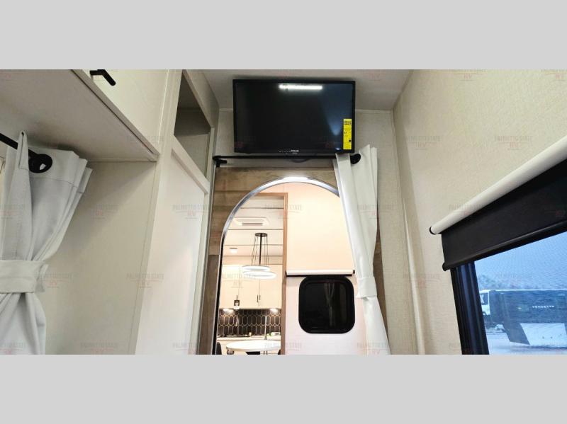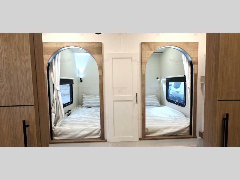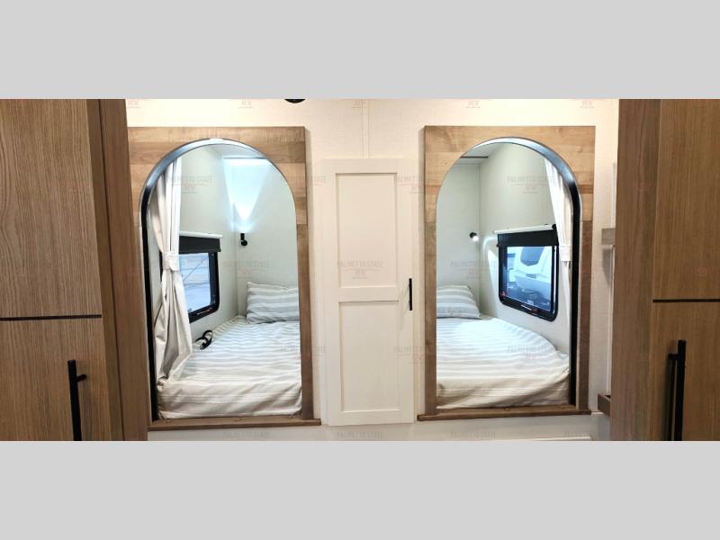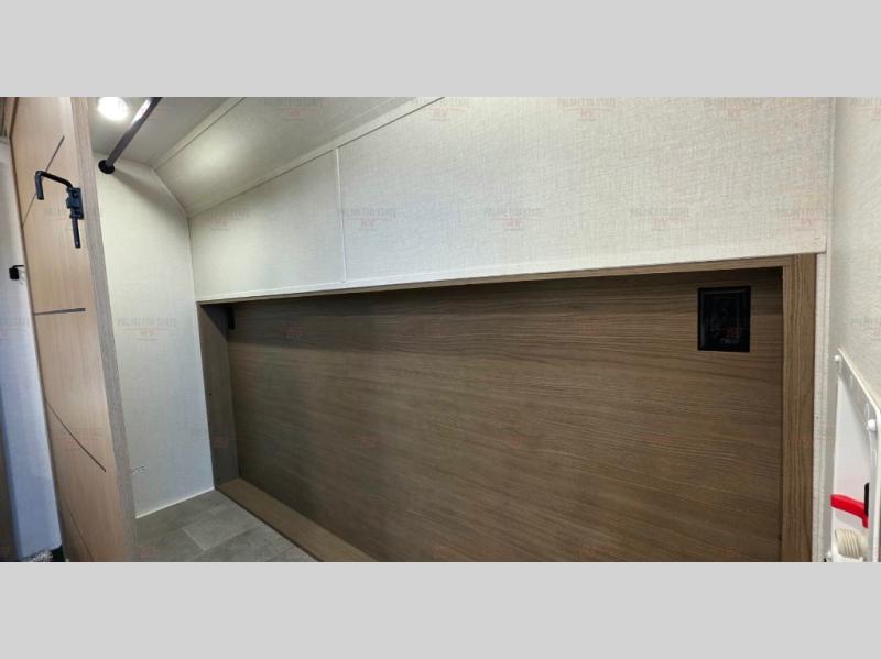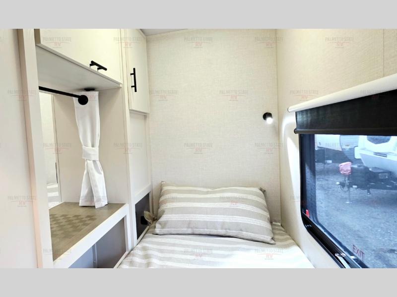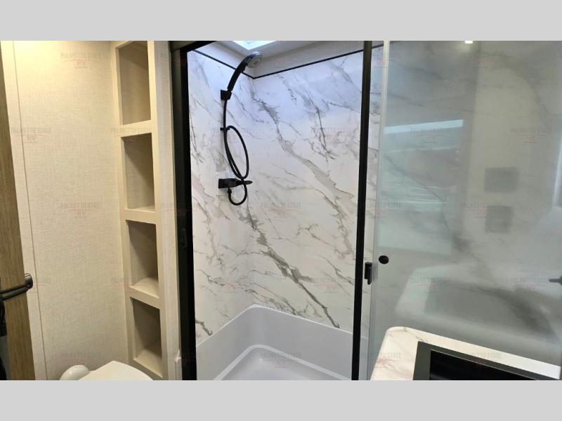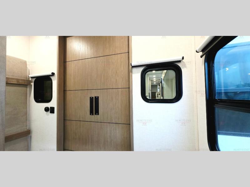 This 36BR3 model is designed for both comfort and practicality, starting at the rear with a private bedroom featuring two 36" x 74" twin beds, each with its own curtain and plenty of storage drawers underneath, plus doors for added privacy. In the middle, the main living area offers a cozy chaise lounge perfect for relaxing in front of the TV and fireplace, with a hidden pantry tucked behind for smart storage. A central bar top with chairs creates the perfect gathering spot for meals, games, or evening drinks. The well-equipped kitchen makes cooking a breeze with a 16-cu. ft. refrigerator, microwave, 21" range, and abundant overhead cabinets for all your essentials. The full bathroom includes a walk-in shower with skylight and a linen closet for extra convenience. At the front, the private bedroom provides a luxurious retreat with a king bed featuring Versa Tilt technology, a dresser, bench, and a spacious wardrobe to keep everything organized.