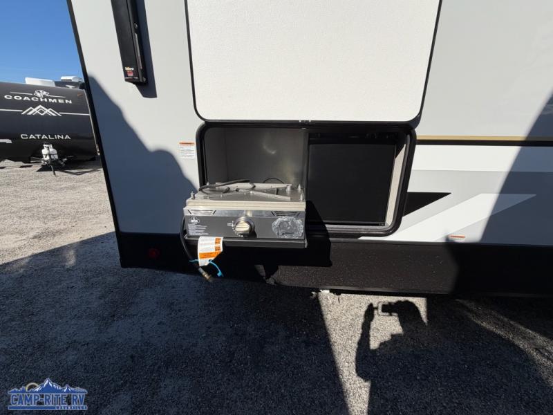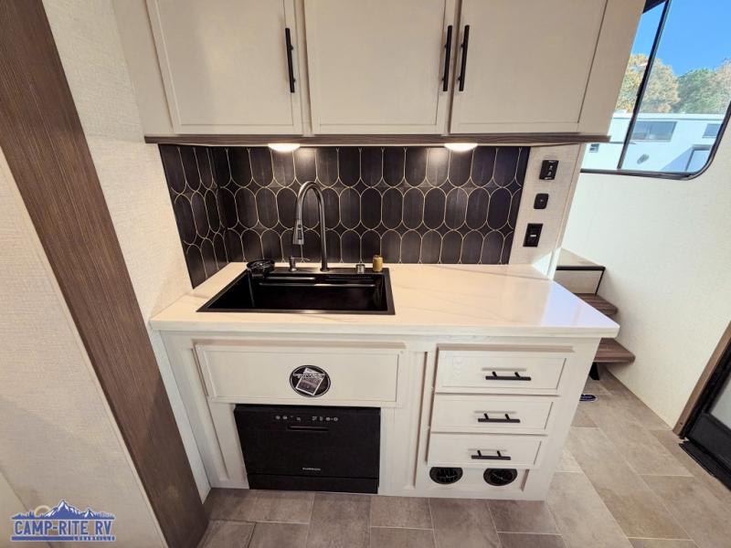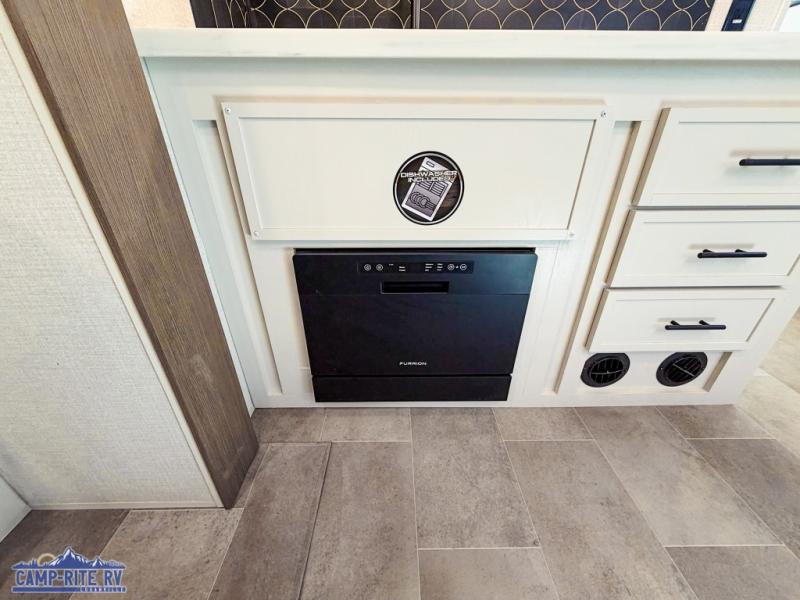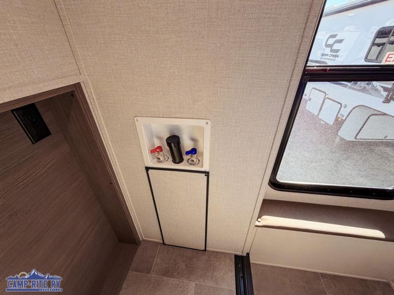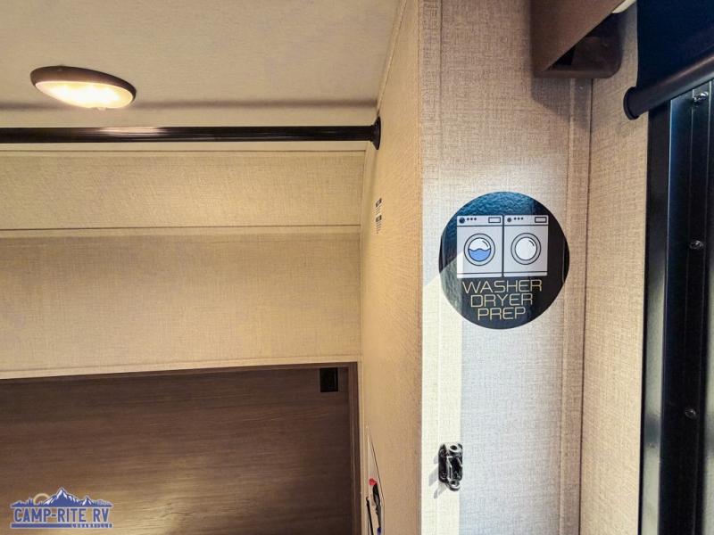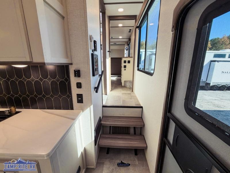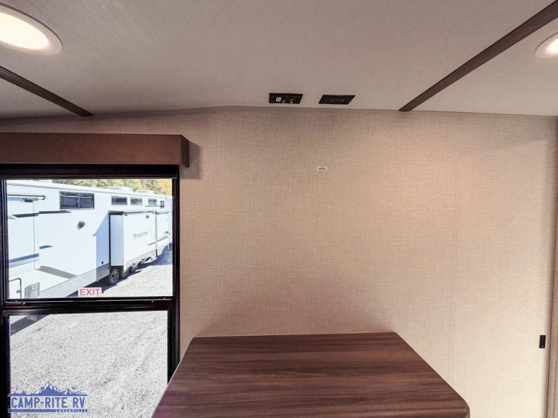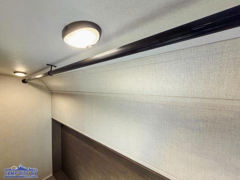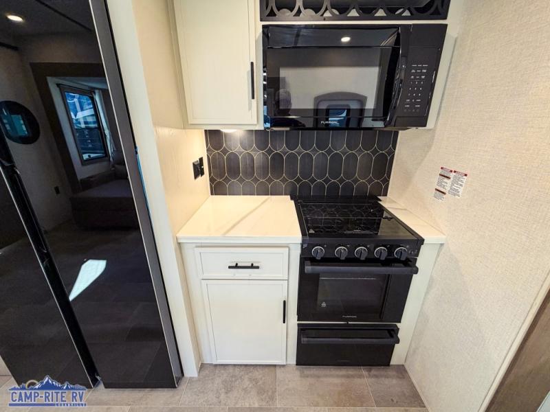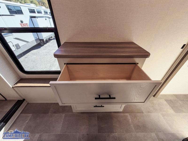With any Impression fifth wheel by Forest River, the focus of the design is comfort and value, built with quality craftsmanship and attention to customer's desires in each Impression! The exterior includes upgraded E-rated tires, custom exterior graphics package, and insulated slam latch baggage doors. There is also an enclosed docking station, an outside shower, and a 100W roof panel for off-grid capabilities. The fully heated and enclosed AccessiBelly has removable underbelly panels along with enclosed tank valves. There is an industry leading 15K A/C plus 35K BTU furnace to keep you comfortable. The interior has lumbercore cabinetry, residential linoleum, residential backsplash in the kitchen, and oversized opening windows in the living area for more natural lighting and good air flow.