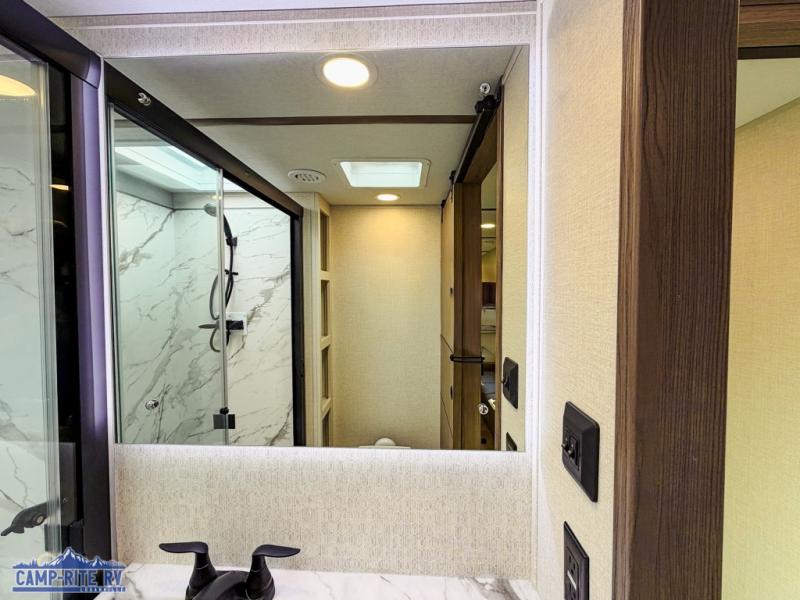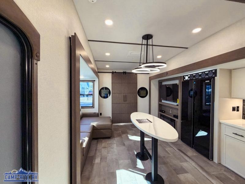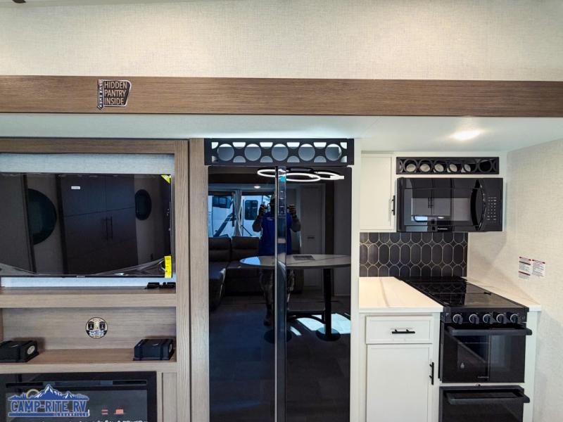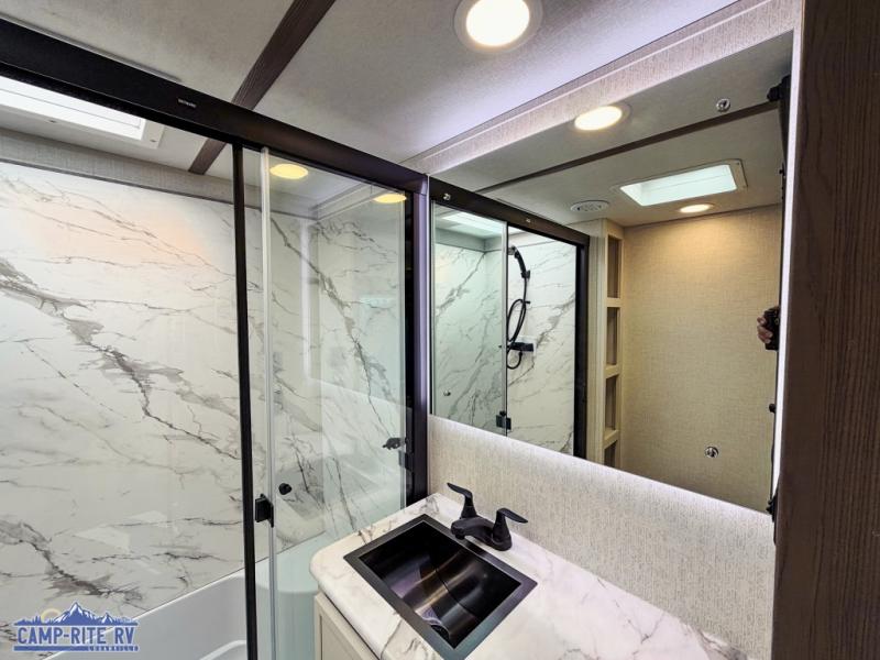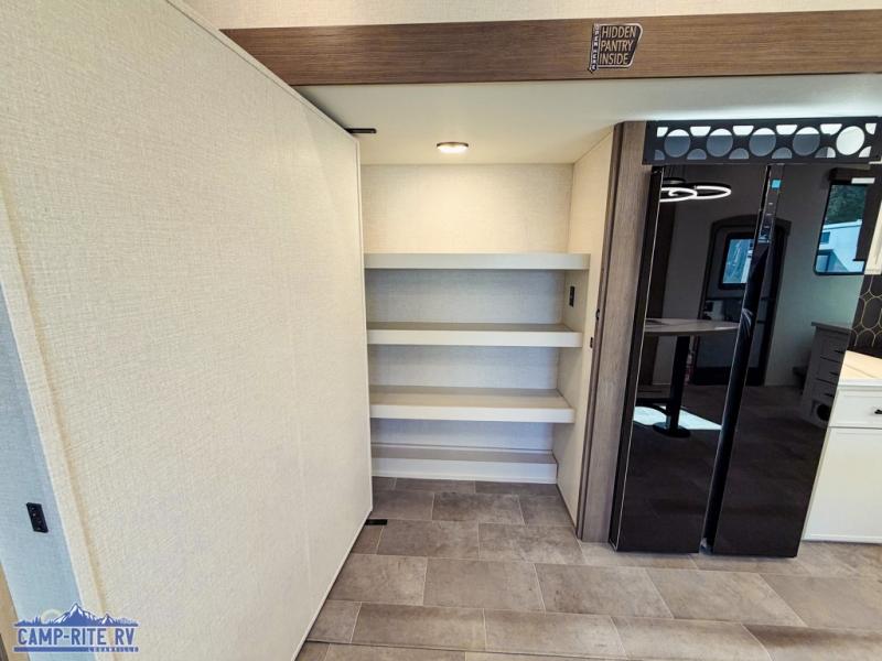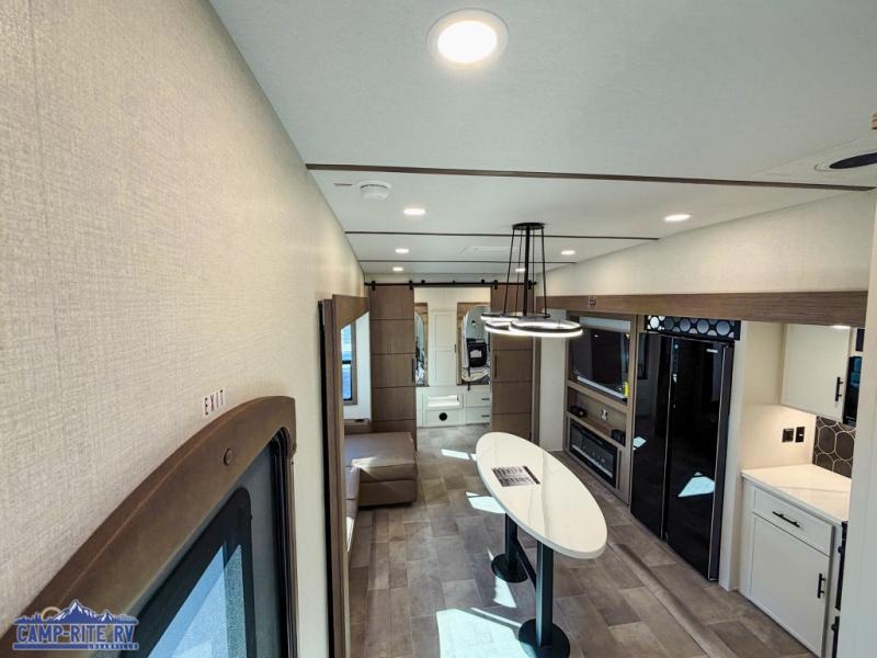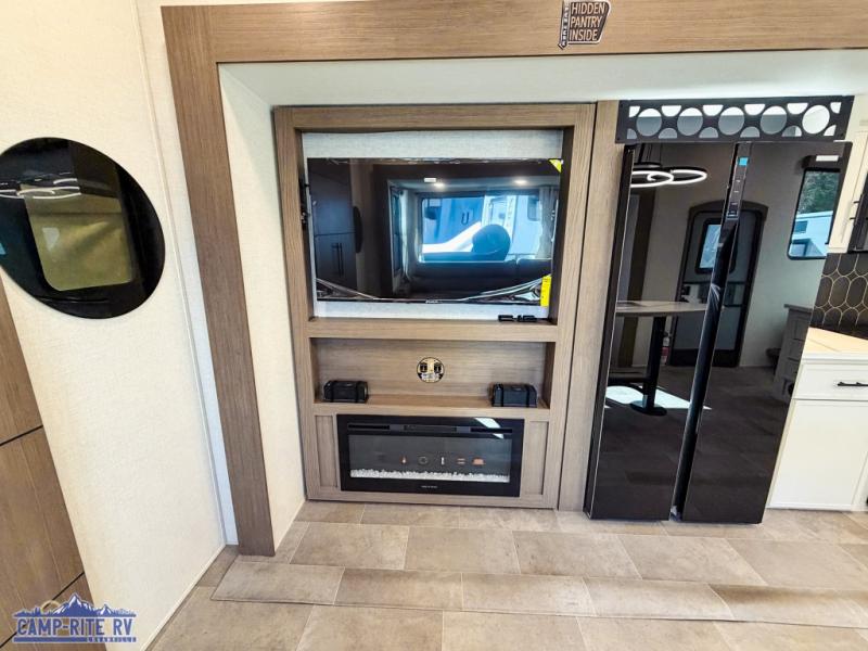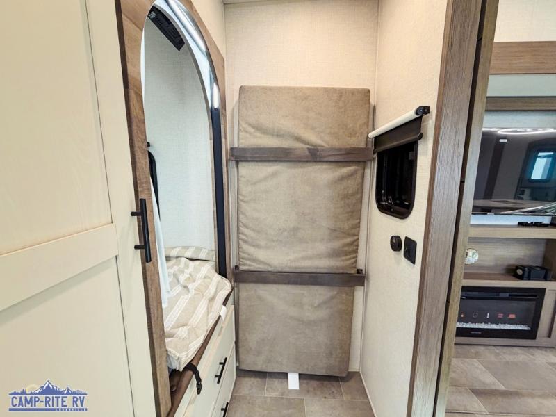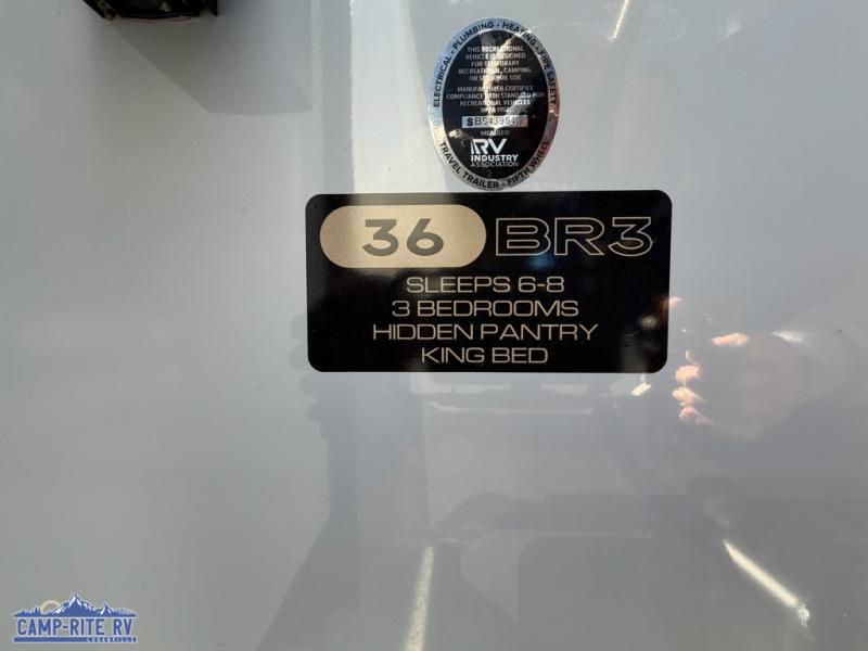 This 36BR3 model is designed for both comfort and practicality, starting at the rear with a private bedroom featuring two 36" x 74" twin beds, each with its own curtain and plenty of storage drawers underneath, plus doors for added privacy. In the middle, the main living area offers a cozy chaise lounge perfect for relaxing in front of the TV and fireplace, with a hidden pantry tucked behind for smart storage. A central bar top with chairs creates the perfect gathering spot for meals, games, or evening drinks. The well-equipped kitchen makes cooking a breeze with a 16-cu. ft. refrigerator, microwave, 21" range, and abundant overhead cabinets for all your essentials. The full bathroom includes a walk-in shower with skylight and a linen closet for extra convenience. At the front, the private bedroom provides a luxurious retreat with a king bed featuring Versa Tilt technology, a dresser, bench, and a spacious wardrobe to keep everything organized.