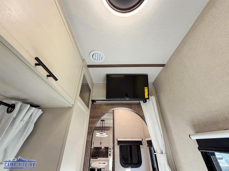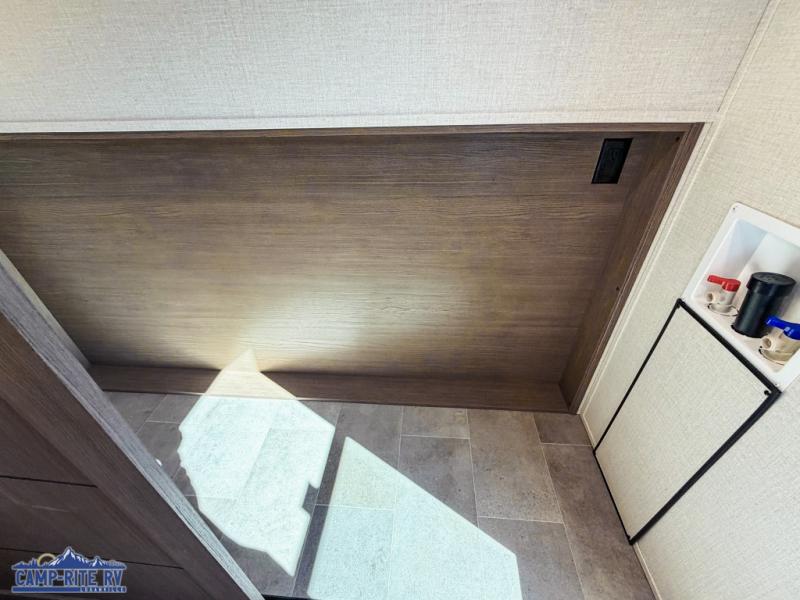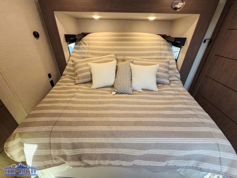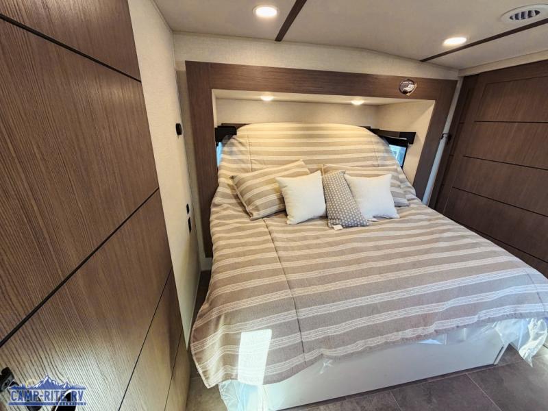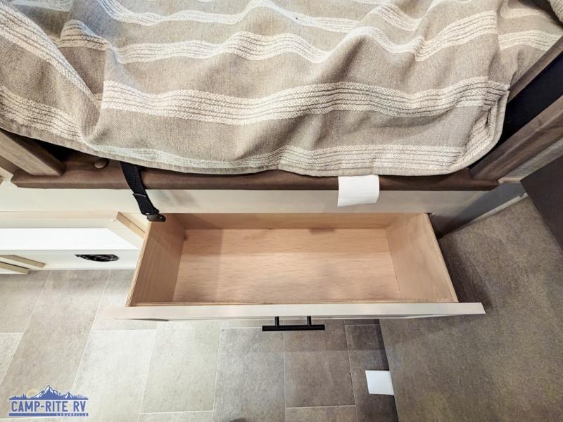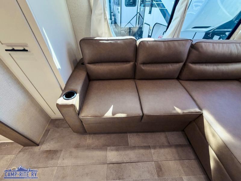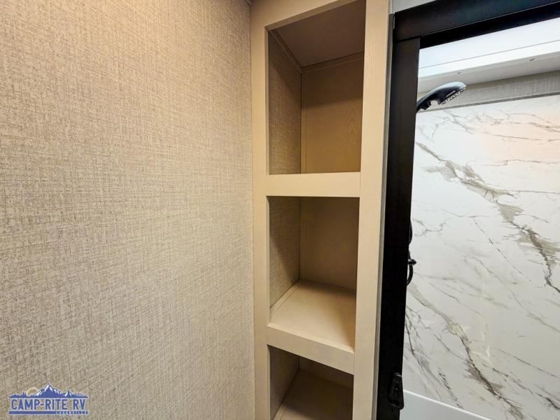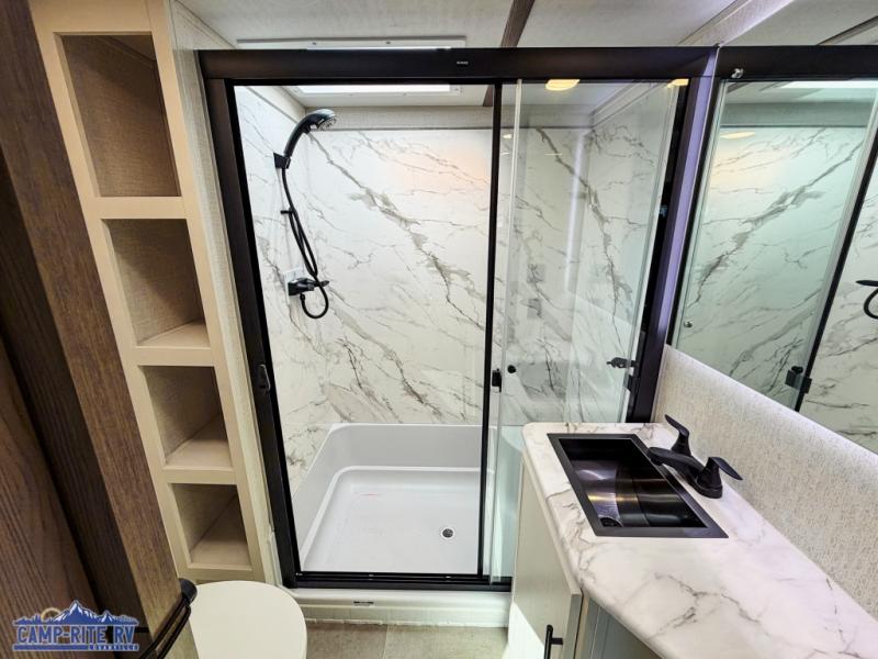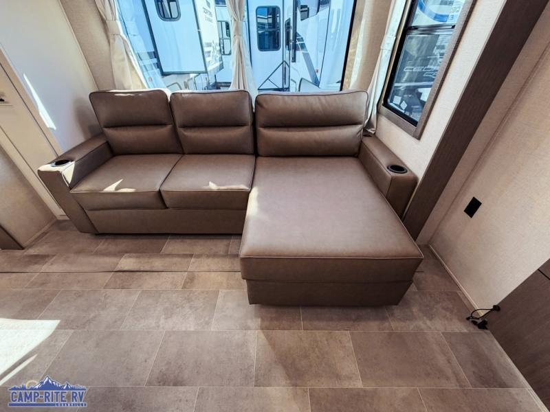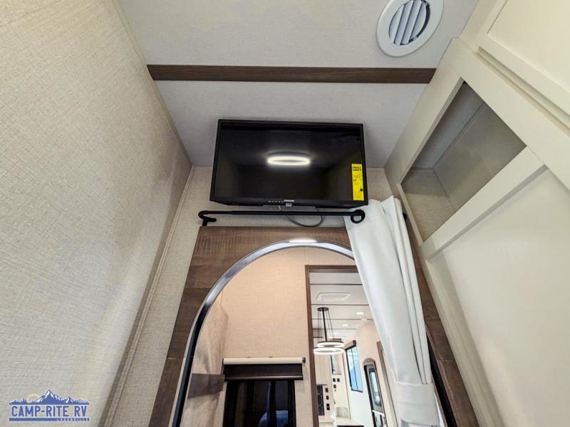 This 36BR3 model is designed for both comfort and practicality, starting at the rear with a private bedroom featuring two 36" x 74" twin beds, each with its own curtain and plenty of storage drawers underneath, plus doors for added privacy. In the middle, the main living area offers a cozy chaise lounge perfect for relaxing in front of the TV and fireplace, with a hidden pantry tucked behind for smart storage. A central bar top with chairs creates the perfect gathering spot for meals, games, or evening drinks. The well-equipped kitchen makes cooking a breeze with a 16-cu. ft. refrigerator, microwave, 21" range, and abundant overhead cabinets for all your essentials. The full bathroom includes a walk-in shower with skylight and a linen closet for extra convenience. At the front, the private bedroom provides a luxurious retreat with a king bed featuring Versa Tilt technology, a dresser, bench, and a spacious wardrobe to keep everything organized.