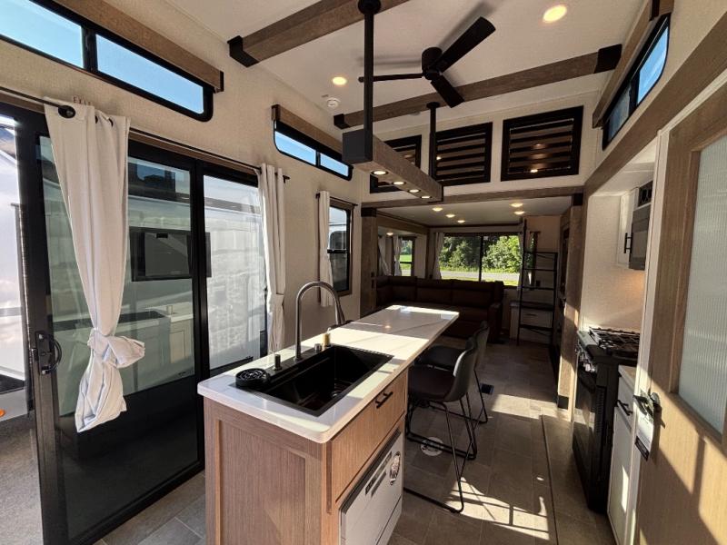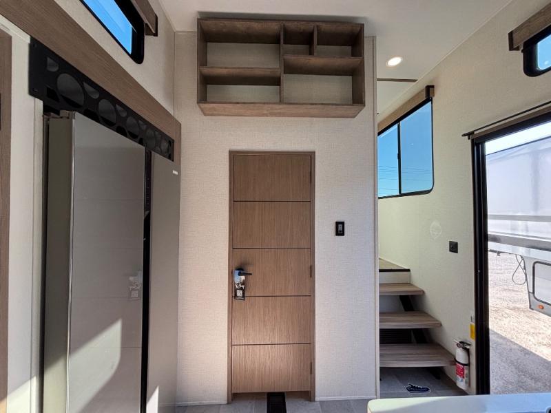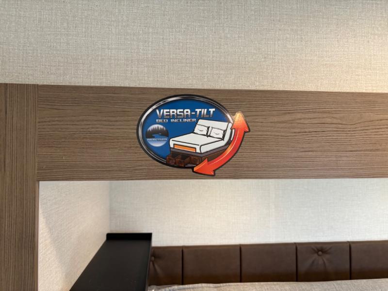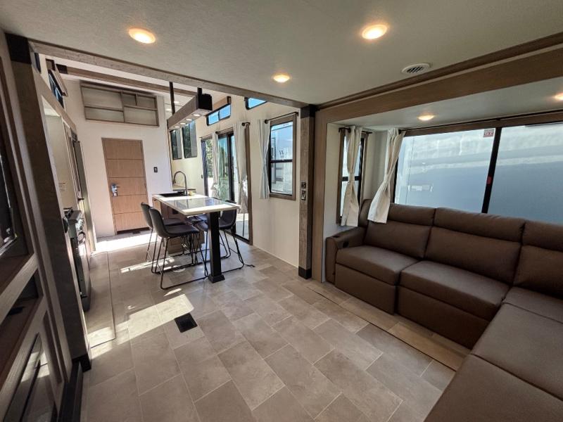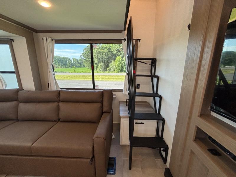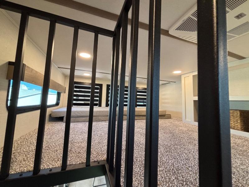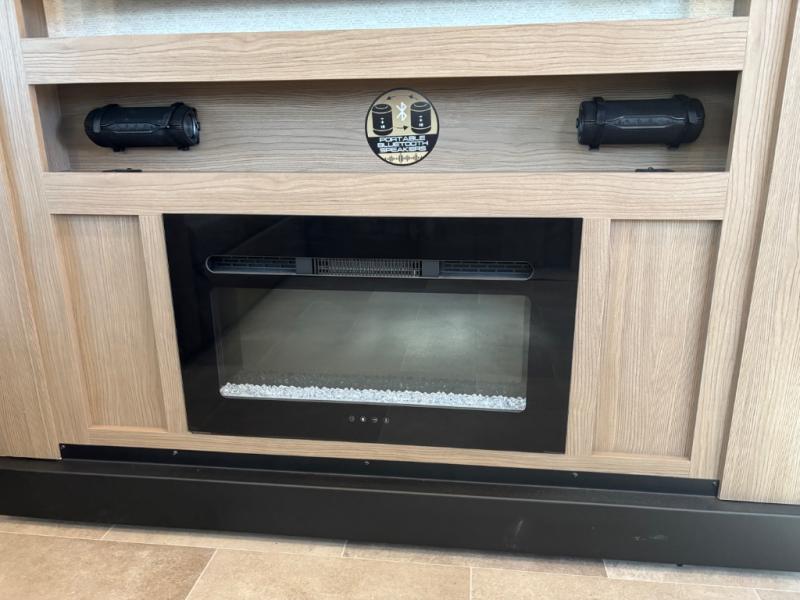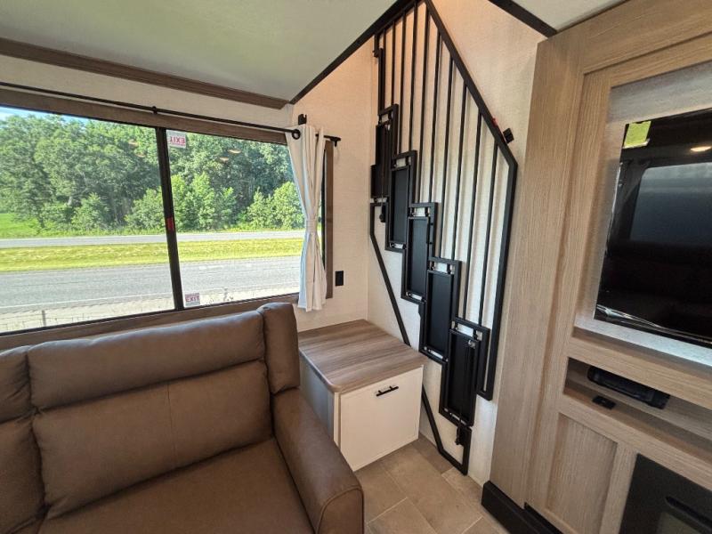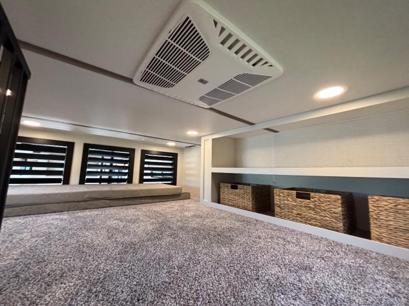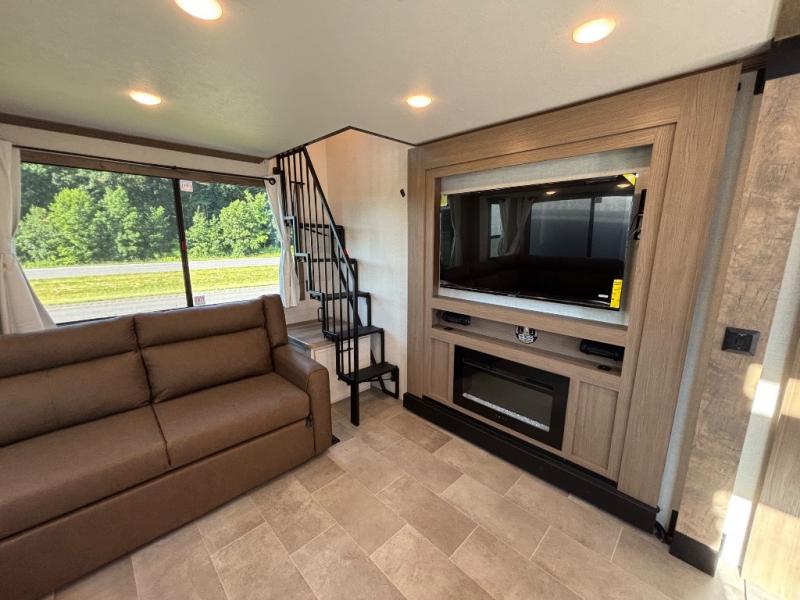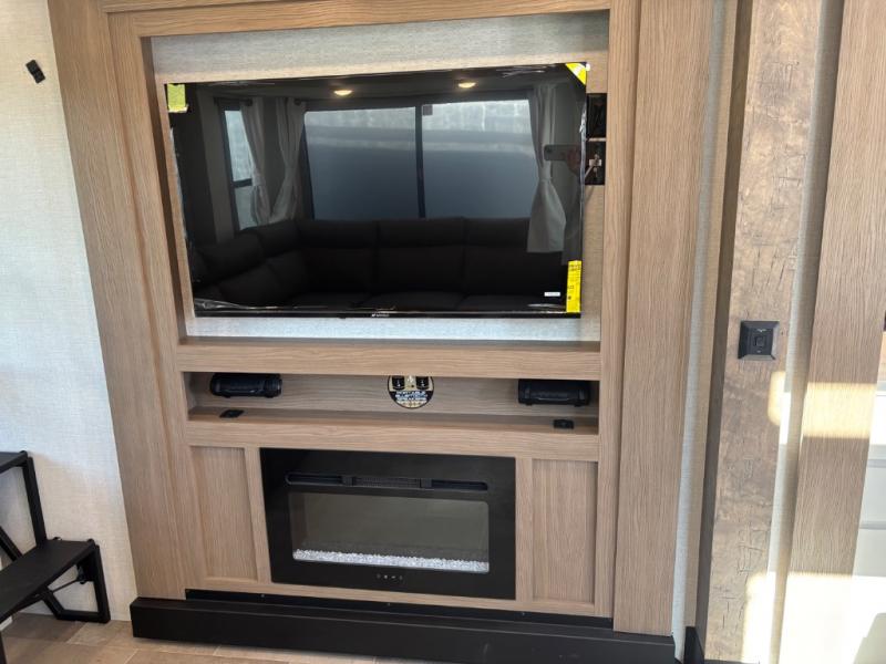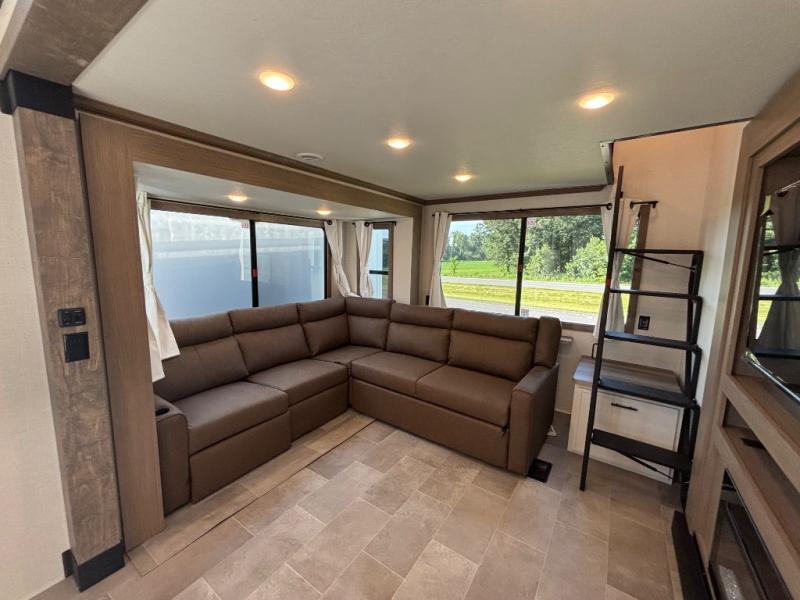 Plan to stay awhile in this four slide out fifth wheel! There is a triple-slide patio door that opens into the kitchen, complete with a kitchen island, walk-in pantry and 16 cu. ft. 12V refrigerator, and a convenient half bath with storage. There are reclining theater seats with a chaise lounge across from an entertainment center and fireplace with hidden storage behind. The fold-up steps lead up to the loft that includes two bunk mats, a wardrobe, cubby storage, plus two windows, which will make this space bright and open. The full bath towards the front includes washer/dryer prep, a walk-in shower with a skylight, and a linen closet to keep towels close by. And you'll love having your own bedroom up front with a king bed with Versa Tilt, a dresser with a bench, and a front wardrobe to keep your clothes wrinkle-free!