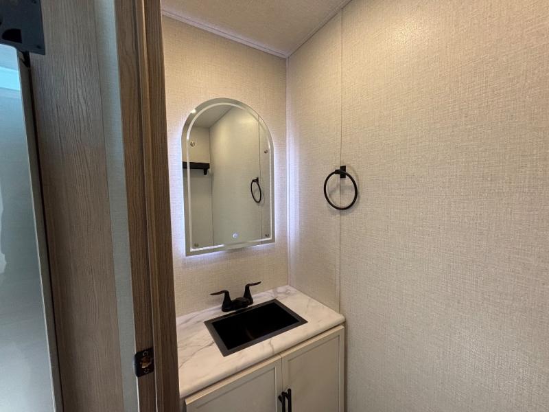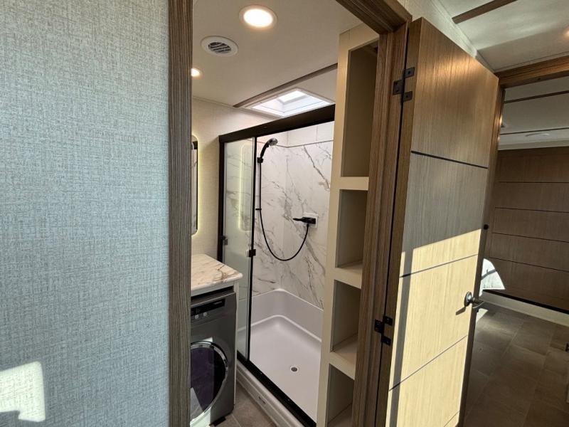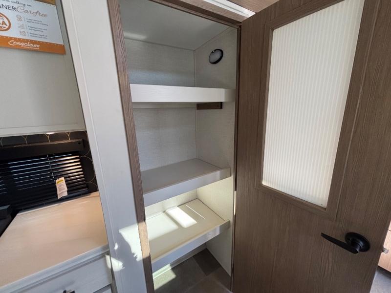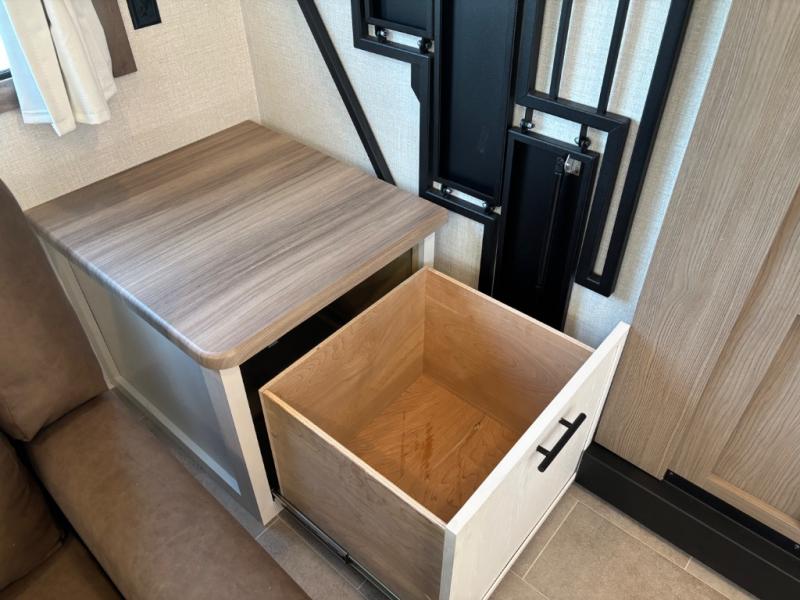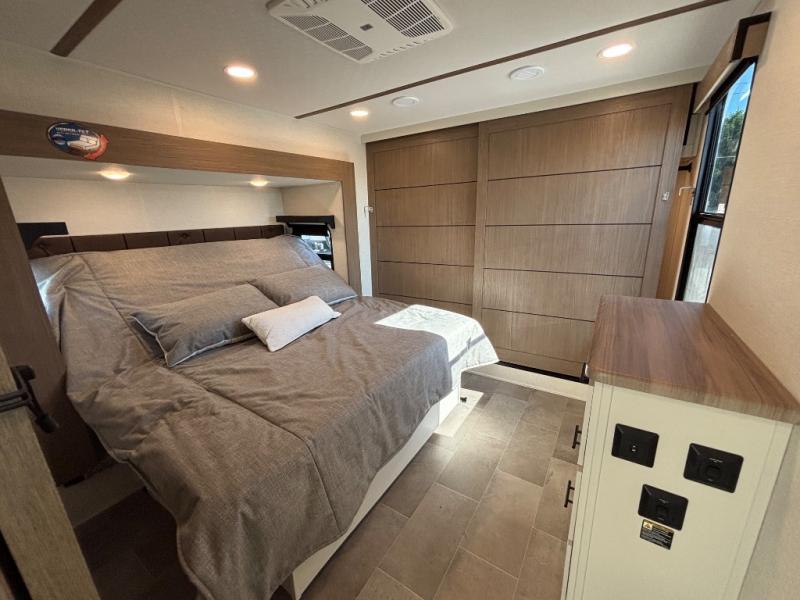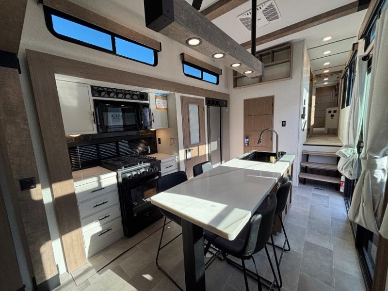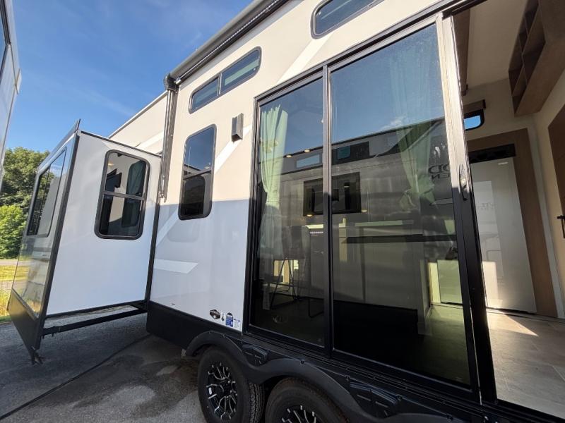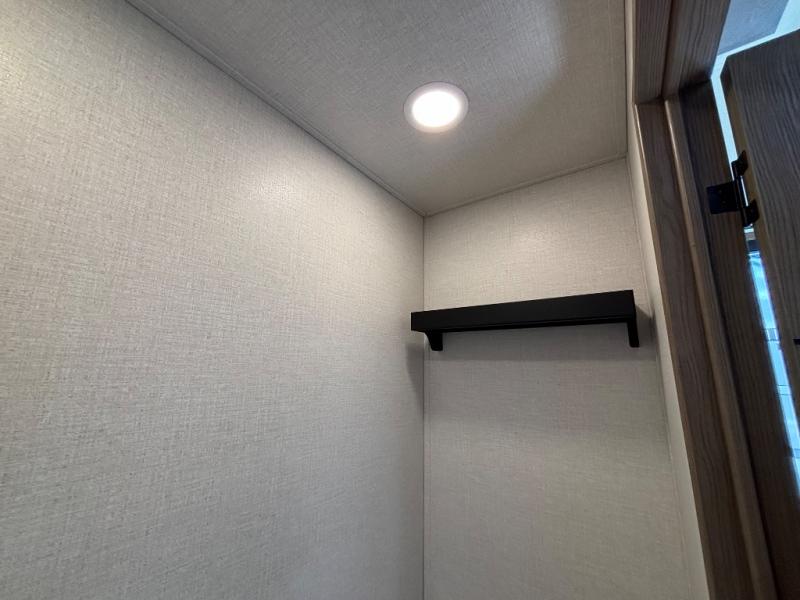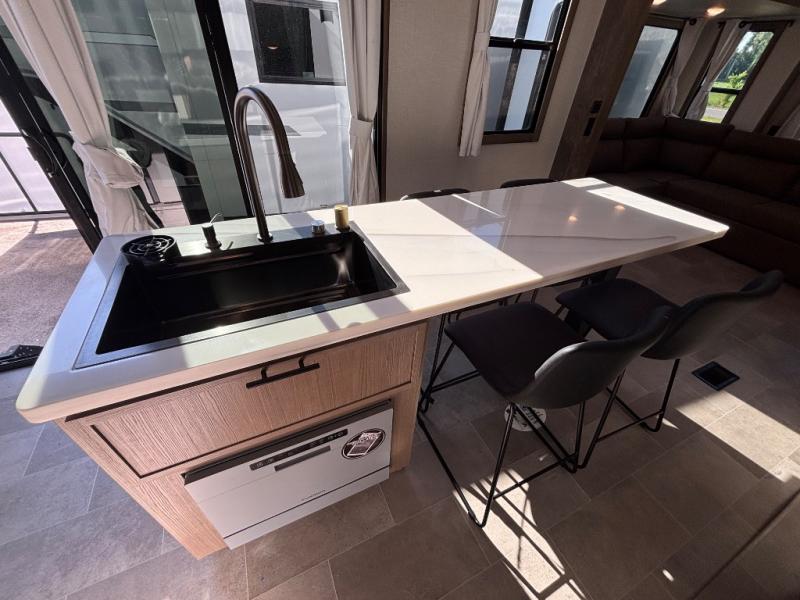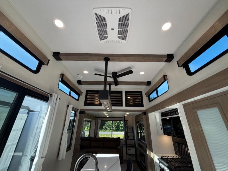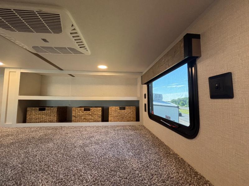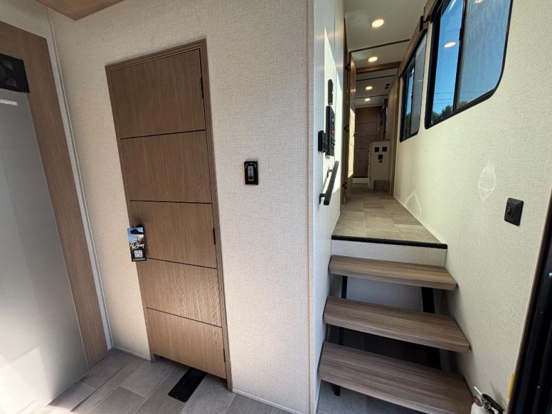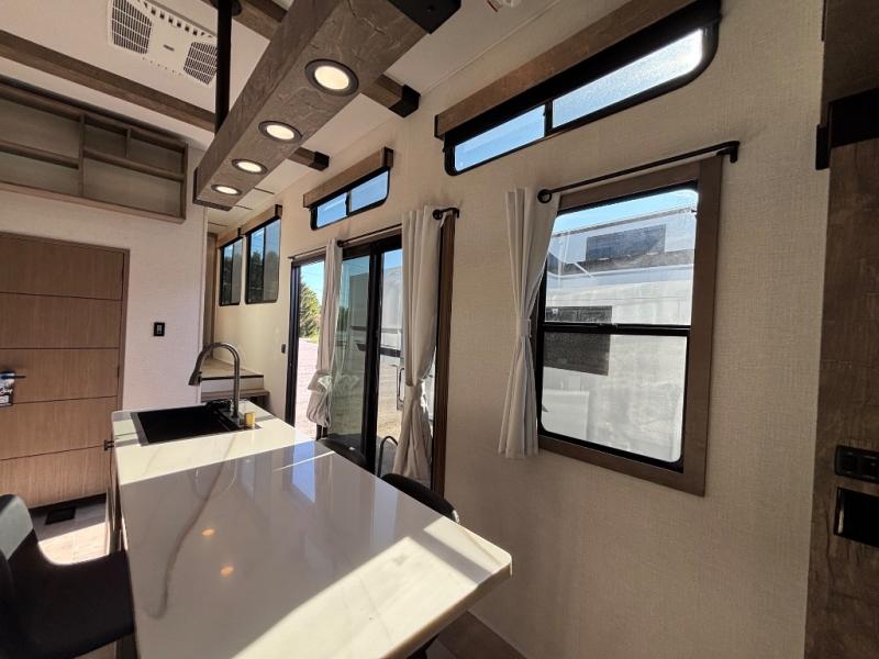 Plan to stay awhile in this four slide out fifth wheel! There is a triple-slide patio door that opens into the kitchen, complete with a kitchen island, walk-in pantry and 16 cu. ft. 12V refrigerator, and a convenient half bath with storage. There are reclining theater seats with a chaise lounge across from an entertainment center and fireplace with hidden storage behind. The fold-up steps lead up to the loft that includes two bunk mats, a wardrobe, cubby storage, plus two windows, which will make this space bright and open. The full bath towards the front includes washer/dryer prep, a walk-in shower with a skylight, and a linen closet to keep towels close by. And you'll love having your own bedroom up front with a king bed with Versa Tilt, a dresser with a bench, and a front wardrobe to keep your clothes wrinkle-free!