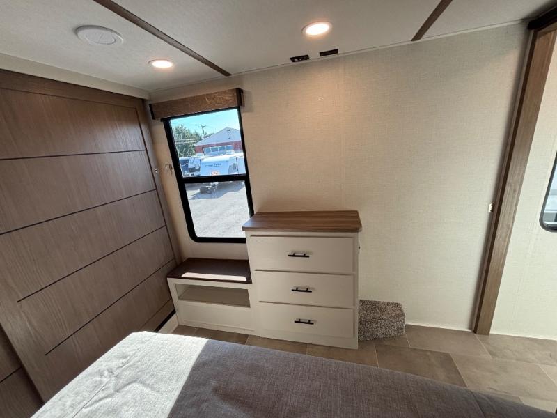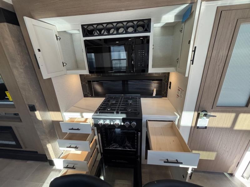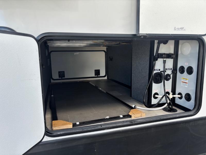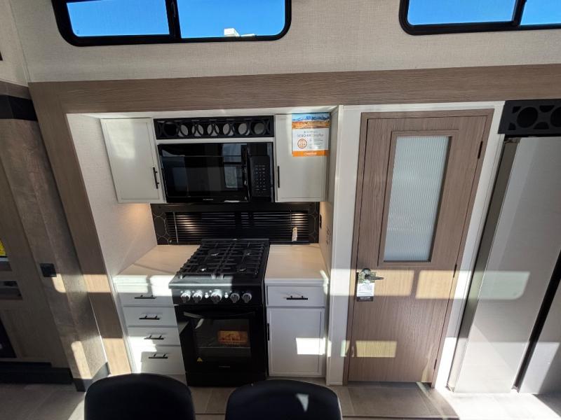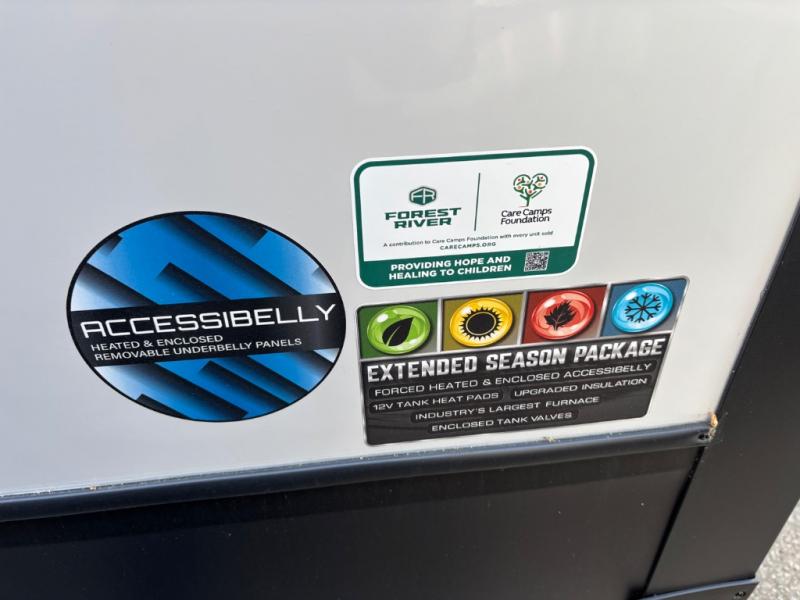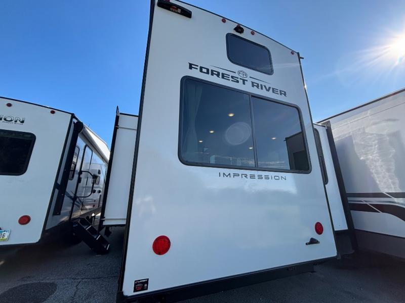 With any Impression mid-profile fifth wheel by Forest River, the focus of the design is comfort and value, built with quality craftsmanship and attention to customer's desires in each Impression! The exterior includes upgraded E-rated tires, custom exterior graphics package, and insulated slam latch baggage doors. There is also an enclosed docking station, an outside shower, and a 100W roof solar panel for off-grid capabilities. The fully heated and enclosed AccessiBelly has removable underbelly panels and offers four seasons of travel, and there is an industry leading 15K A/C plus 35K BTU furnace to keep you comfortable. The interior has lumbercore cabinetry, residential linoleum, residential backsplash in the kitchen, and oversized opening windows in the living area for more natural lighting and good air flow.