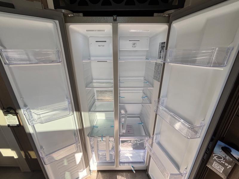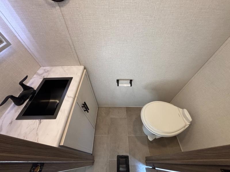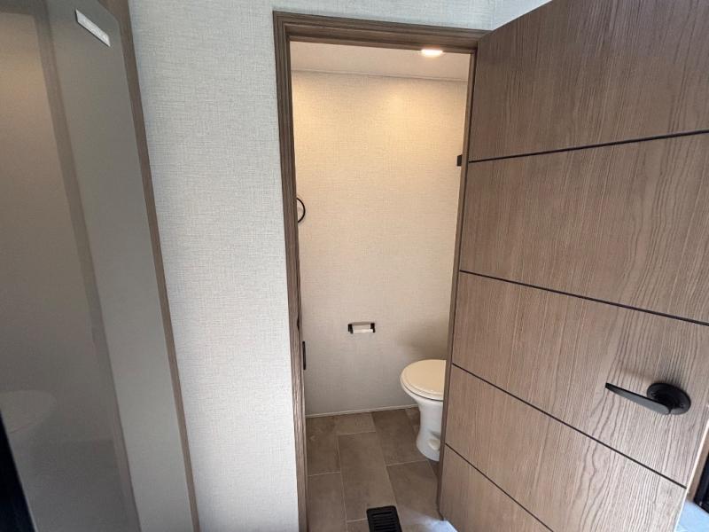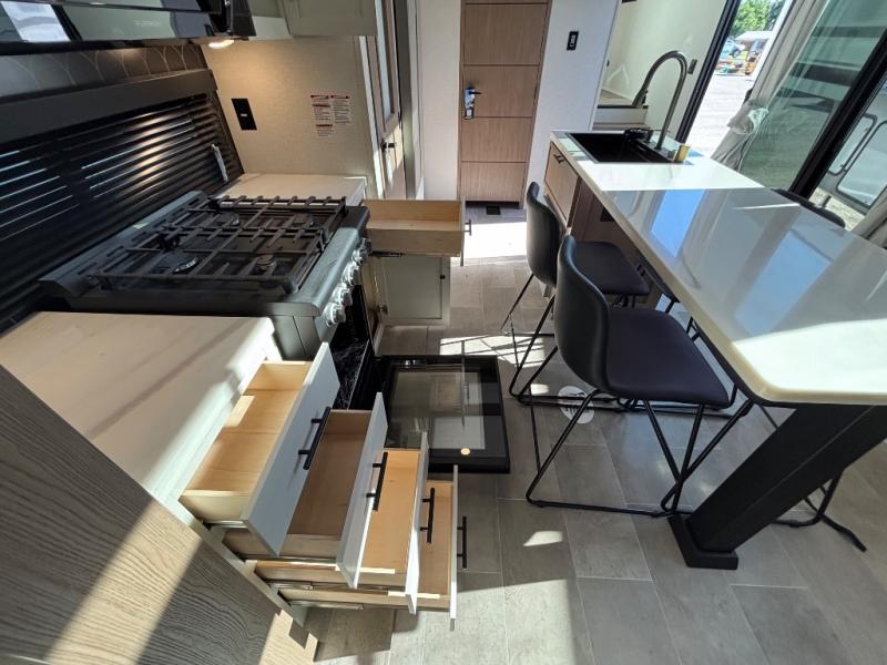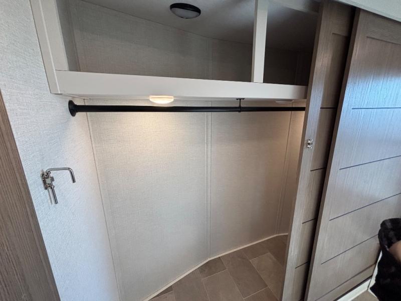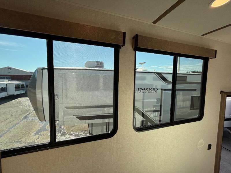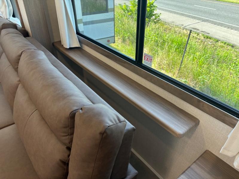 With any Impression mid-profile fifth wheel by Forest River, the focus of the design is comfort and value, built with quality craftsmanship and attention to customer's desires in each Impression! The exterior includes upgraded E-rated tires, custom exterior graphics package, and insulated slam latch baggage doors. There is also an enclosed docking station, an outside shower, and a 100W roof solar panel for off-grid capabilities. The fully heated and enclosed AccessiBelly has removable underbelly panels and offers four seasons of travel, and there is an industry leading 15K A/C plus 35K BTU furnace to keep you comfortable. The interior has lumbercore cabinetry, residential linoleum, residential backsplash in the kitchen, and oversized opening windows in the living area for more natural lighting and good air flow.
