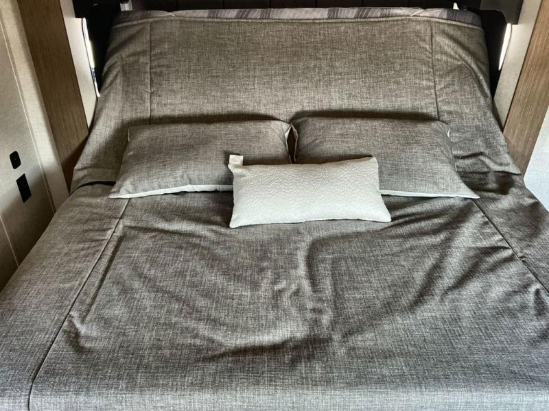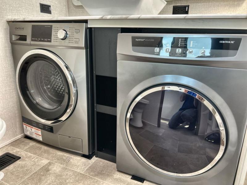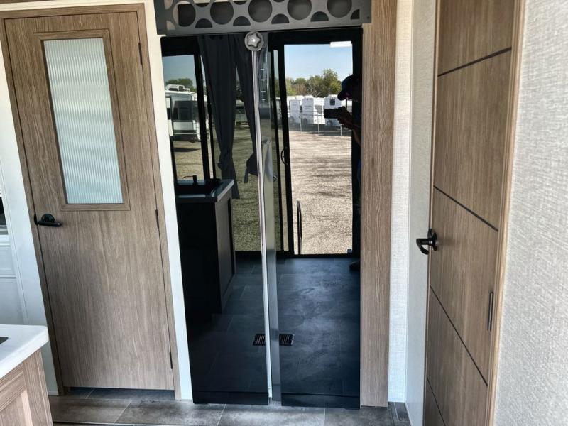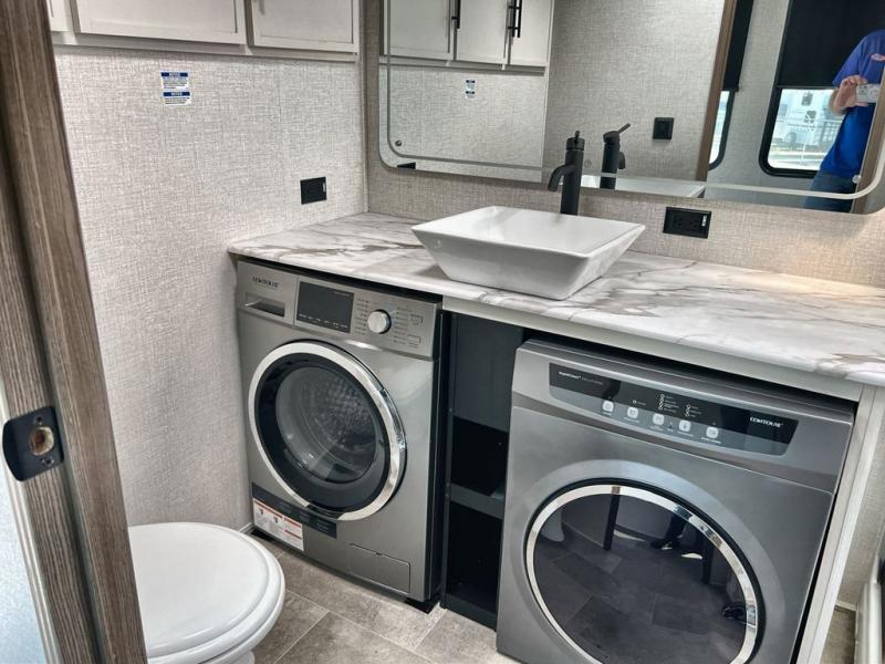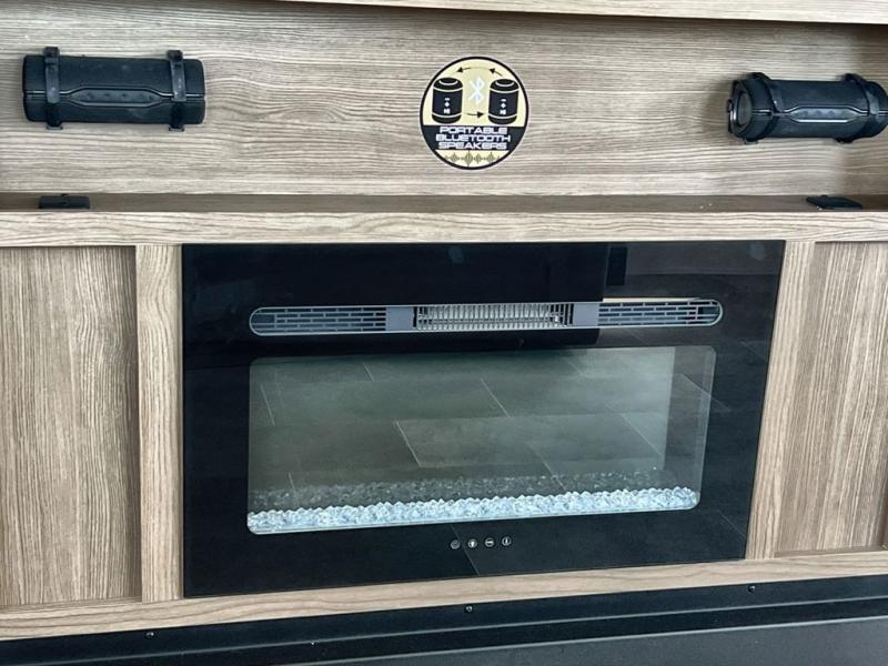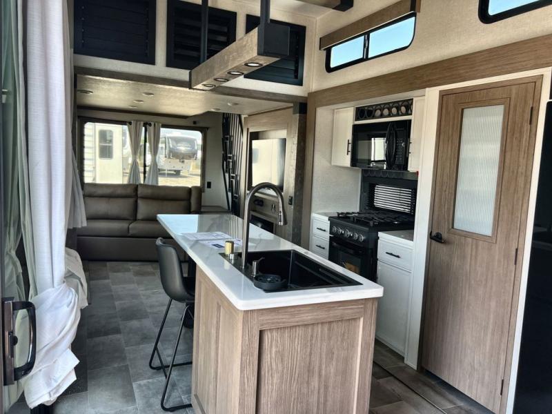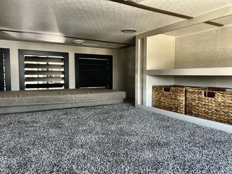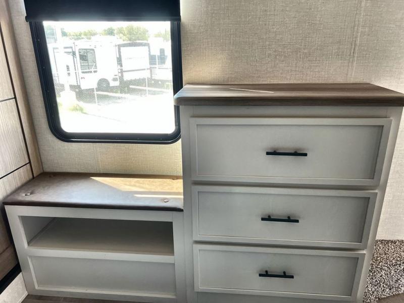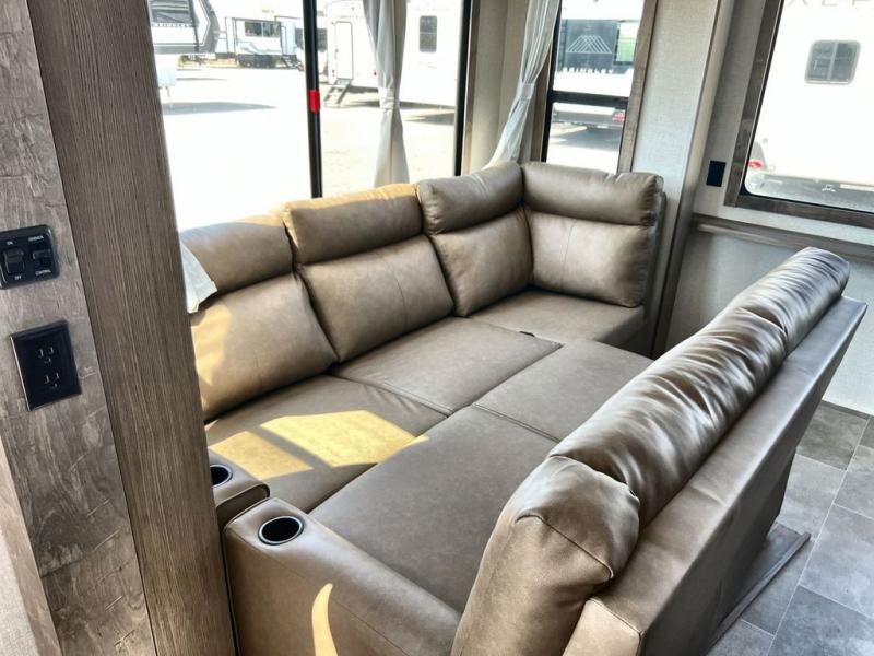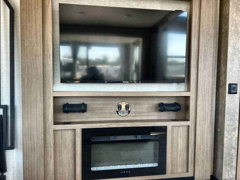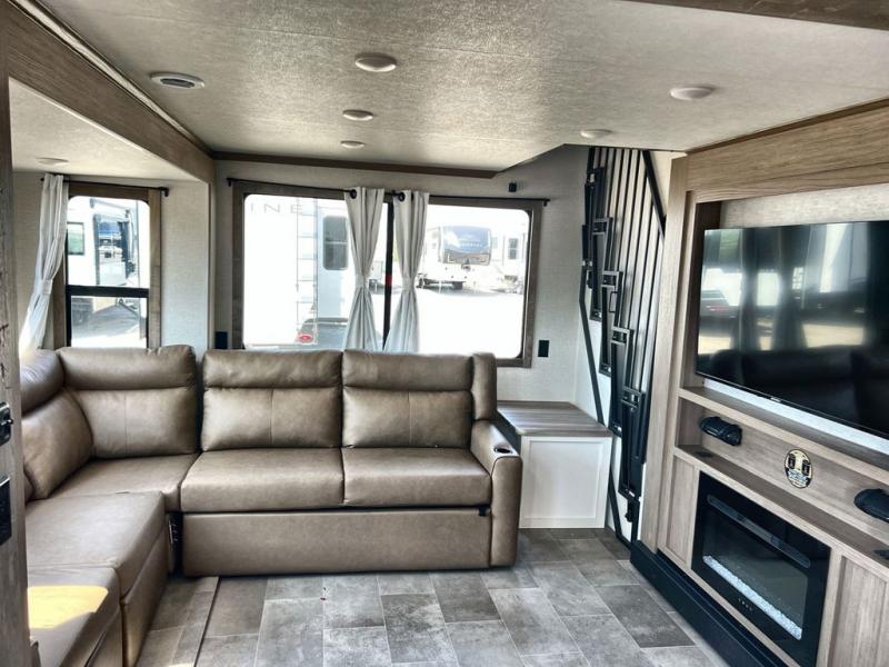 Stay in comfort with this four slide out fifth wheel! There is a triple-slide patio door that opens into the kitchen, complete with a kitchen island, floor to ceiling pantry and 16 cu. ft. 12V refrigerator, and a convenient half bath with storage. There are reclining seats with a chaise lounge across from an entertainment center and fireplace. The fold-up steps lead up to the loft that includes two bunk mats, a wardrobe, cubby storage, plus windows, which will make this space bright and open. The full bath towards the front includes washer/dryer prep, a walk-in shower with a skylight, and a linen closet to keep towels close by. And you'll love having your own bedroom up front with a king bed with Versa Tilt, a dresser with a bench, and a front wardrobe to keep your clothes wrinkle-free!