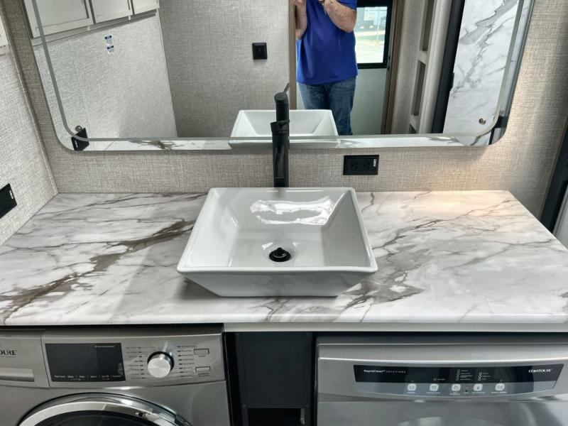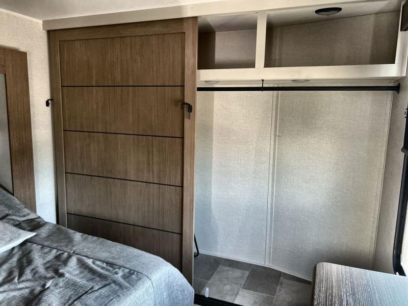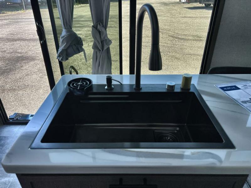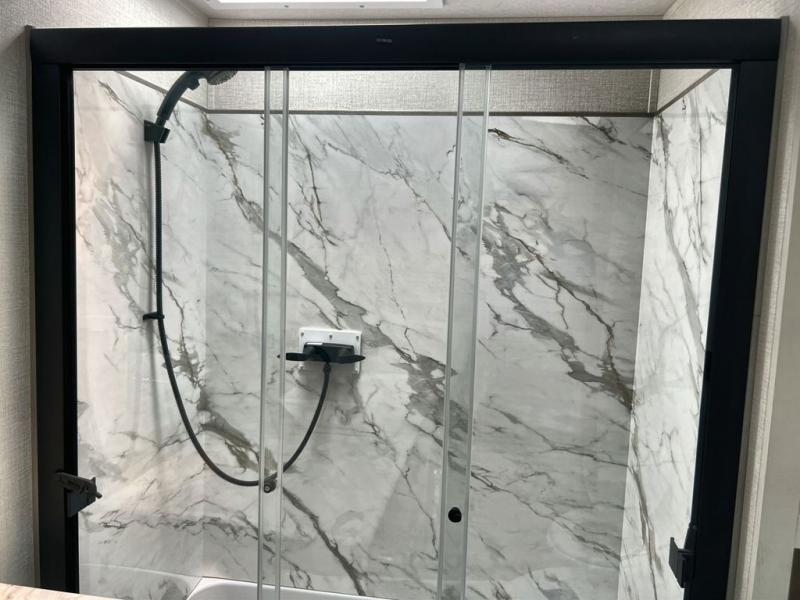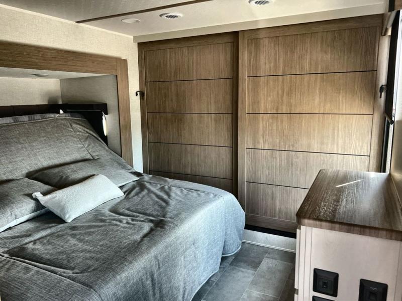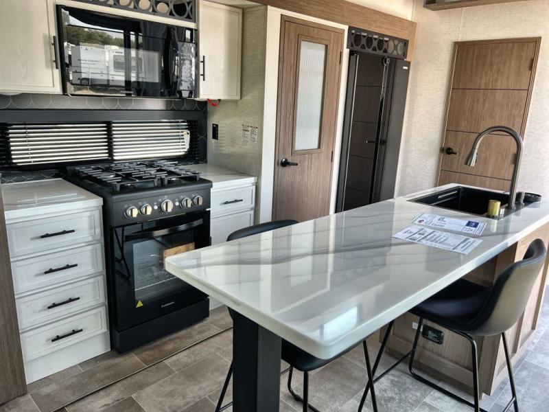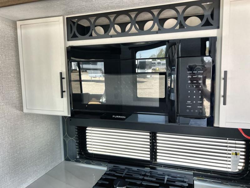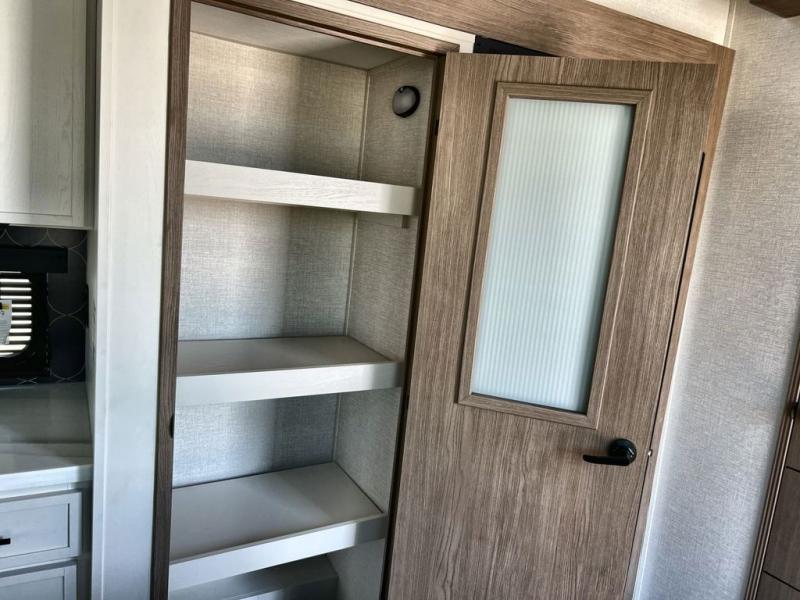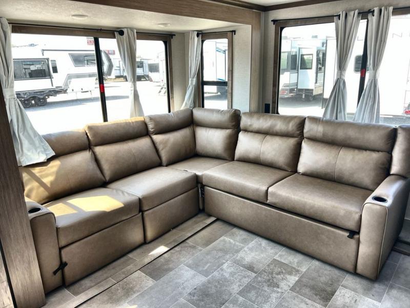 With any Impression fifth wheel by Forest River, the focus of the design is comfort and value, built with quality craftsmanship and attention to customer's desires in each Impression! The exterior includes upgraded E-rated tires, custom exterior graphics package, and insulated slam latch baggage doors. There is also an enclosed docking station, an outside shower, and a 100W roof panel for off-grid capabilities. The fully heated and enclosed AccessiBelly has removable underbelly panels along with enclosed tank valves. There is an industry leading 15K A/C plus 35K BTU furnace to keep you comfortable. The interior has lumbercore cabinetry, residential linoleum, residential backsplash in the kitchen, and oversized opening windows in the living area for more natural lighting and good air flow.