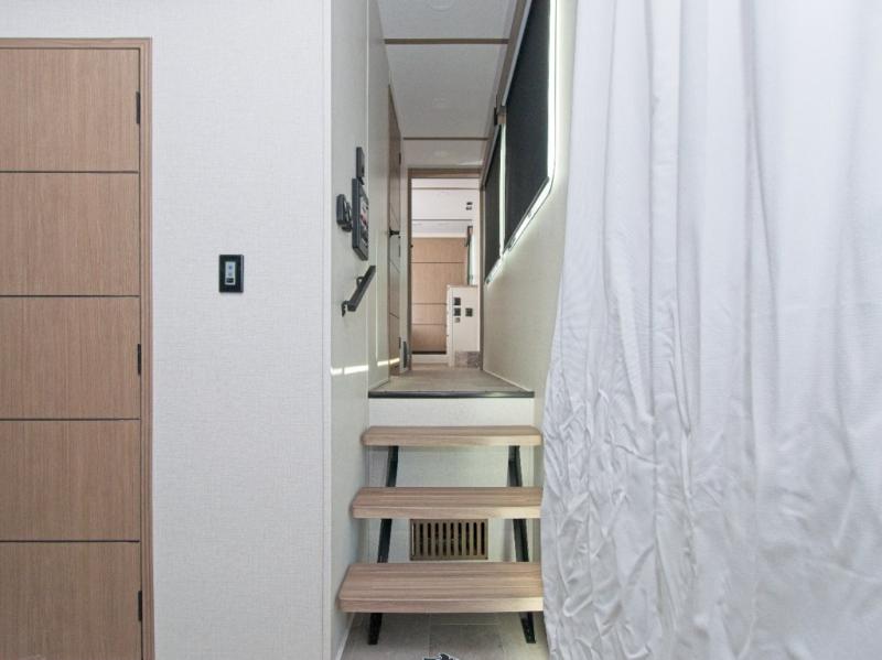 Upstairs, the loft area is a versatile space with two bunk mats, wardrobe, cubby storage, and windows that flood the space with natural light—ideal for kids, guests, or extra storage.
