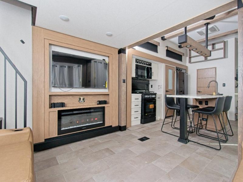 Step into a chef-inspired kitchen featuring a center island, floor-to-ceiling pantry, and a 16 cu. ft. 12V refrigerator. Enjoy meals or entertain guests at the island with included stools. A half bath adds convenience, while the main living area boasts reclining seats with a chaise lounge, positioned perfectly across from the entertainment center and cozy fireplace.