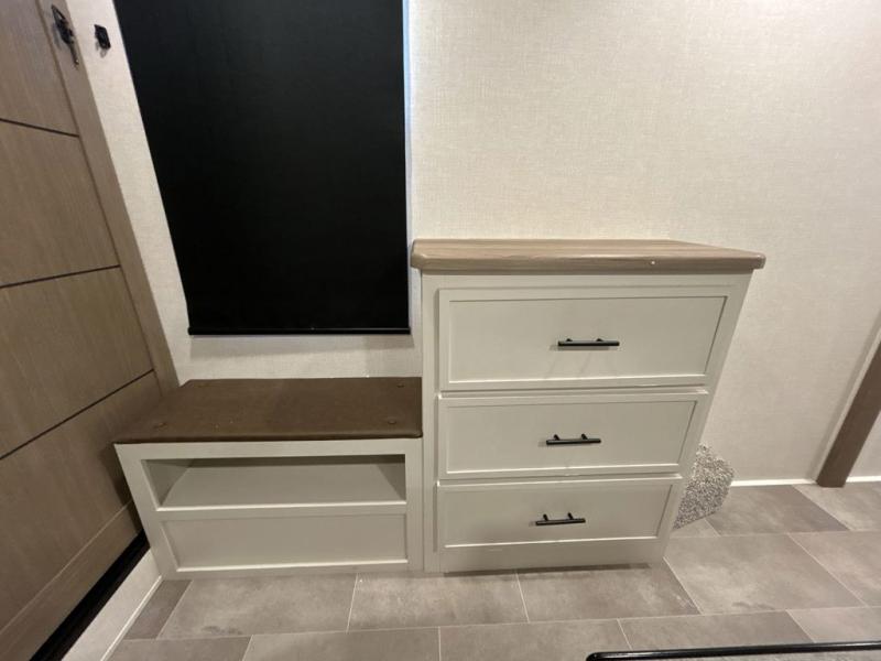 With any Impression mid-profile fifth wheel by Forest River, the focus of the design is comfort and value, built with quality craftsmanship and attention to customer's desires in each Impression! The exterior includes upgraded E-rated tires, custom exterior graphics package, and insulated slam latch baggage doors. There is also an enclosed docking station, an outside shower, and a 100W roof solar panel for off-grid capabilities. The fully heated and enclosed AccessiBelly has removable underbelly panels and offers four seasons of travel, and there is an industry leading 15K A/C plus 35K BTU furnace to keep you comfortable. The interior has lumbercore cabinetry, residential linoleum, residential backsplash in the kitchen, and oversized opening windows in the living area for more natural lighting and good air flow.