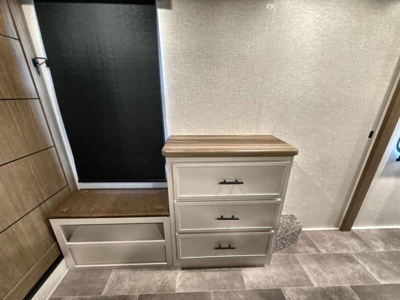 With any Impression mid-profile fifth wheel by Forest River, the focus of the design is comfort and value, built with quality craftsmanship and attention to customer's desires in each Impression! The exterior includes upgraded E-rated tires, custom exterior graphics package, and insulated slam latch baggage doors. There is also an enclosed docking station, an outside shower, and a 100W roof solar panel for off-grid capabilities. The fully heated and enclosed AccessiBelly has removable underbelly panels and offers four seasons of travel, and there is an industry leading 15K A/C plus 35K BTU furnace to keep you comfortable. The interior has lumbercore cabinetry, residential linoleum, residential backsplash in the kitchen, and oversized opening windows in the living area for more natural lighting and good air flow.