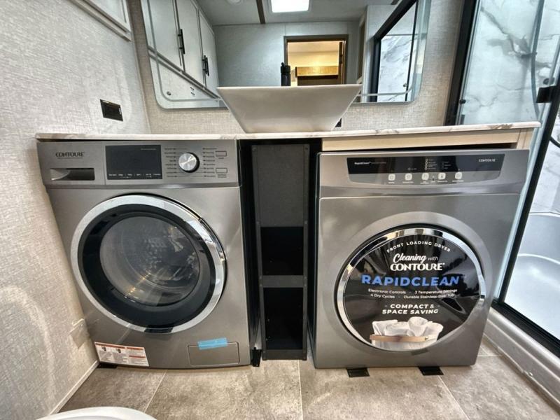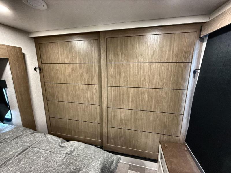 Plan to stay awhile in this four slide out fifth wheel! There is a triple-slide patio door that opens into the kitchen, complete with a kitchen island, walk-in pantry and 16 cu. ft. 12V refrigerator, and a convenient half bath with storage. There are reclining theater seats with a chaise lounge across from an entertainment center and fireplace with hidden storage behind. The fold-up steps lead up to the loft that includes two bunk mats, a wardrobe, cubby storage, plus two windows, which will make this space bright and open. The full bath towards the front includes washer/dryer prep, a walk-in shower with a skylight, and a linen closet to keep towels close by. And you'll love having your own bedroom up front with a king bed with Versa Tilt, a dresser with a bench, and a front wardrobe to keep your clothes wrinkle-free!