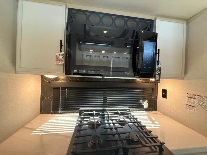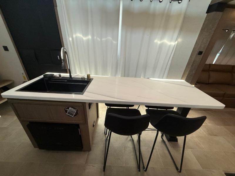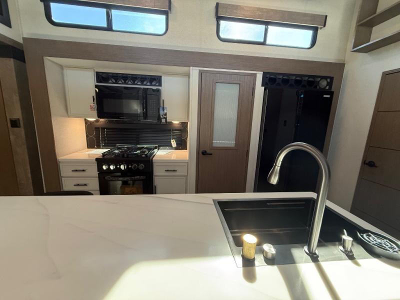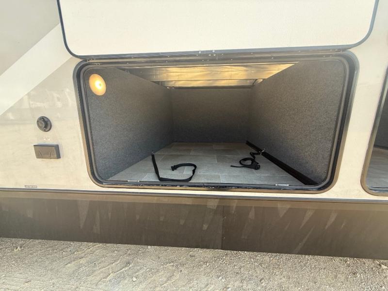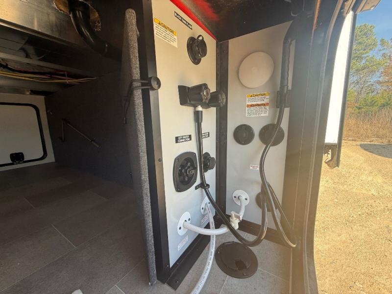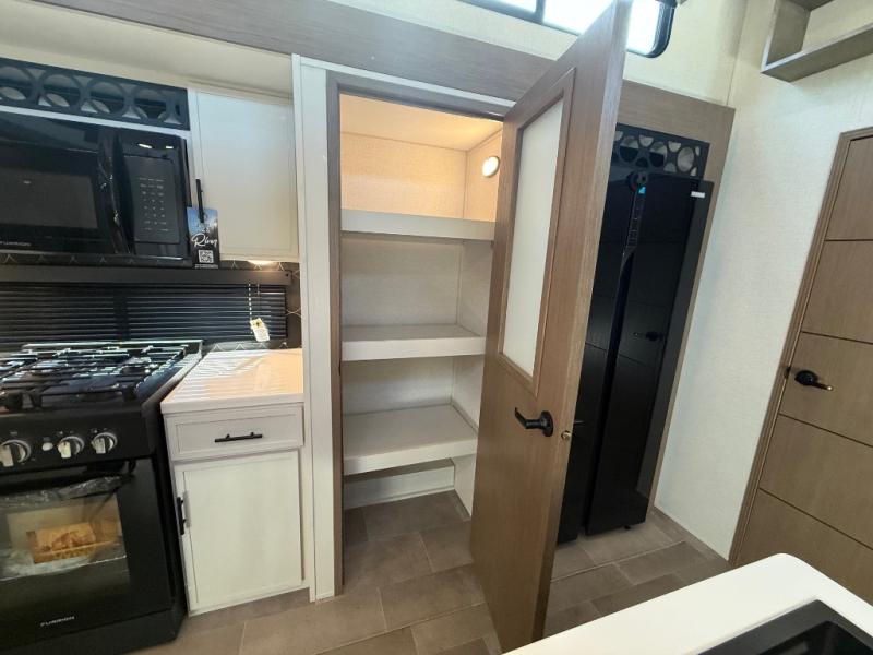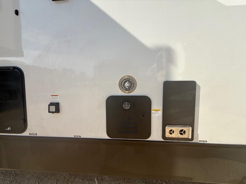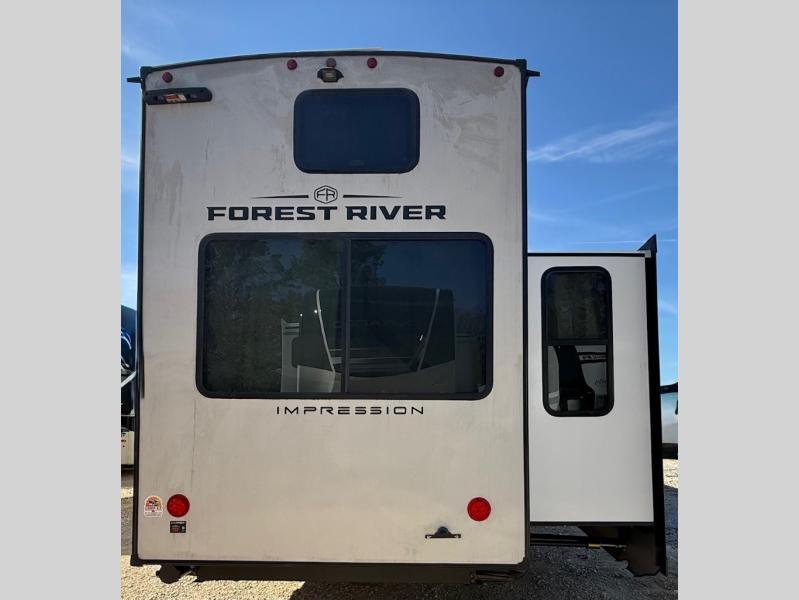 With any Impression fifth wheel by Forest River, the focus of the design is comfort and value, built with quality craftsmanship and attention to customer's desires in each Impression! The exterior includes upgraded E-rated tires, custom exterior graphics package, and insulated slam latch baggage doors. There is also an enclosed docking station, an outside shower, and a 100W roof panel for off-grid capabilities. The fully heated and enclosed AccessiBelly has removable underbelly panels along with enclosed tank valves. There is an industry leading 15K A/C plus 35K BTU furnace to keep you comfortable. The interior has lumbercore cabinetry, residential linoleum, residential backsplash in the kitchen, and oversized opening windows in the living area for more natural lighting and good air flow.