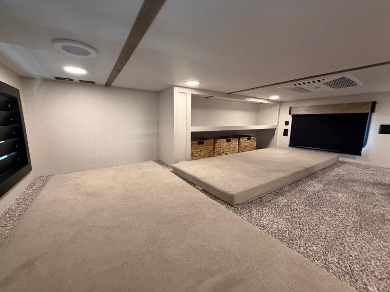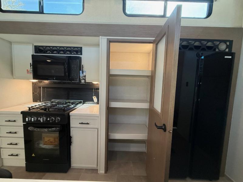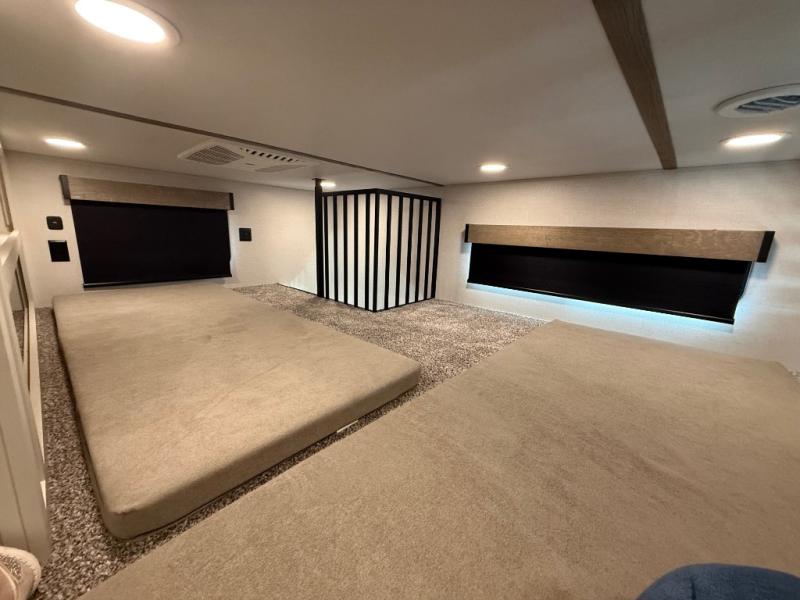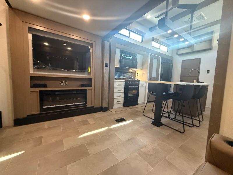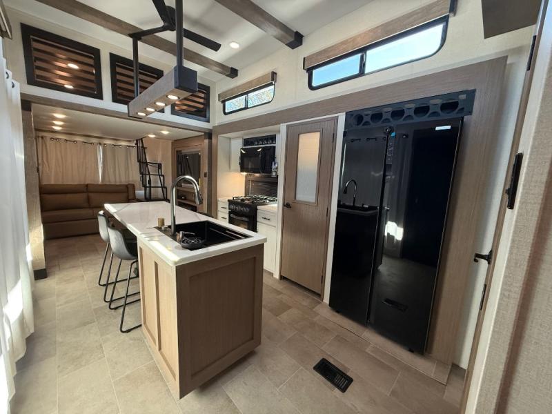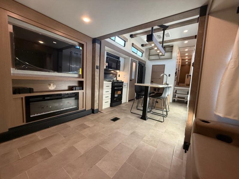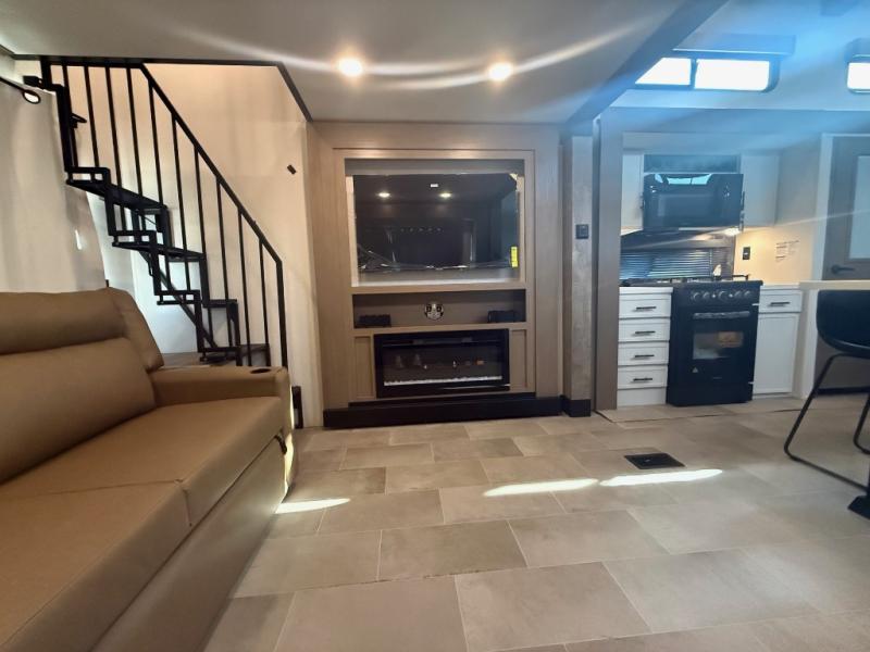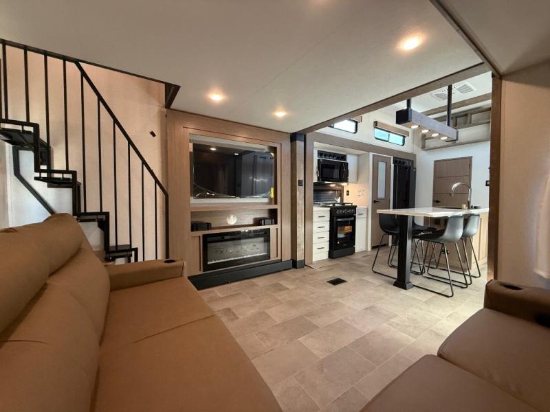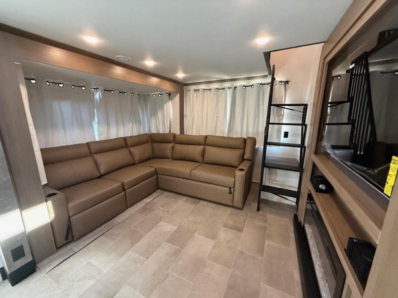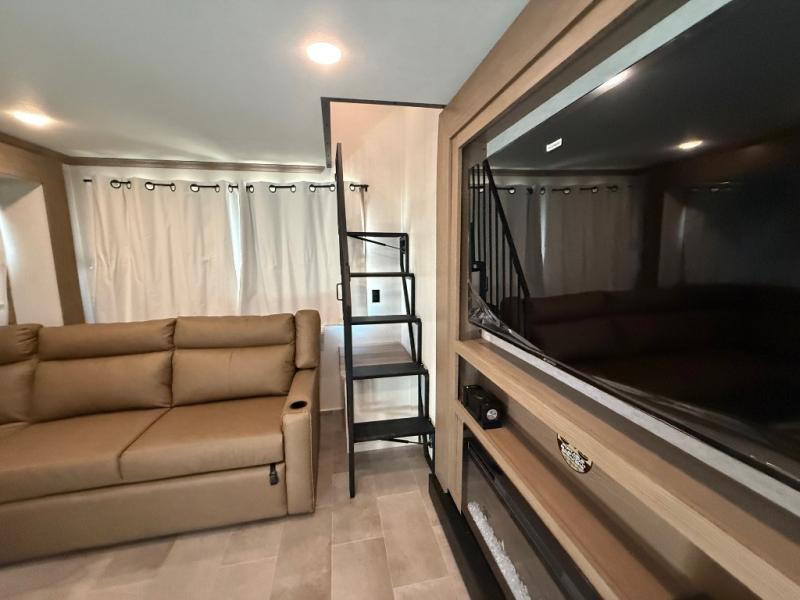 Stay in comfort with this four slide out fifth wheel! There is a triple-slide patio door that opens into the kitchen, complete with a kitchen island, floor to ceiling pantry and 16 cu. ft. 12V refrigerator, and a convenient half bath with storage. There are reclining seats with a chaise lounge across from an entertainment center and fireplace. The fold-up steps lead up to the loft that includes two bunk mats, a wardrobe, cubby storage, plus windows, which will make this space bright and open. The full bath towards the front includes washer/dryer prep, a walk-in shower with a skylight, and a linen closet to keep towels close by. And you'll love having your own bedroom up front with a king bed with Versa Tilt, a dresser with a bench, and a front wardrobe to keep your clothes wrinkle-free!