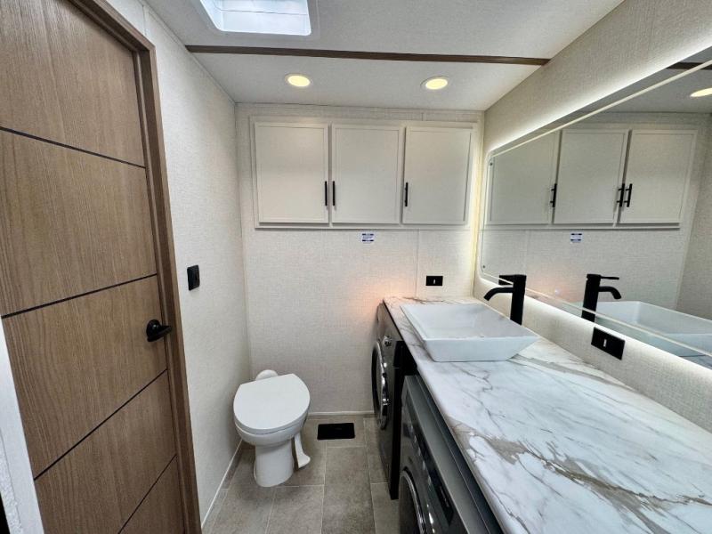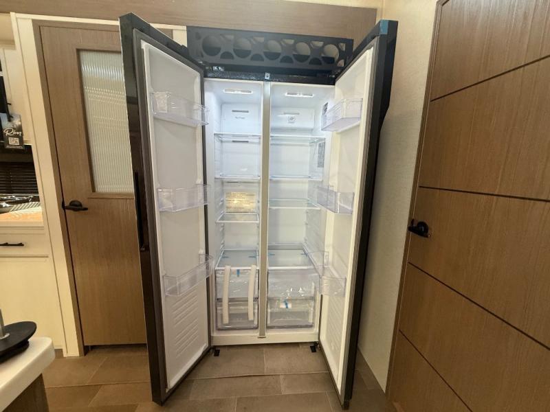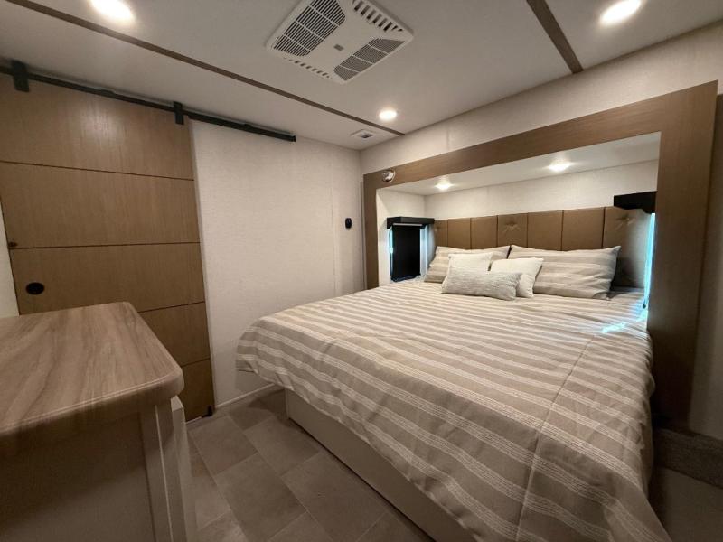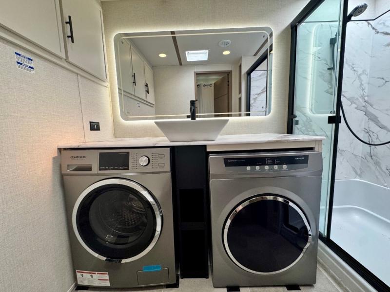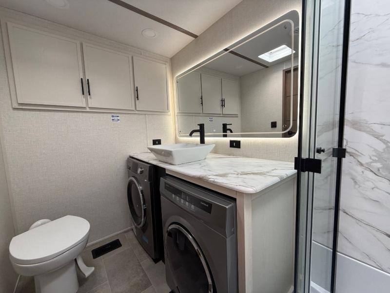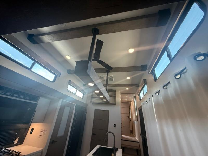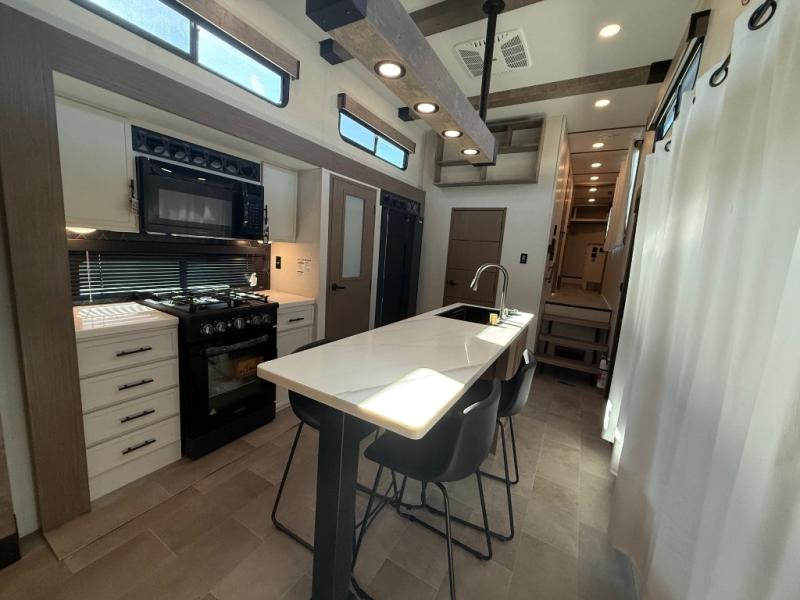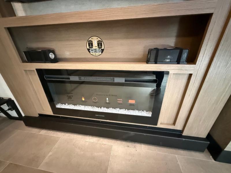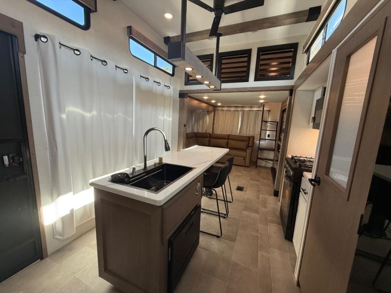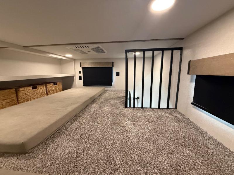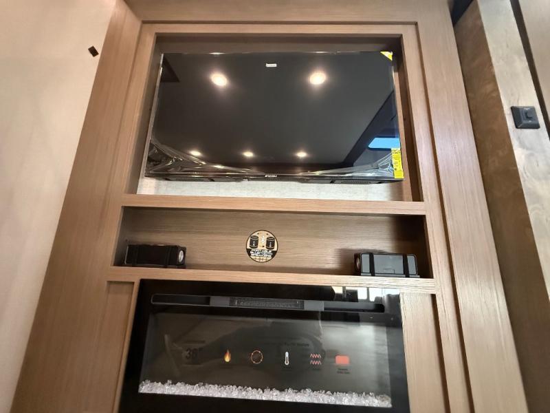 Stay in comfort with this four slide out fifth wheel! There is a triple-slide patio door that opens into the kitchen, complete with a kitchen island, floor to ceiling pantry and 16 cu. ft. 12V refrigerator, and a convenient half bath with storage. There are reclining seats with a chaise lounge across from an entertainment center and fireplace. The fold-up steps lead up to the loft that includes two bunk mats, a wardrobe, cubby storage, plus windows, which will make this space bright and open. The full bath towards the front includes washer/dryer prep, a walk-in shower with a skylight, and a linen closet to keep towels close by. And you'll love having your own bedroom up front with a king bed with Versa Tilt, a dresser with a bench, and a front wardrobe to keep your clothes wrinkle-free!