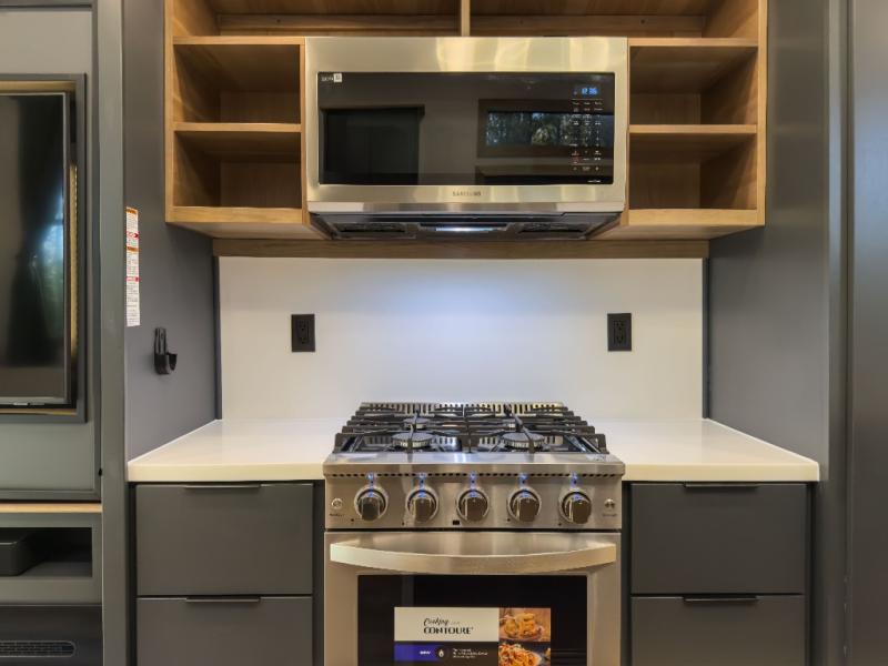 It won't be hard to find comfort in this dual slide, dual entry destination trailer! One of the entry doors conveniently opens to the front private bedroom where you'll find a queen bed slide out with a king bed option, dual closets with shelves in between, plus a dresser to keep everything tidy. If you have guests staying over, they can sleep on the L-shaped sleeper sofa in the rear living area, which is also directly across from the entertainment center for easy viewing. The chef of your group will love the spacious kitchen, complete with all the kitchen appliances to create their best meals and a large kitchen island with four chairs.