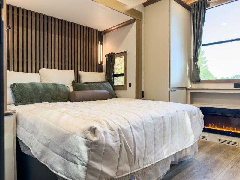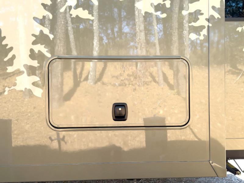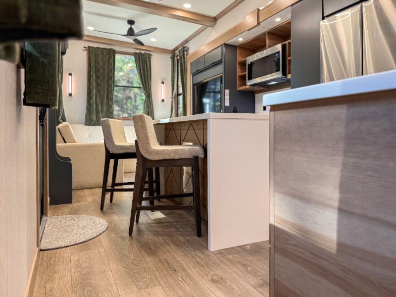Luxury abounds in the Lost Pines destination trailer by Forest River. Each model features 3" hung wall construction, a rolled fiberglass roof, a thermofoil lined underbelly, and an Azdel gel coat fiberglass exterior wall for added durability. The full-body paint with 4x Clear Coat is sure to turn heads as you travel to your destination, and the LCI Road Armor suspension system will provide a smooth tow. You'll also find dual 40 lb. LP tanks outside, along with a heated full docking station, and MORryde entry steps and Safe-T-Rail. The interior of the Lost Pines is outfitted with luxury vinyl flooring, residential appliances, LED lighting throughout, plus upgraded solid surface countertops and backsplash!