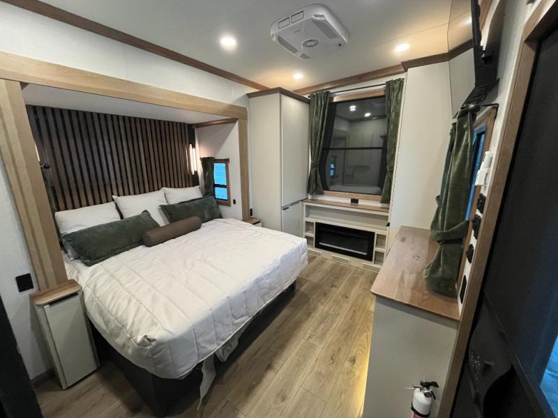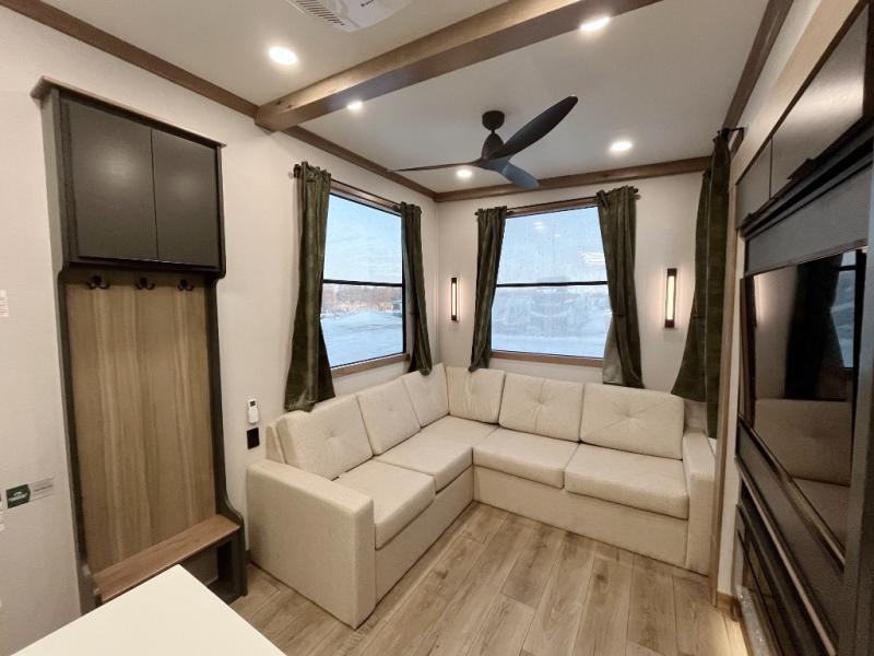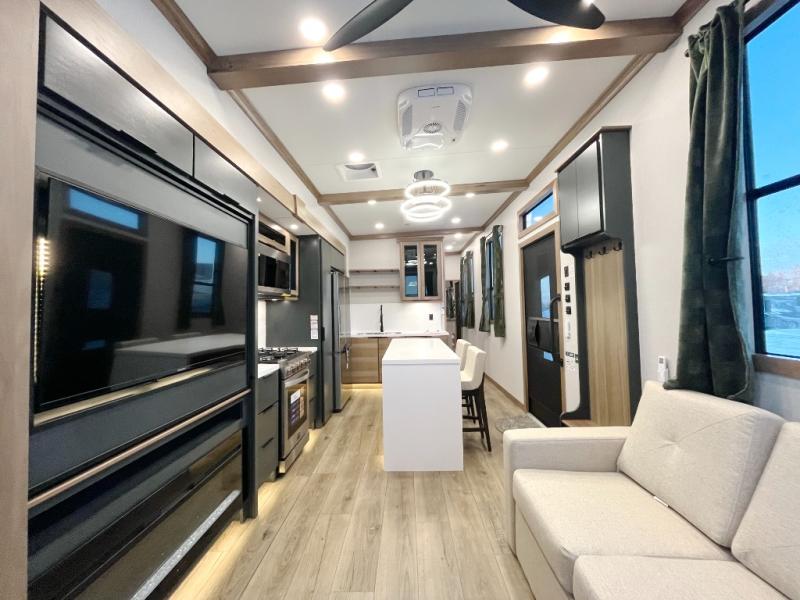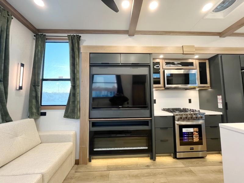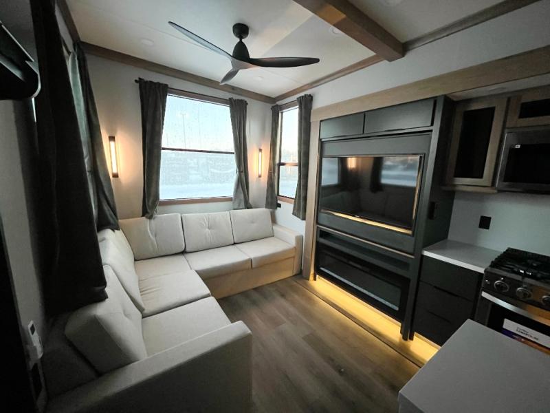 It won't be hard to find comfort in this dual slide, dual entry destination trailer! One of the entry doors conveniently opens to the front private bedroom where you'll find a queen bed slide out with a king bed option, dual closets with shelves in between, plus a dresser to keep everything tidy. If you have guests staying over, they can sleep on the L-shaped sleeper sofa in the rear living area, which is also directly across from the entertainment center for easy viewing. The chef of your group will love the spacious kitchen, complete with all the kitchen appliances to create their best meals and a large kitchen island with four chairs.