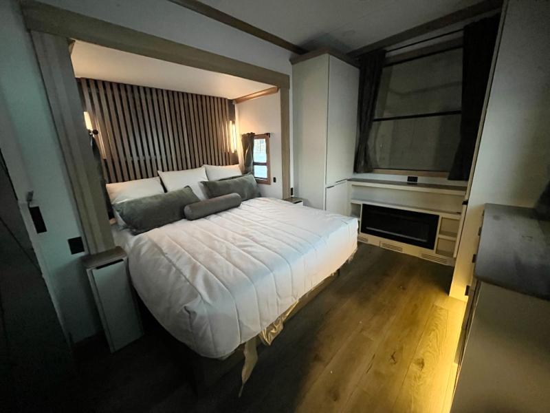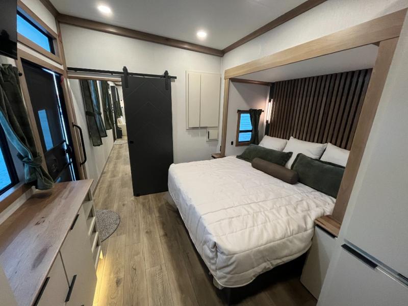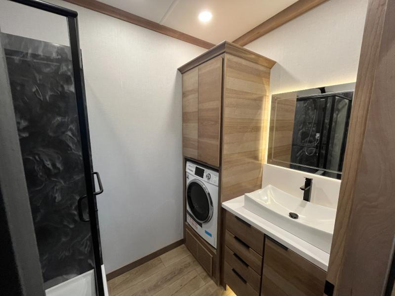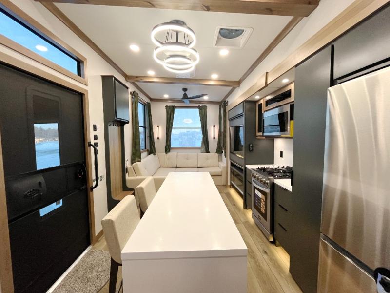 Luxury abounds in the Lost Pines destination trailer by Forest River. Each model features 3" hung wall construction, a rolled fiberglass roof, a thermofoil lined underbelly, and an Azdel gel coat fiberglass exterior wall for added durability. The full-body paint with 4x Clear Coat is sure to turn heads as you travel to your destination, and the LCI Road Armor suspension system will provide a smooth tow. You'll also find dual 40 lb. LP tanks outside, along with a heated full docking station, and MORryde entry steps and Safe-T-Rail. The interior of the Lost Pines is outfitted with luxury vinyl flooring, residential appliances, LED lighting throughout, plus upgraded solid surface countertops and backsplash!