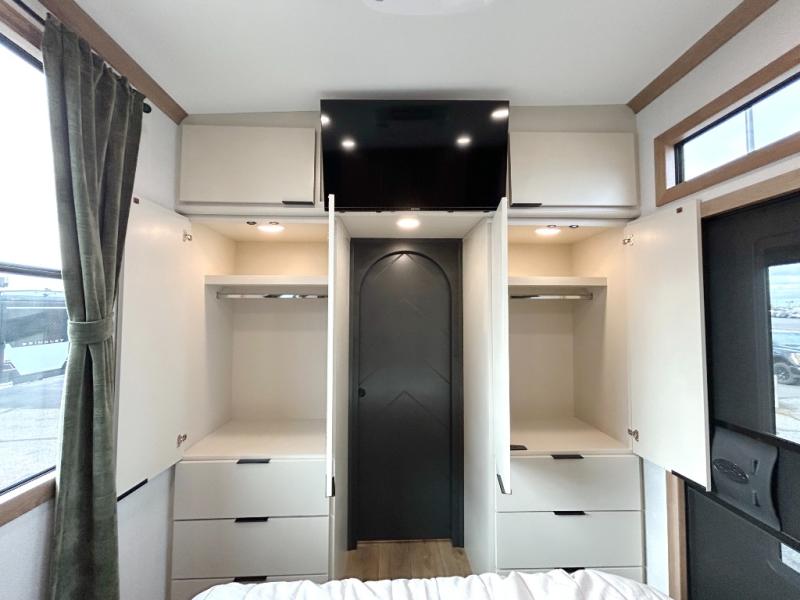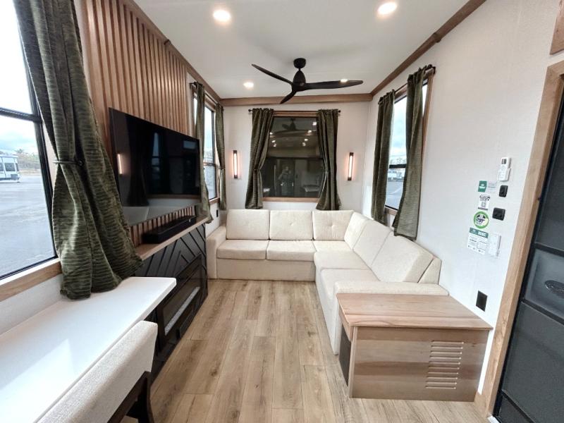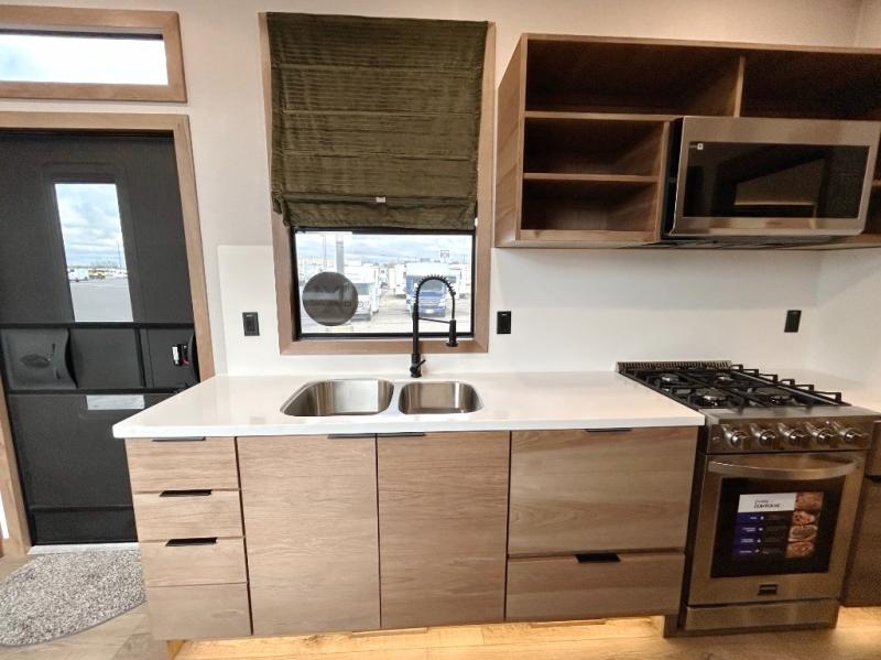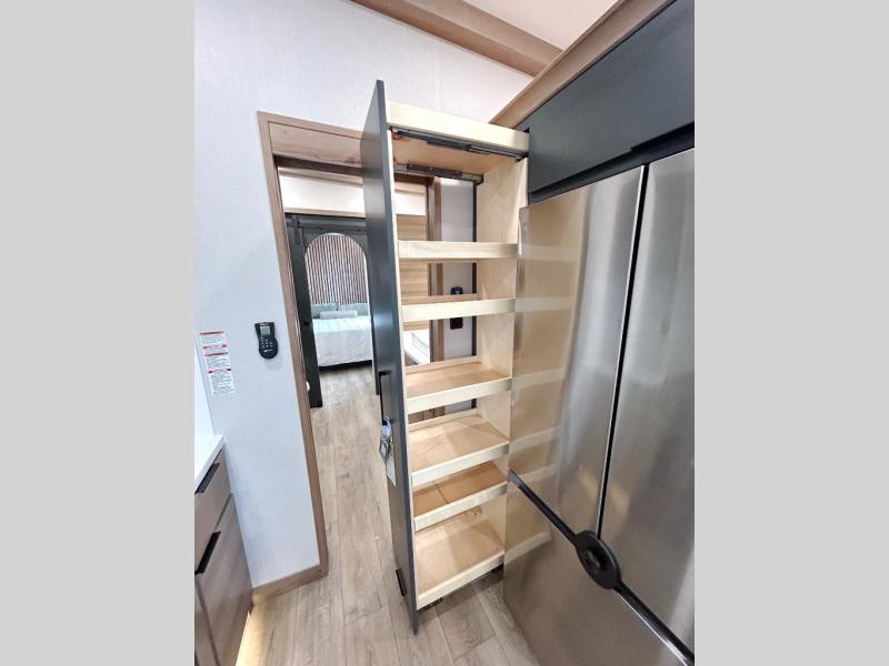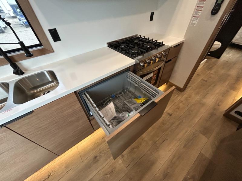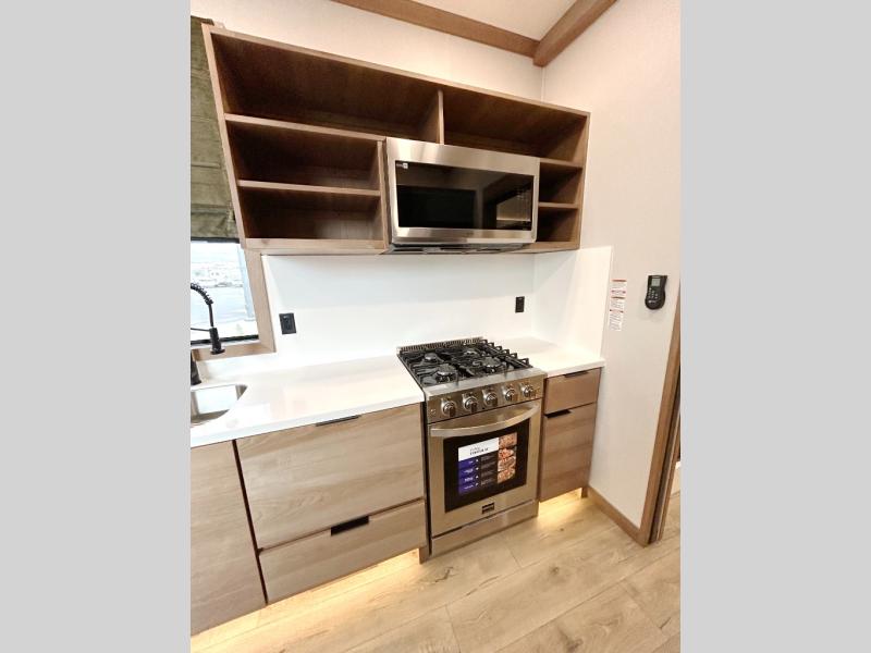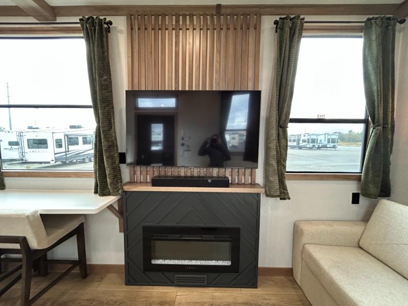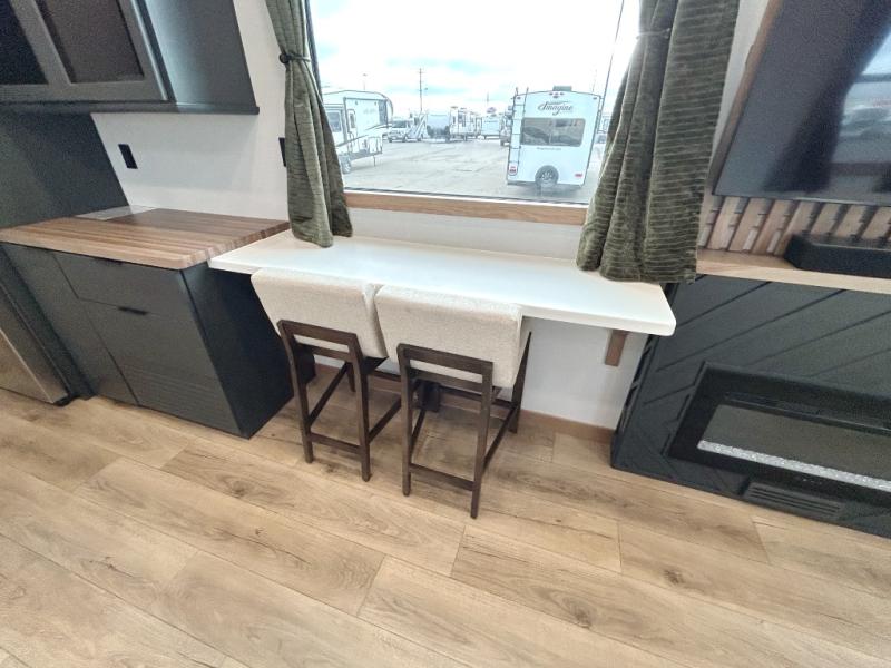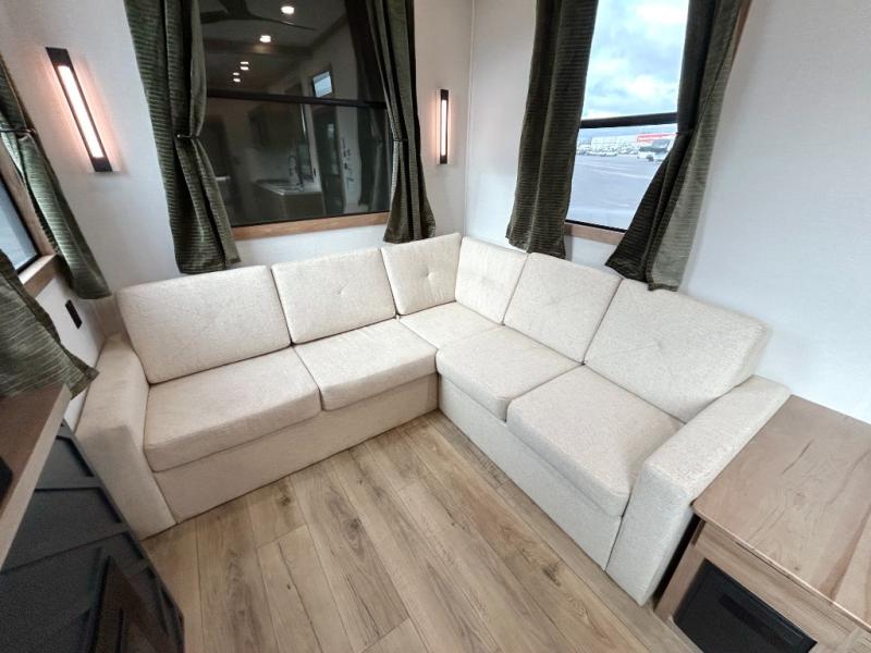 For those who appreciate a destination trailer easier to maintain, this slide-less unit will be perfect for you! Your crew can relax comfortably in the front living area that includes an L-shaped sleeper sofa across from an entertainment center or enjoy the views out the window in front of the countertop with chairs. The full kitchen will allow you to make your best home-cooked meals, and the spacious walk-through bath is easily accessible. You're sure to love the rear bedroom that includes a queen bed with a king bed option, along with dual bedroom closets to keep everything organized!