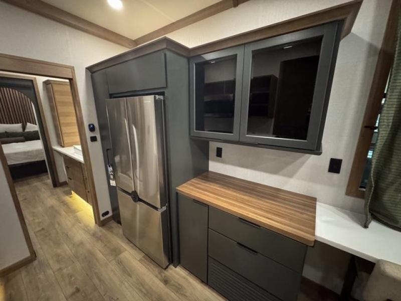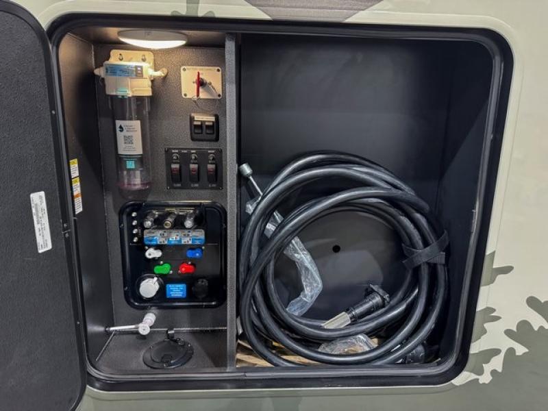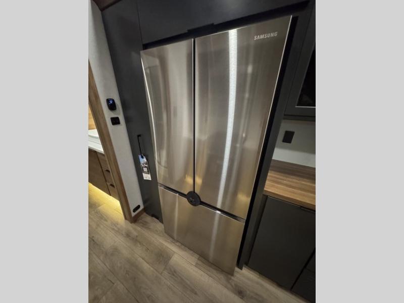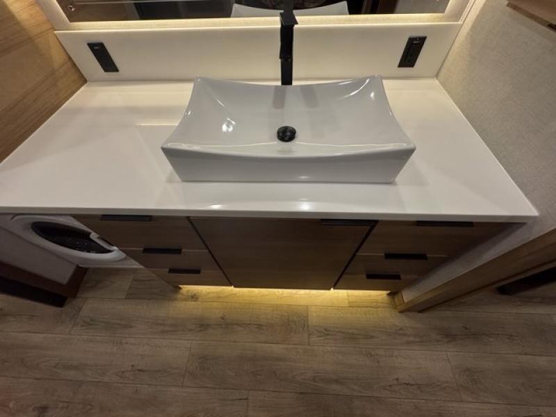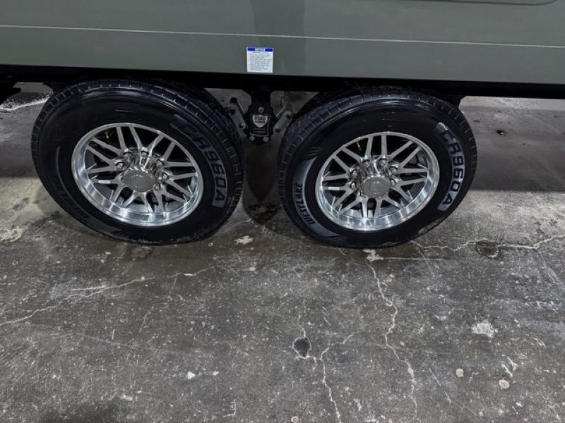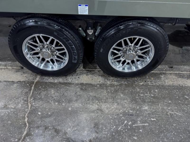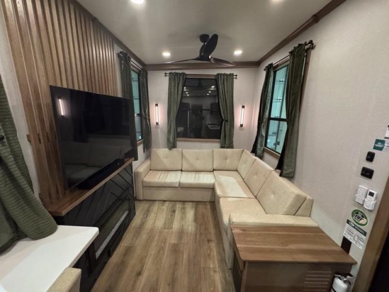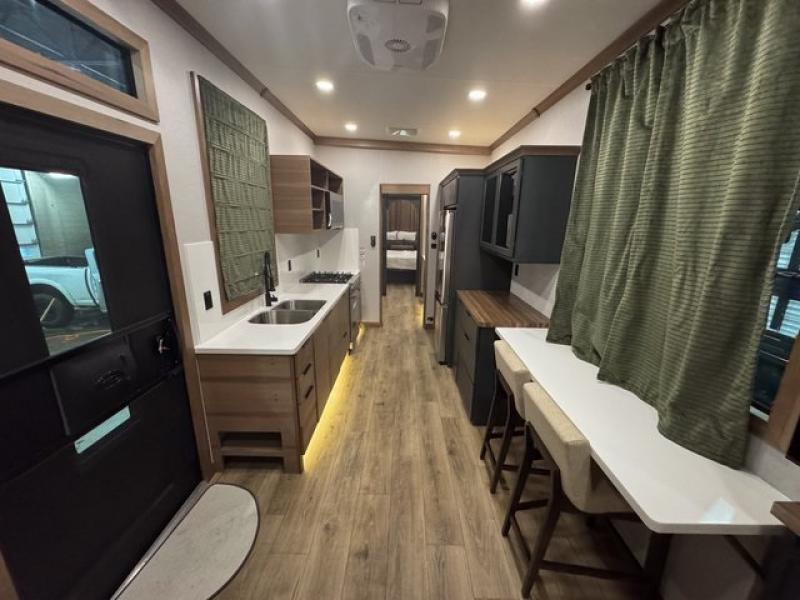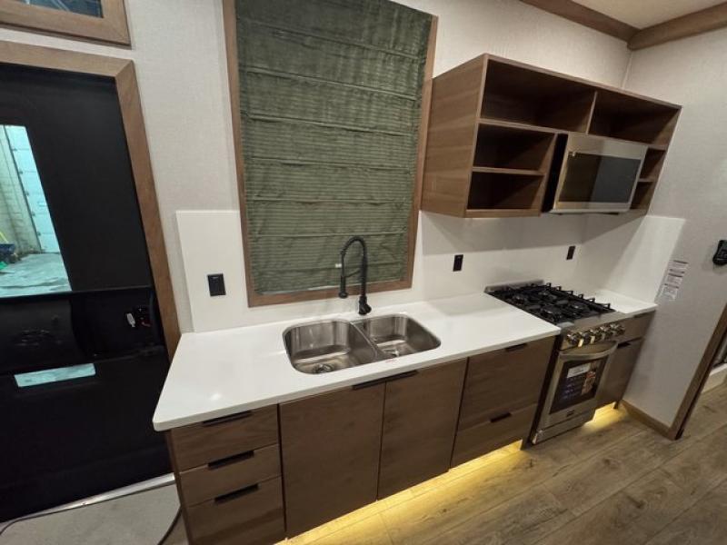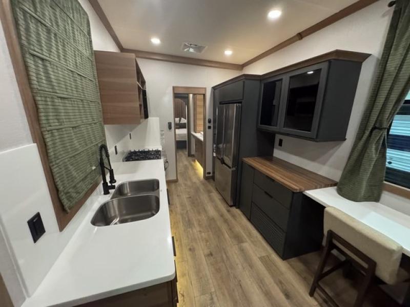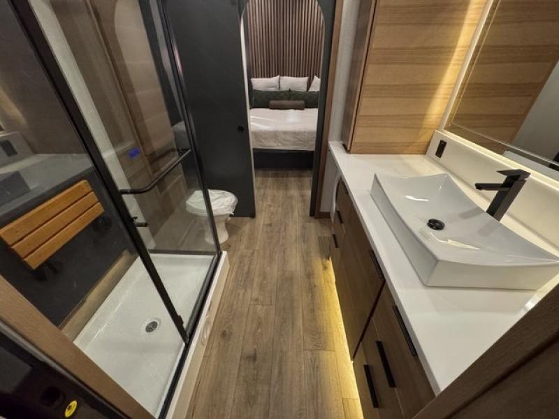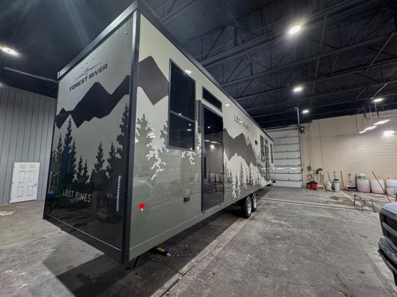 Luxury abounds in the Lost Pines destination trailer by Forest River. Each model features 3" hung wall construction, a rolled fiberglass roof, a thermofoil lined underbelly, and an Azdel gel coat fiberglass exterior wall for added durability. The full-body paint with 4x Clear Coat is sure to turn heads as you travel to your destination, and the LCI Road Armor suspension system will provide a smooth tow. You'll also find dual 40 lb. LP tanks outside, along with a heated full docking station, and MORryde entry steps and Safe-T-Rail. The interior of the Lost Pines is outfitted with luxury vinyl flooring, residential appliances, LED lighting throughout, plus upgraded solid surface countertops and backsplash!