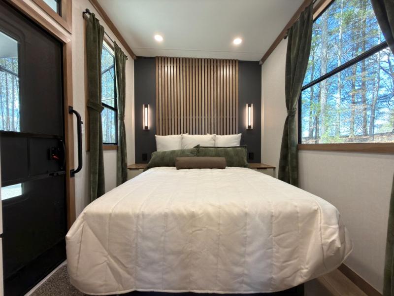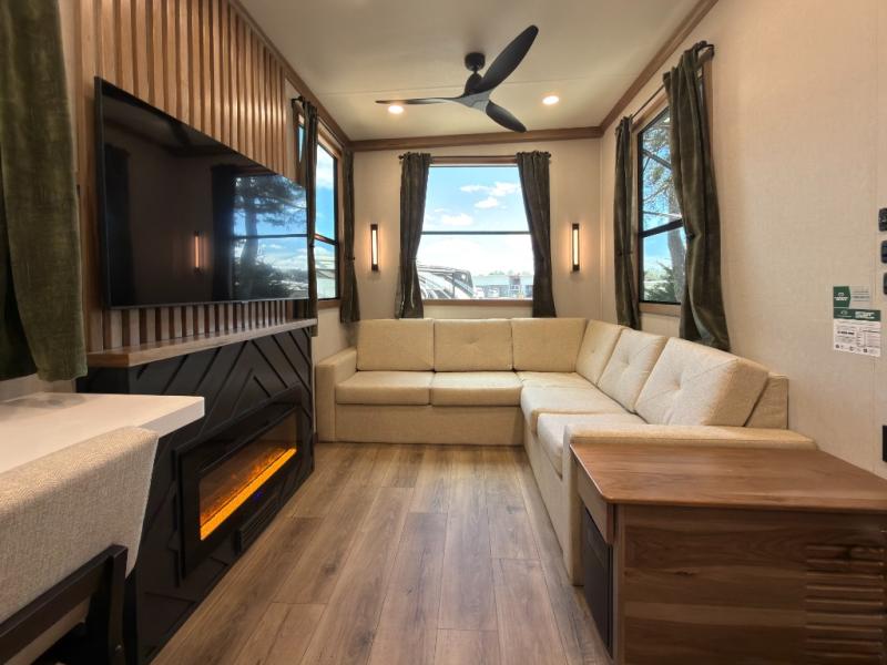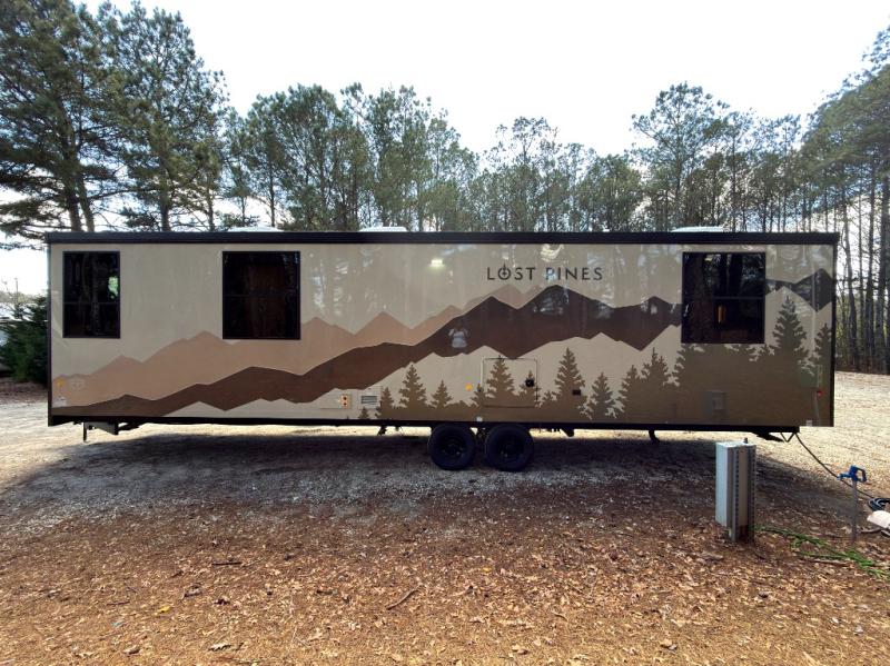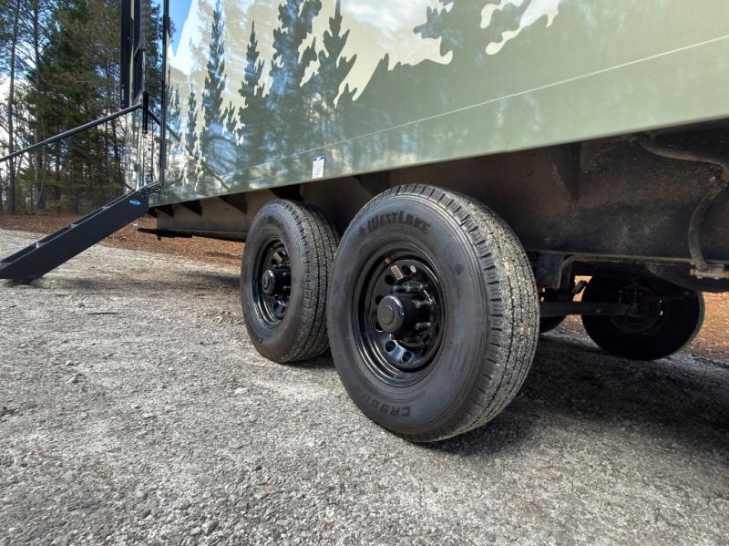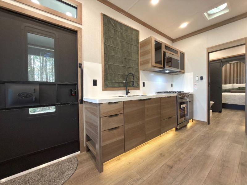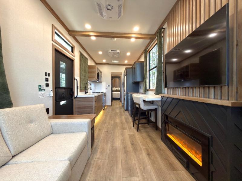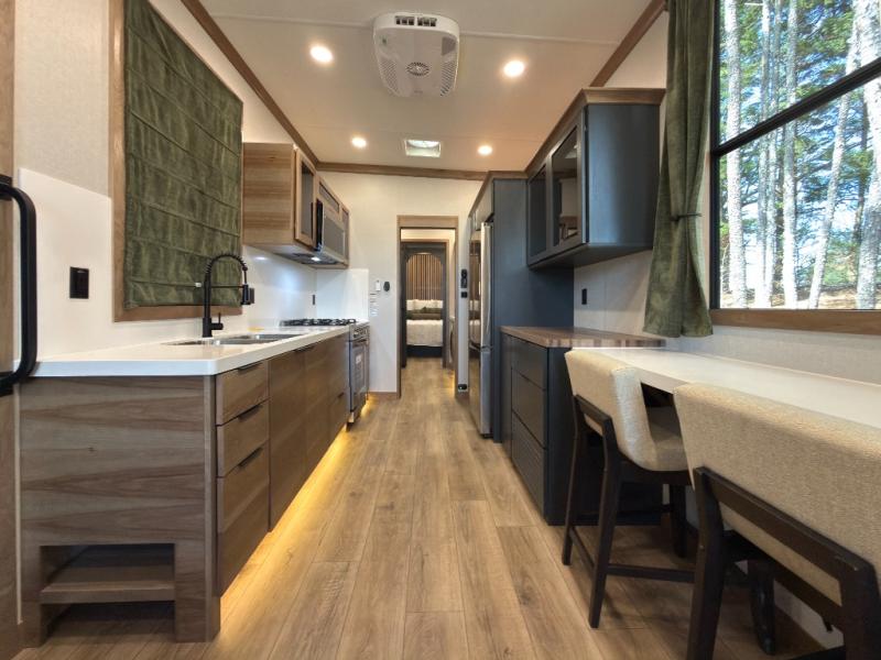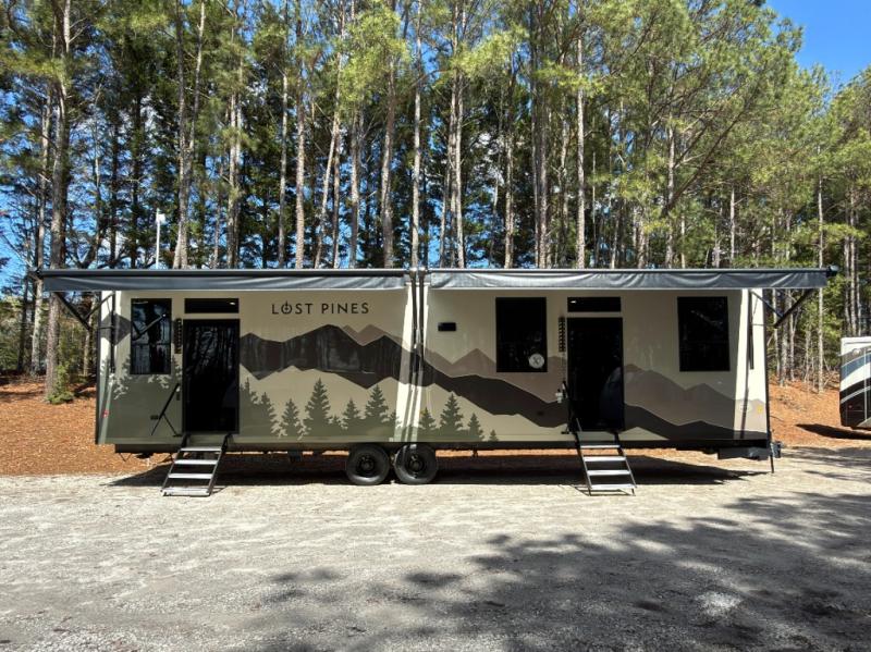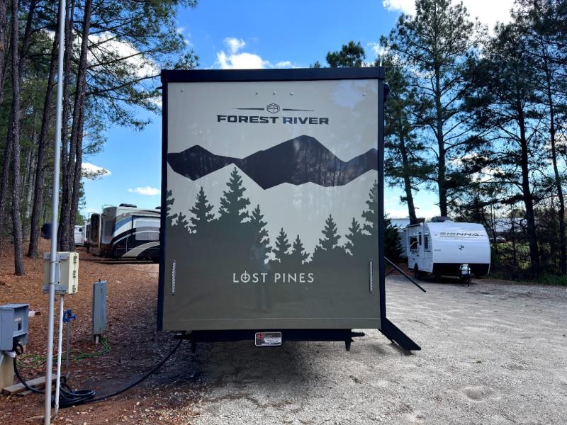Luxury abounds in the Lost Pines destination trailer by Forest River. Each model features 3" hung wall construction, a rolled fiberglass roof, a thermofoil lined underbelly, and an Azdel gel coat fiberglass exterior wall for added durability. The full-body paint with 4x Clear Coat is sure to turn heads as you travel to your destination, and the LCI Road Armor suspension system will provide a smooth tow. You'll also find dual 40 lb. LP tanks outside, along with a heated full docking station, and MORryde entry steps and Safe-T-Rail. The interior of the Lost Pines is outfitted with luxury vinyl flooring, residential appliances, LED lighting throughout, plus upgraded solid surface countertops and backsplash!